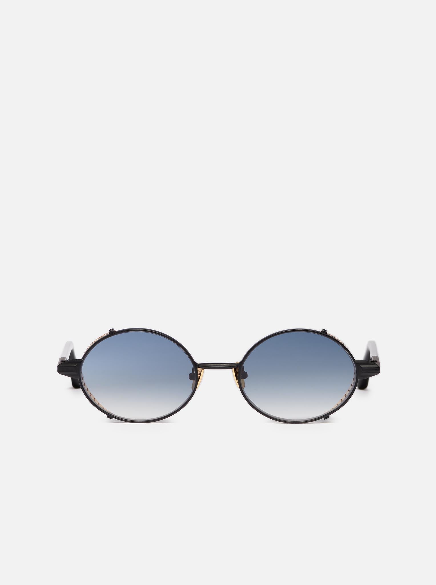 Oval-shaped frame combining metal and acetate. Featuring a reinforced simple bridge, wide textured temples.