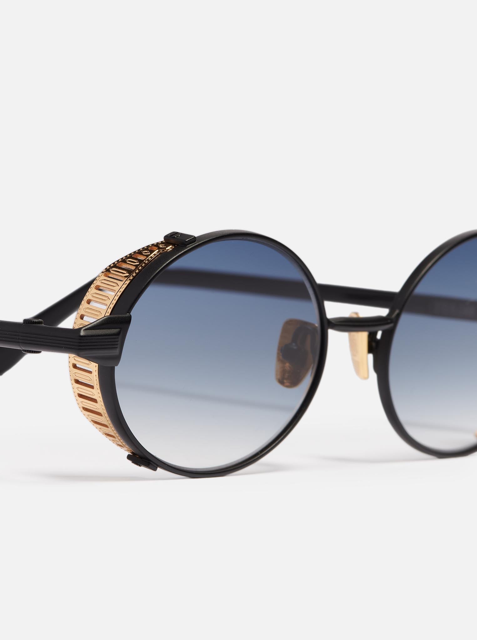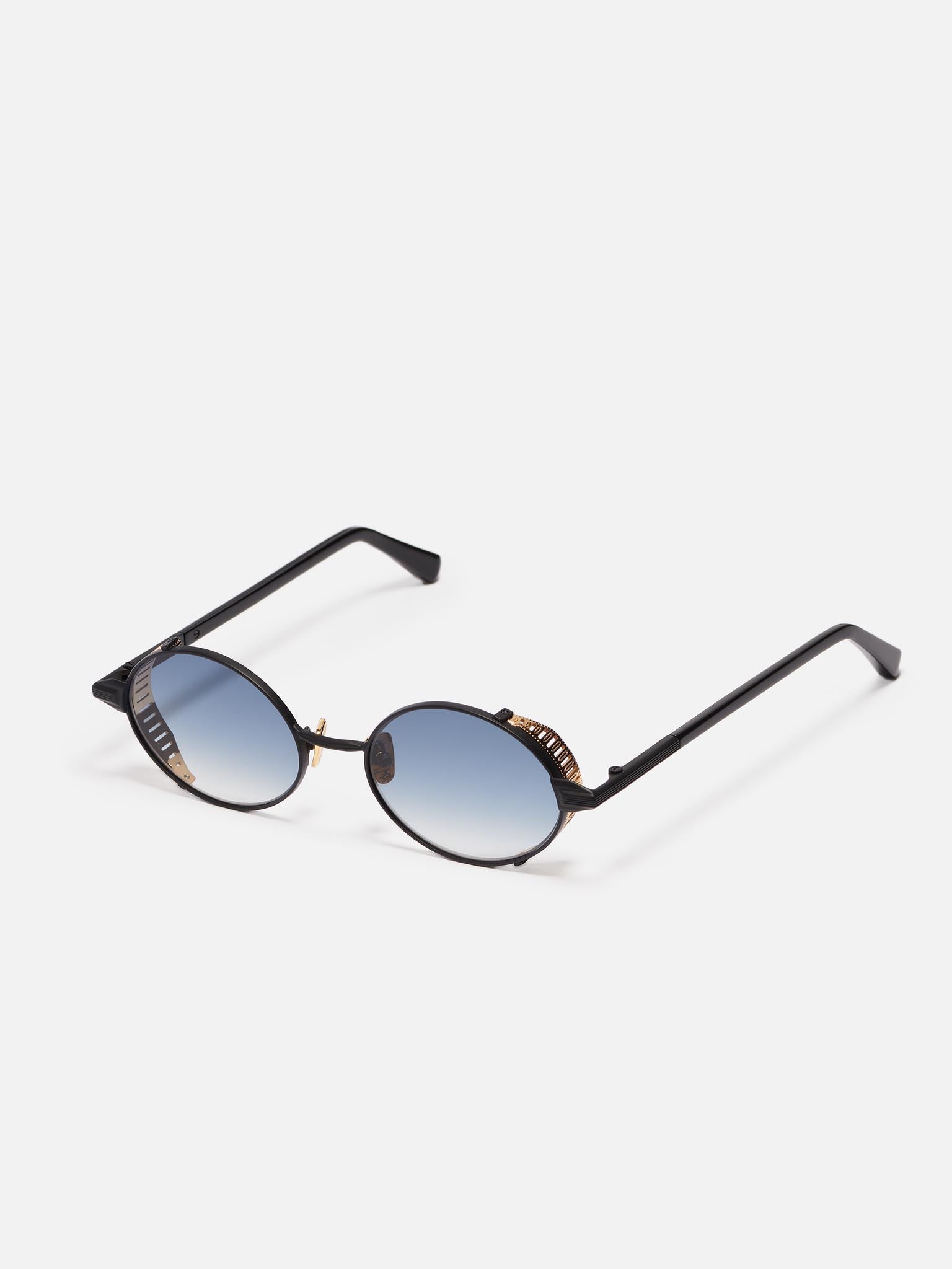 The structure is made of black carbon-effect stainless steel. The side shields and nose pads are colored in yellow gold. The temple tips are crafted from black acetate.