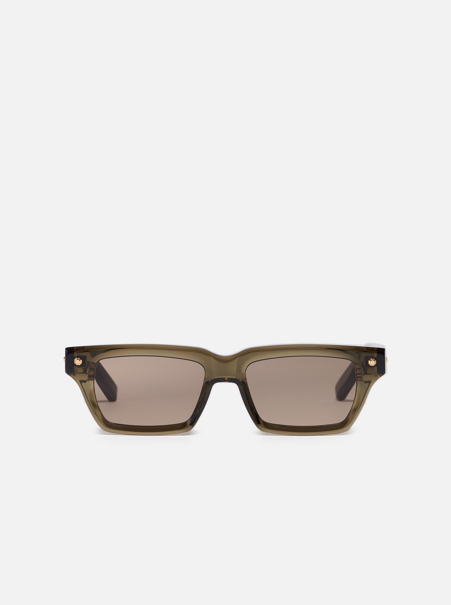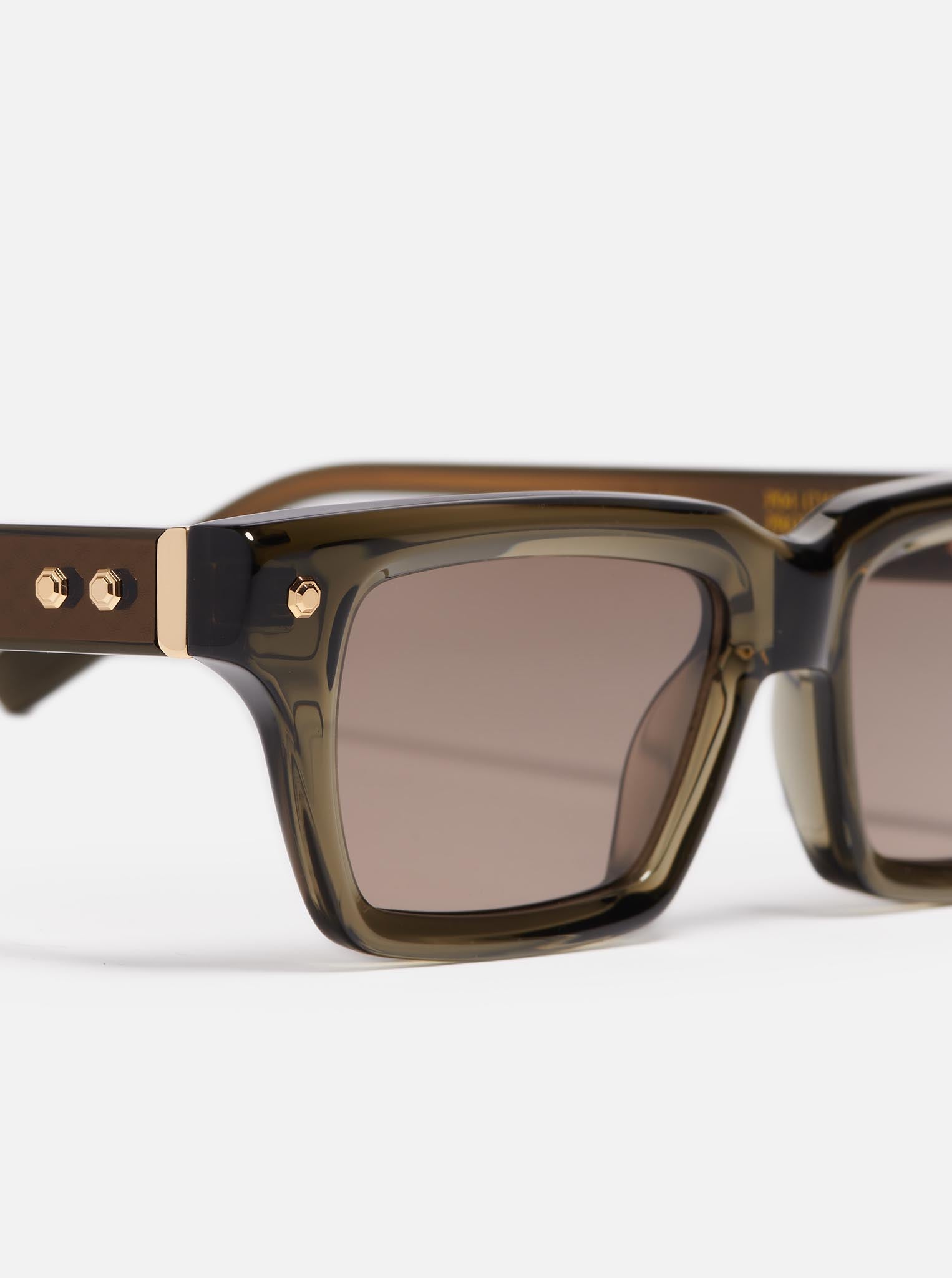 Olive translucid acetate. Corewire, decorative elements in yellow gold colored stainless steel. Solid brown CR39 lenses with an anti-reflective coating on the inner surface.