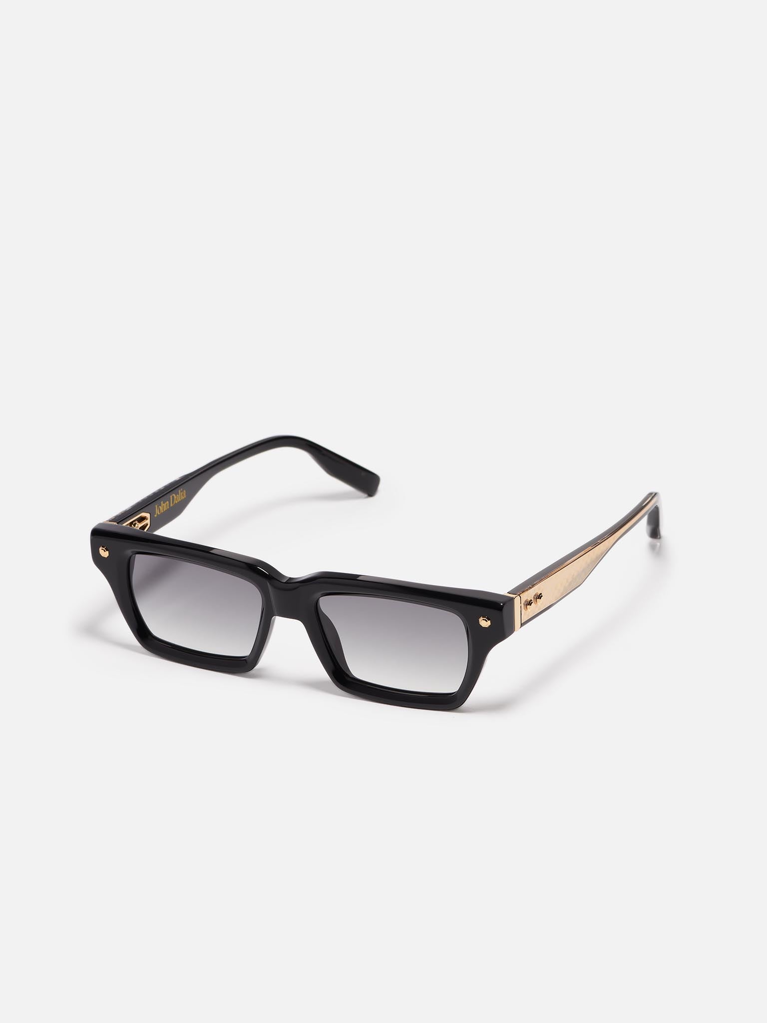 Shiny black acetate. Corewire, decorative elements in yellow gold colored stainless steel.