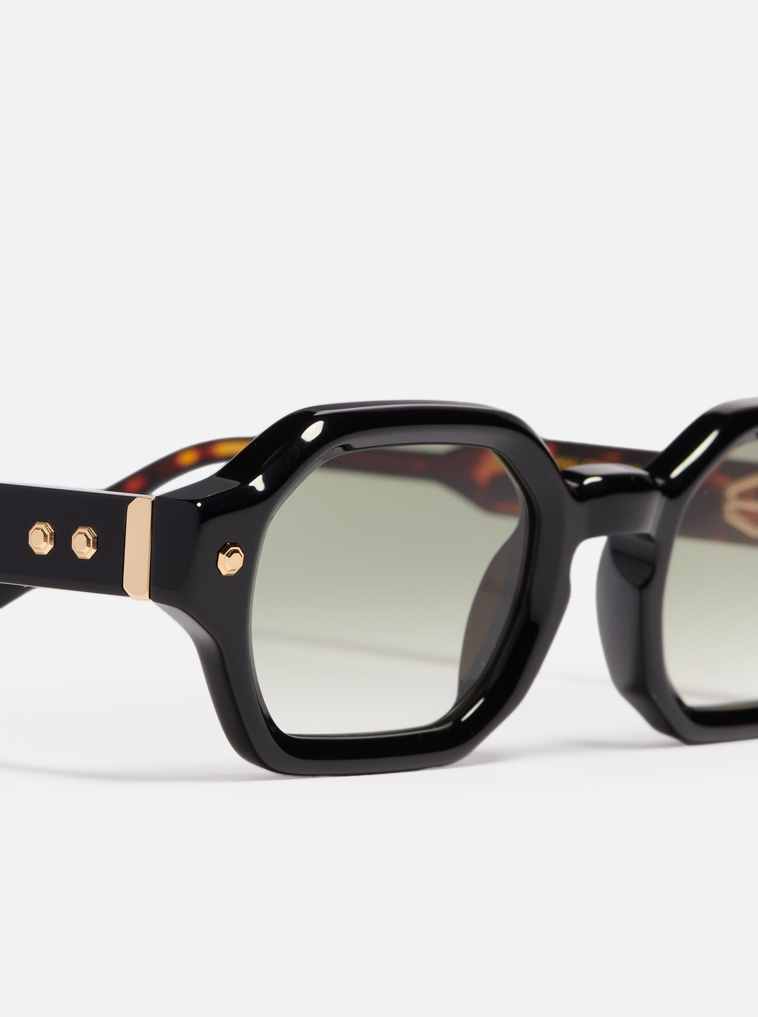Shiny black acetate. Corewire, decorative elements in yellow gold colored stainless steel.