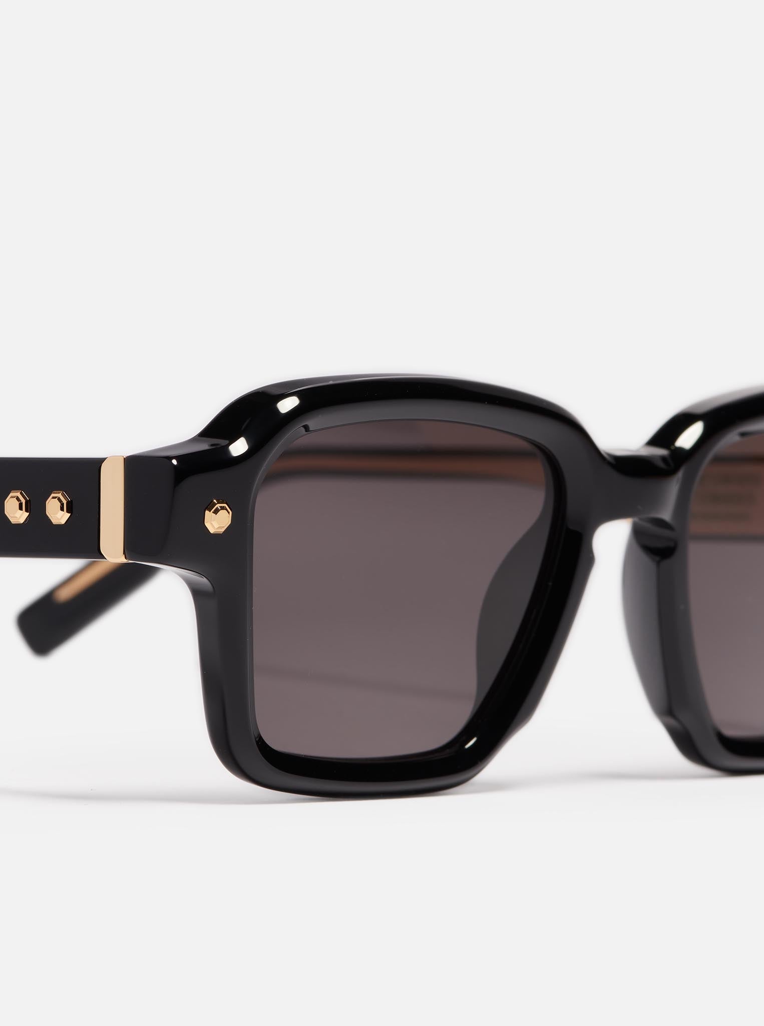 Shiny black acetate. Corewire, decorative elements in yellow gold colored stainless steel. Grey gradient CR39 lenses with an anti-reflective coating on the inner surface.