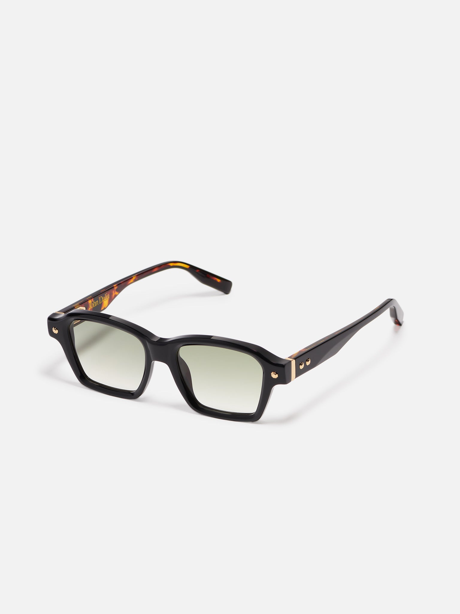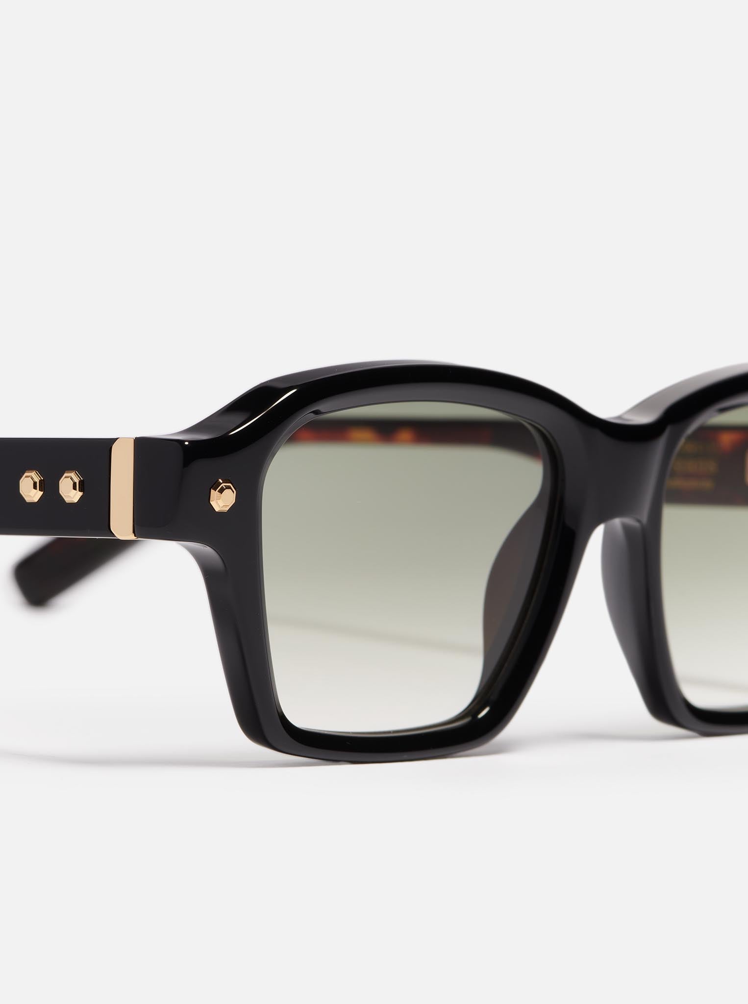 Shiny black acetate. Corewire, decorative elements in yellow gold colored stainless steel.