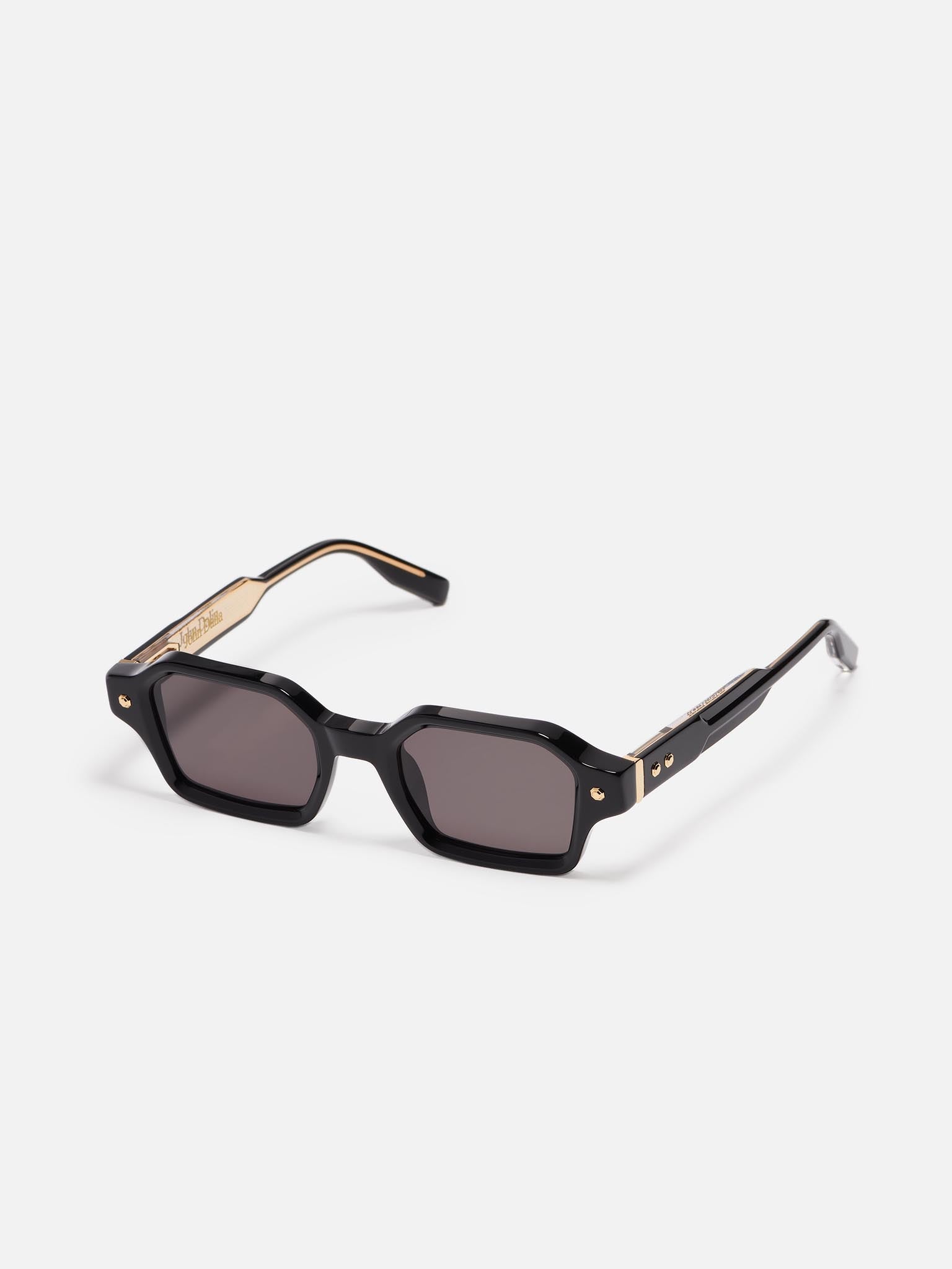 Shiny black acetate. Corewire, decorative elements in yellow gold colored stainless steel.