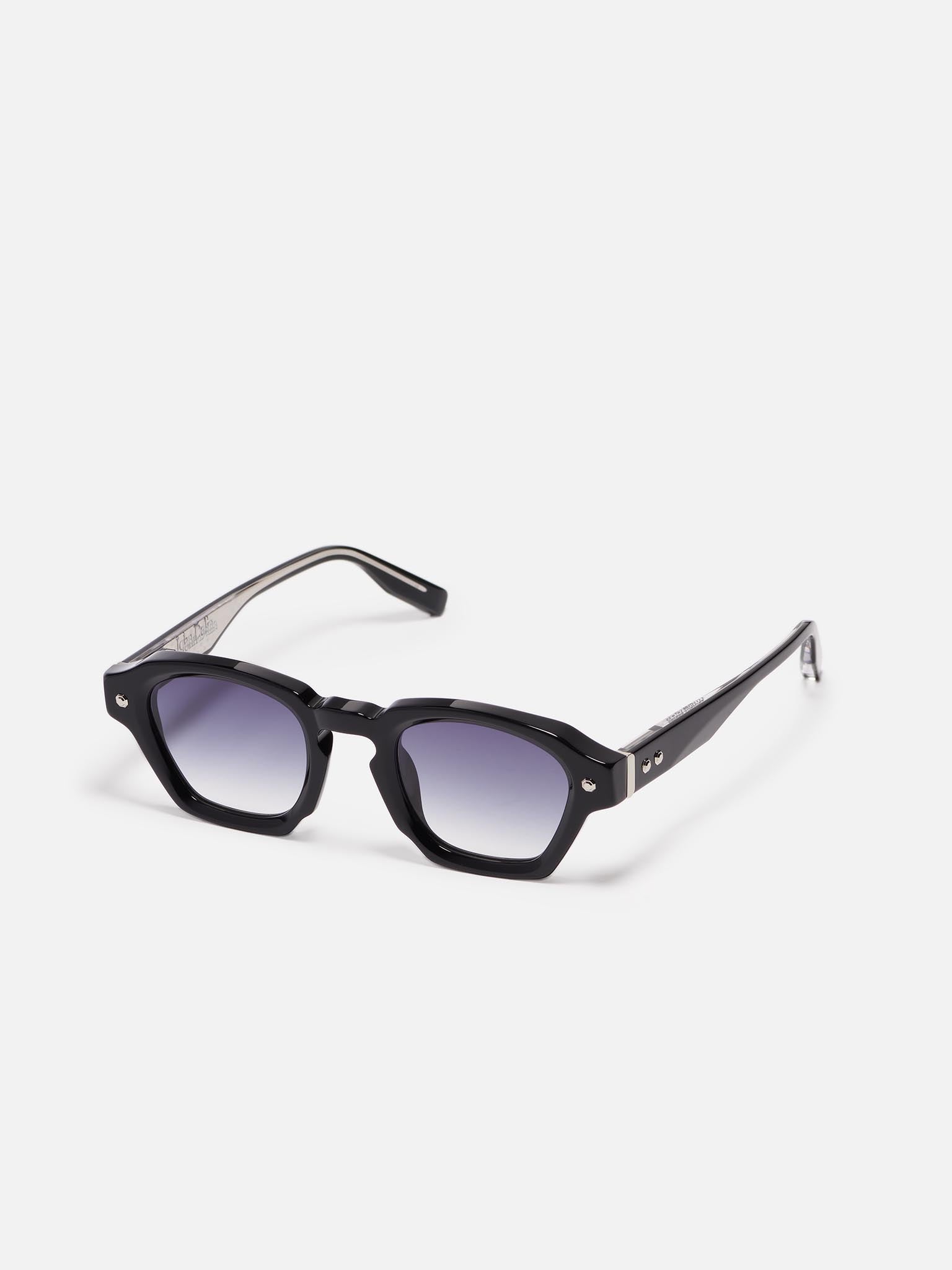 Shiny black acetate. Corewire, decorative elements in ruthenium colored stainless steel.