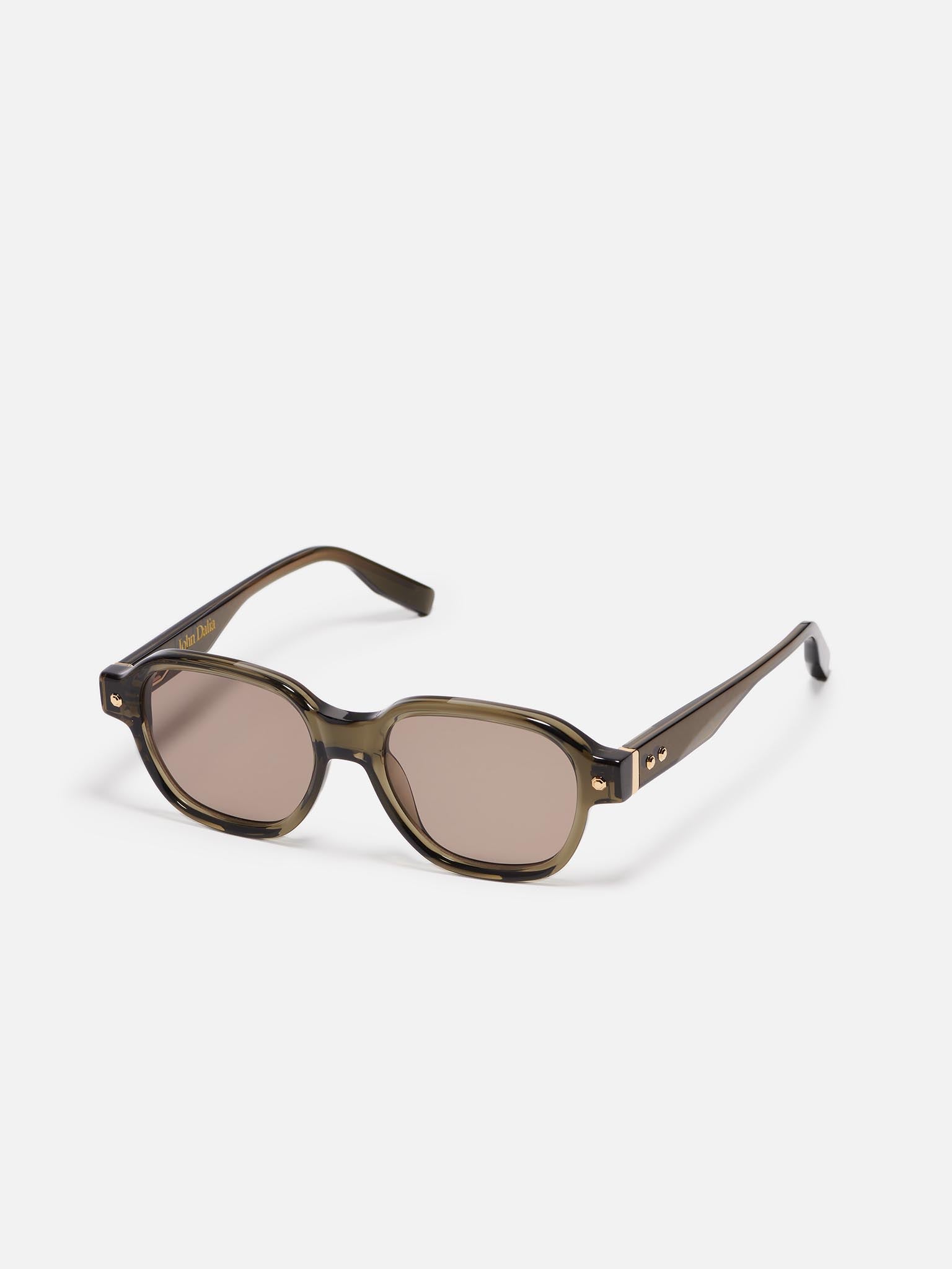 Olive translucid acetate. Corewire, decorative elements in yellow gold colored stainless steel.