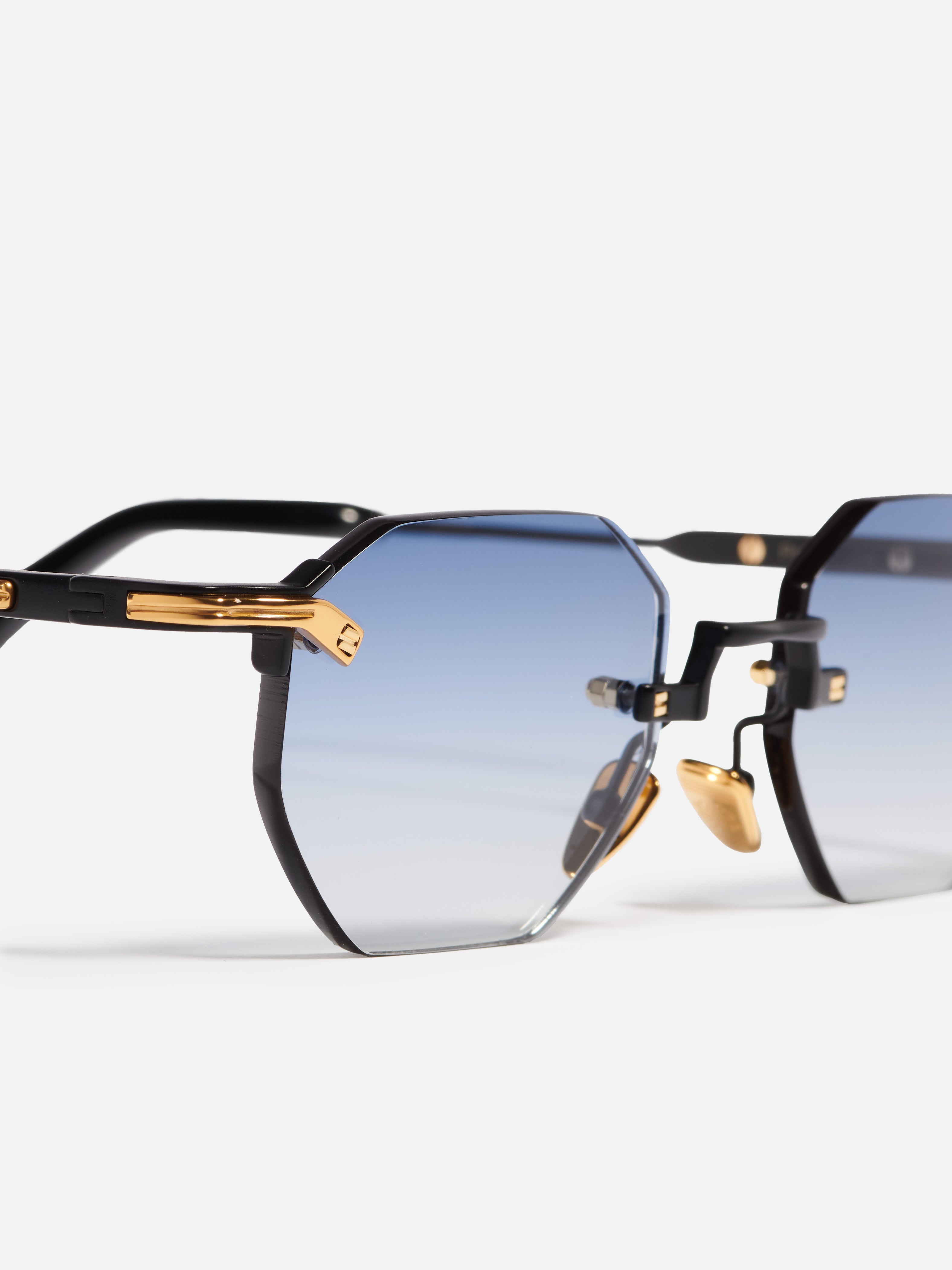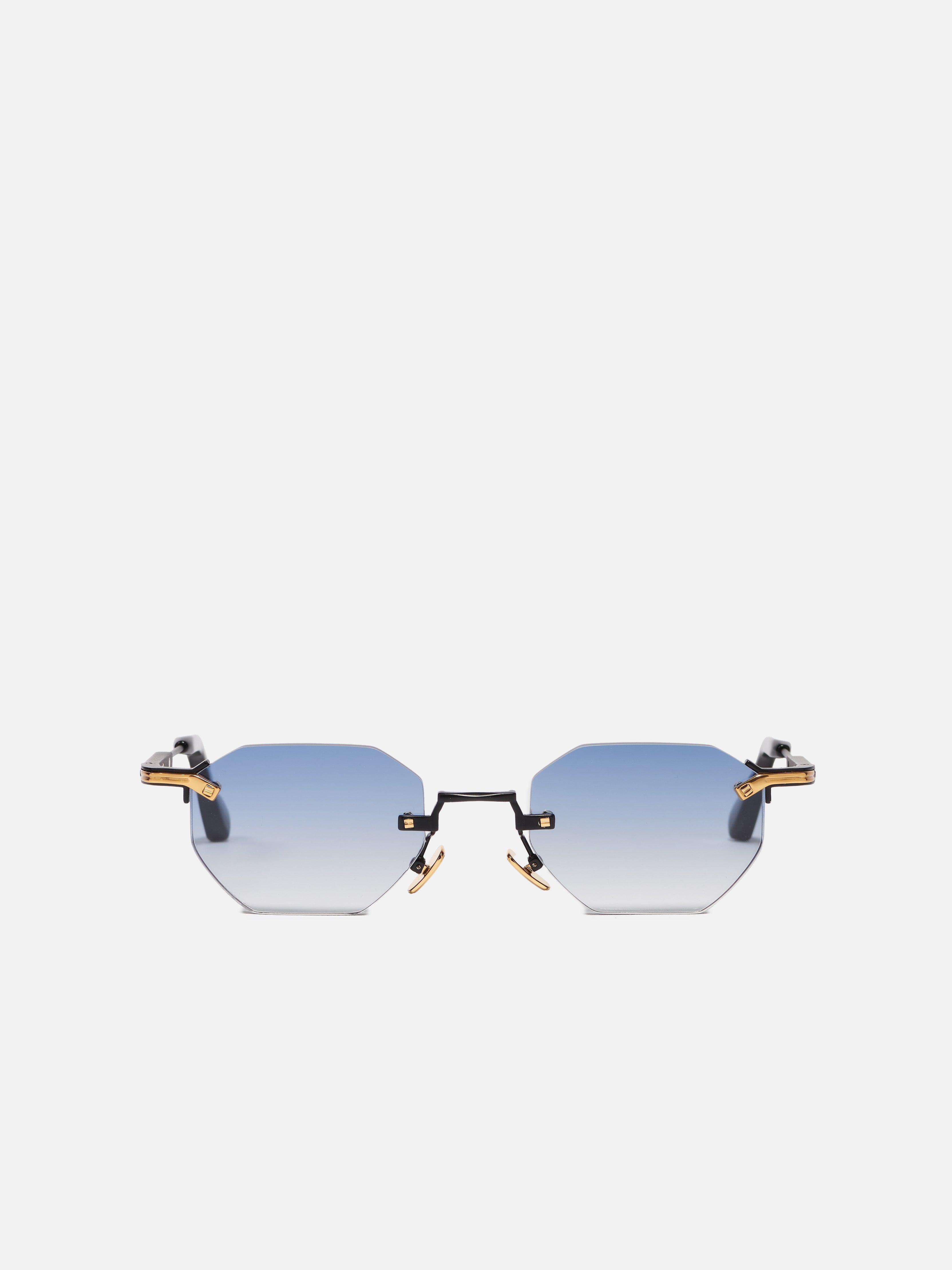 Unisex rimless frame in a hexagonal shape, featuring decorative titanium inserts on the temples and end pieces. The frame is equipped with titanium nose pads and thick acetate temple tips.