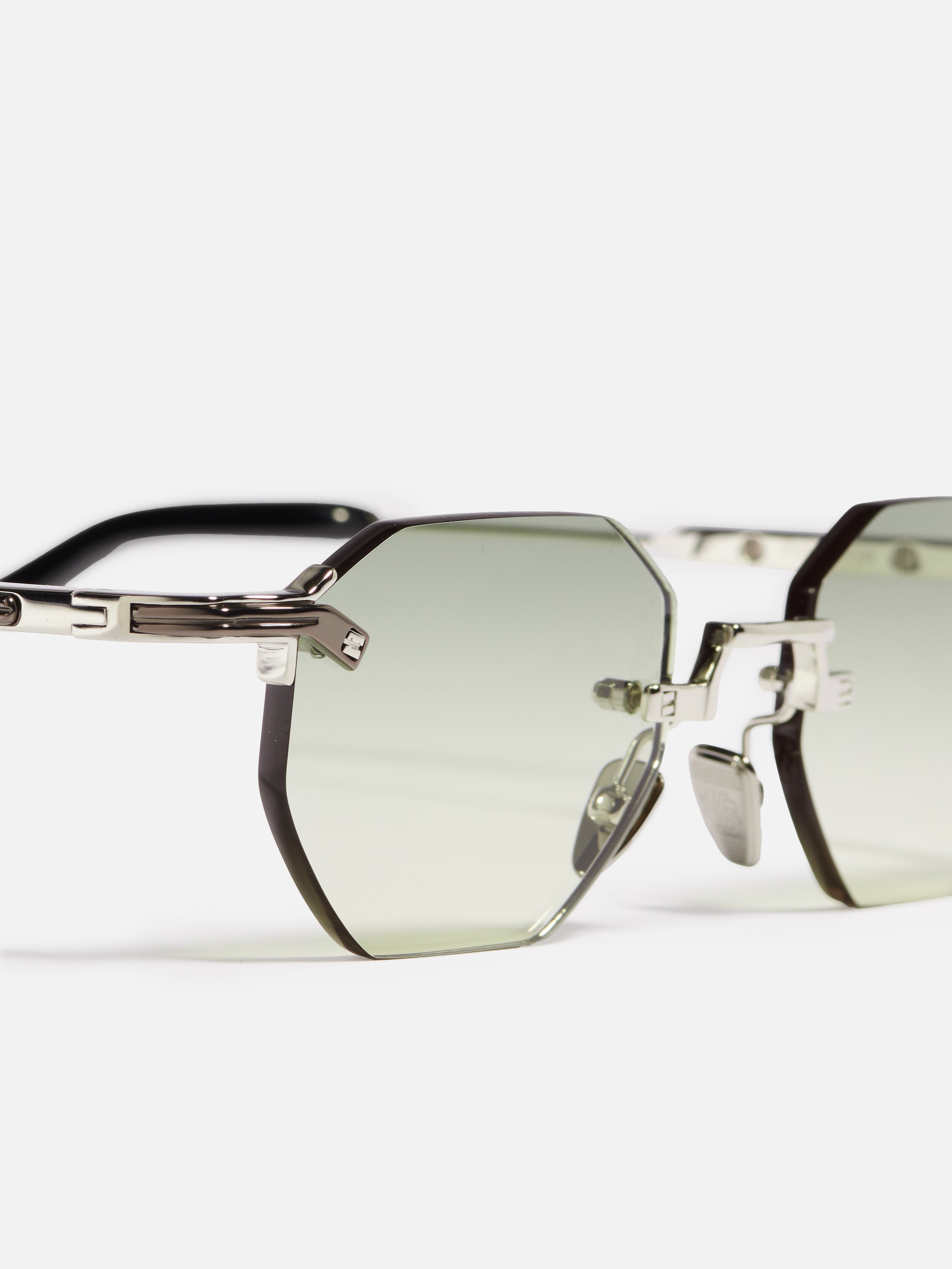 Unisex rimless frame in a hexagonal shape, featuring decorative titanium inserts on the temples and end pieces. The frame is equipped with titanium nose pads and thick acetate temple tips.