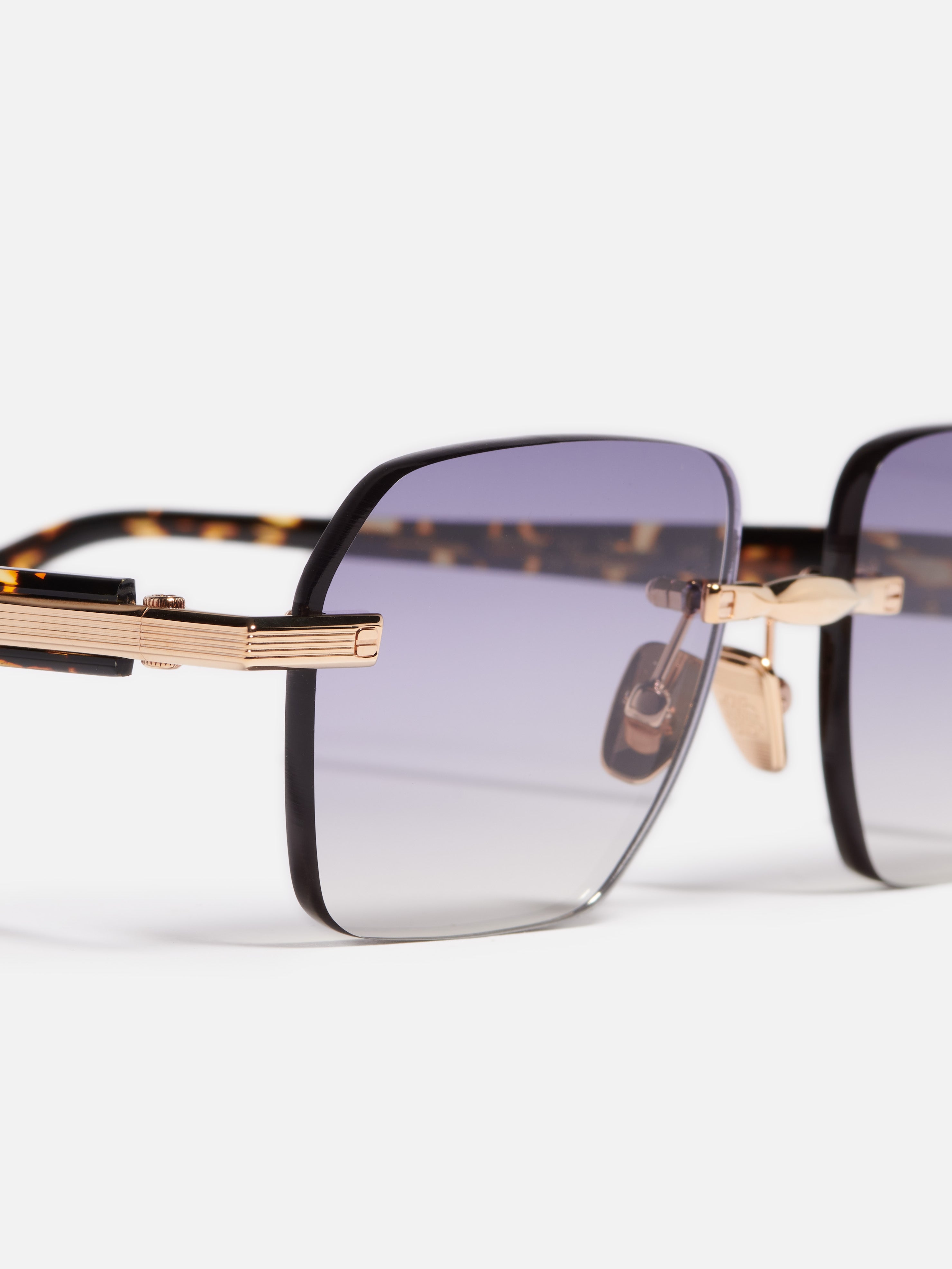 Unisex rimless frame in a rectangular shape. The frame is equipped with a wide, grooved bridge and end pieces. The glasses feature extended acetate temple tips.