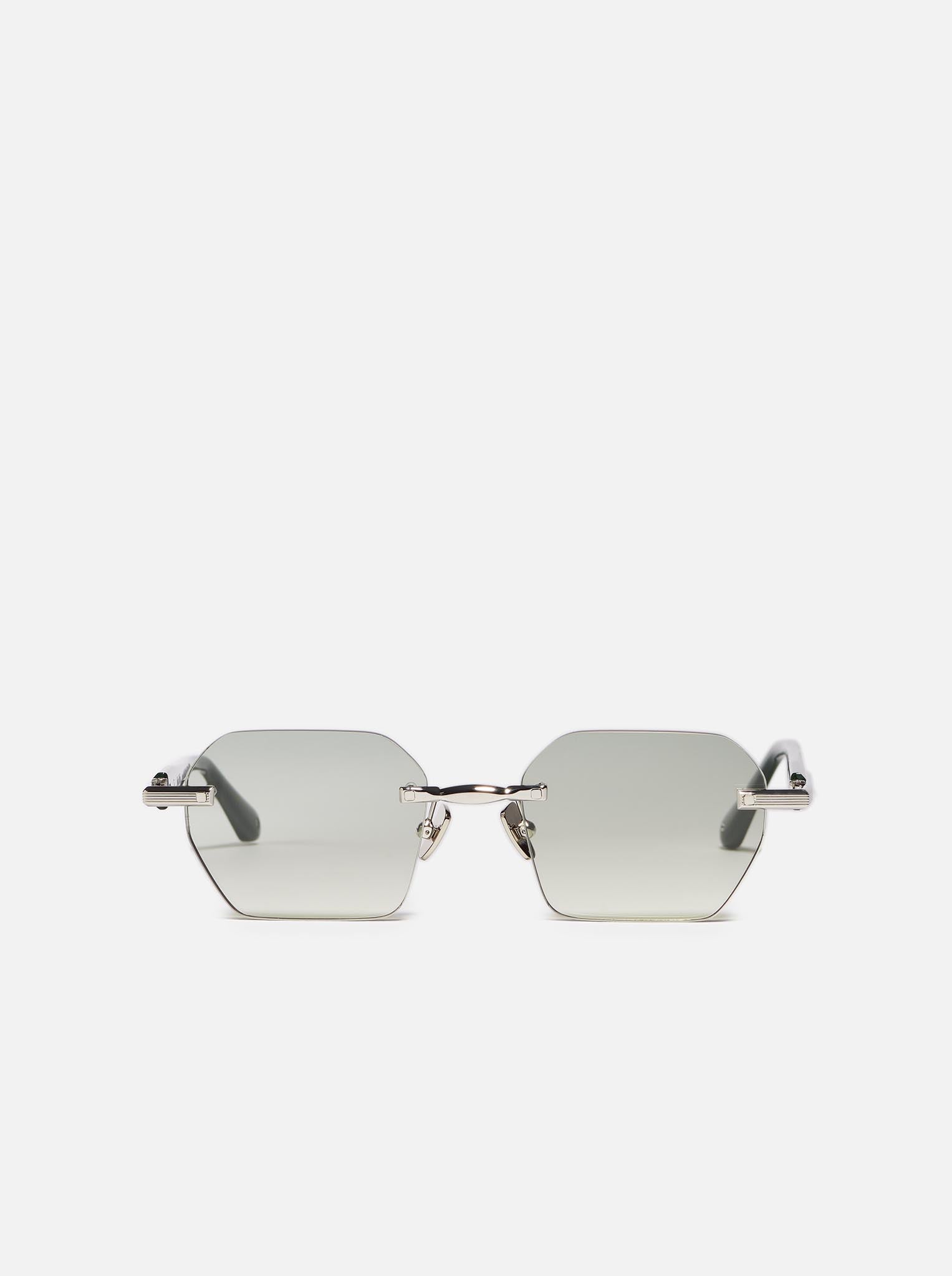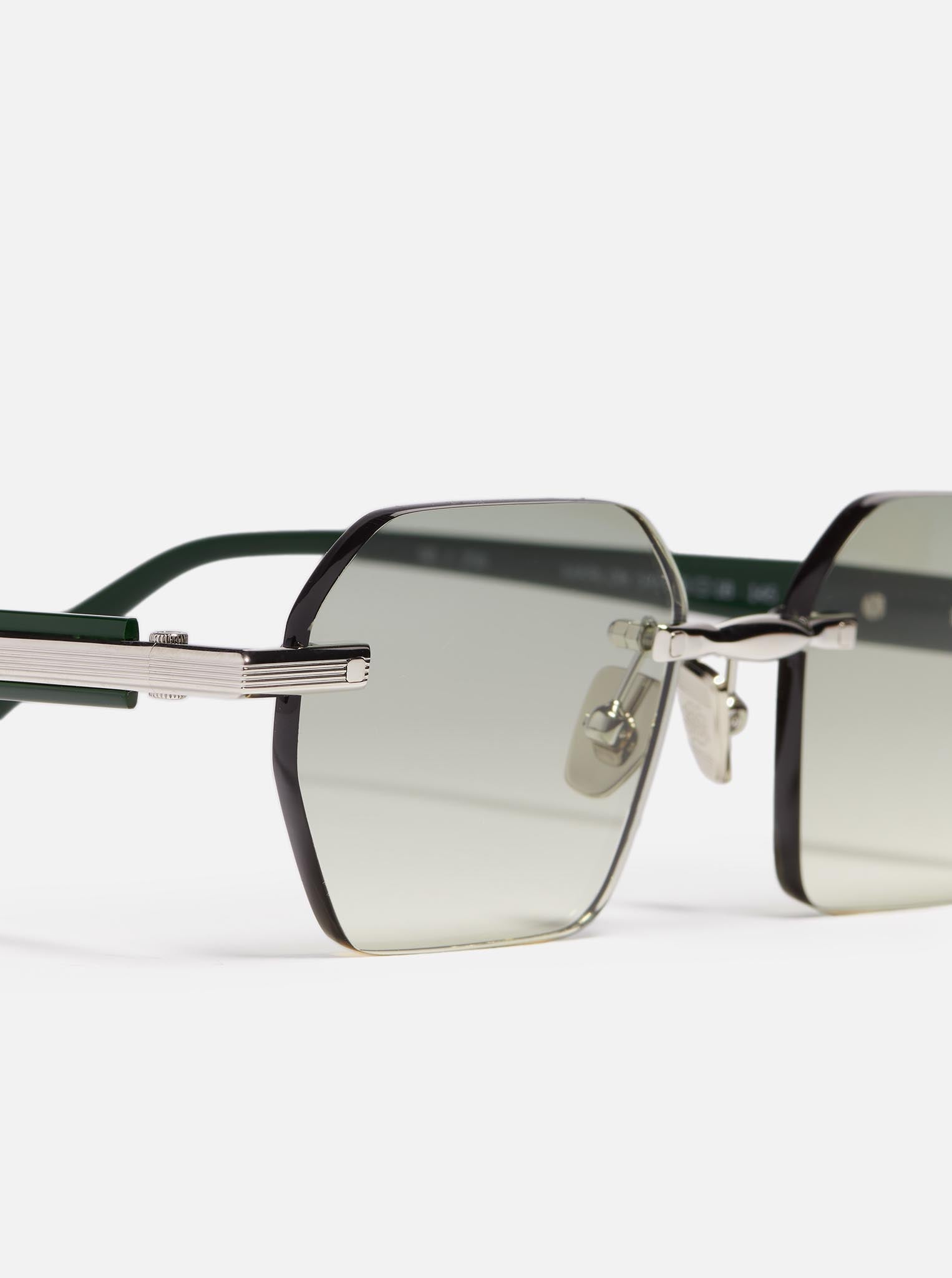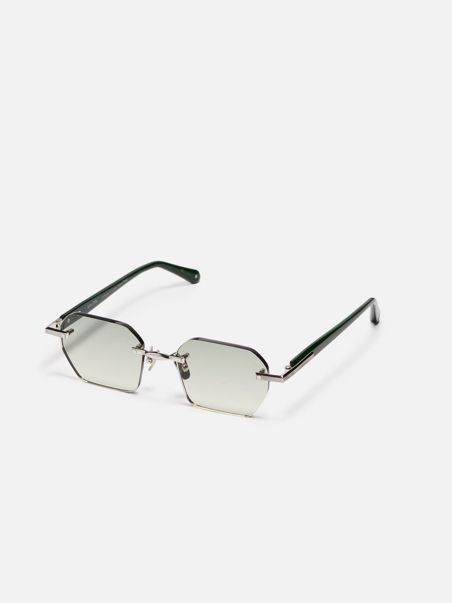 The structure is crafted from platinum-plated stainless steel (3µ). The temple tips are made of dark green acetate, while the nose pads come in a matching platinum color.