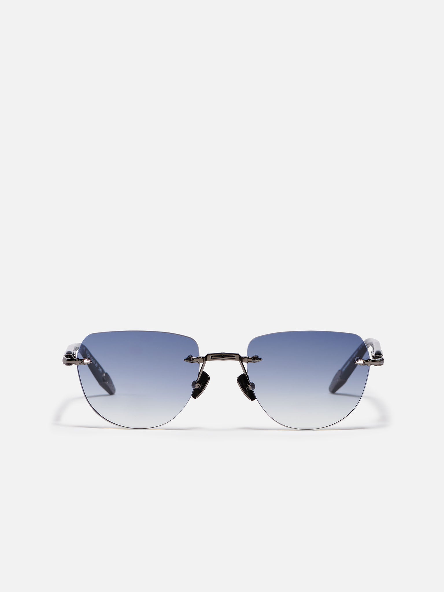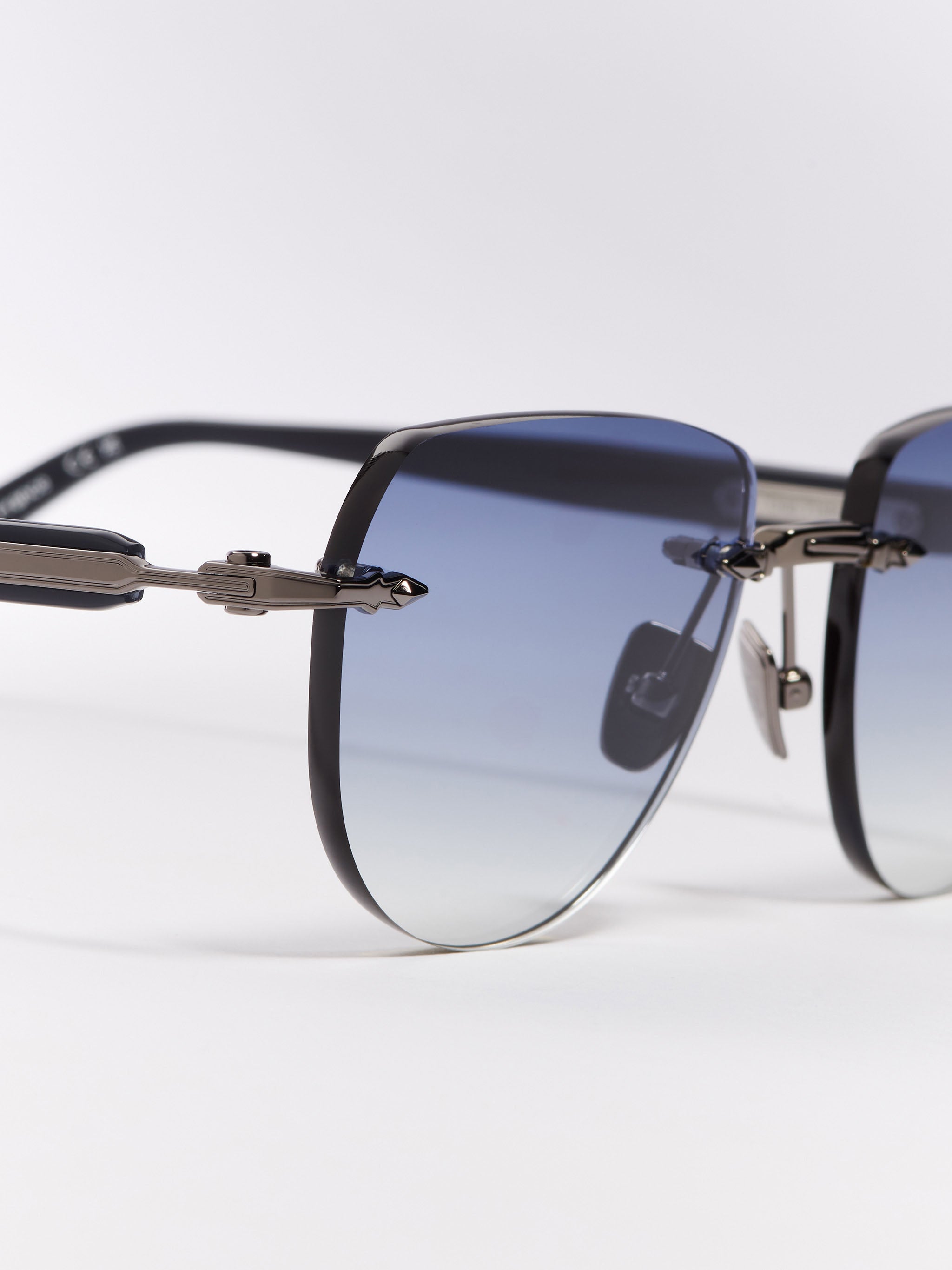 The temple structure extends into a titanium-colored metal arm, offering a refined contrast, and ends with acetate temple tips in a X tone for comfort and balance.