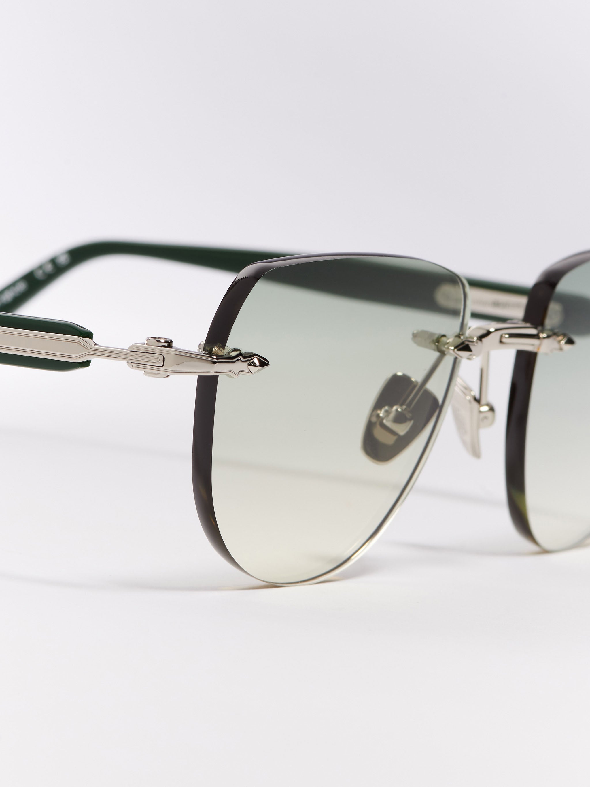 The temple structure extends into a titanium-colored metal arm, offering a refined contrast, and ends with acetate temple tips in a dark green tone for comfort and balance.