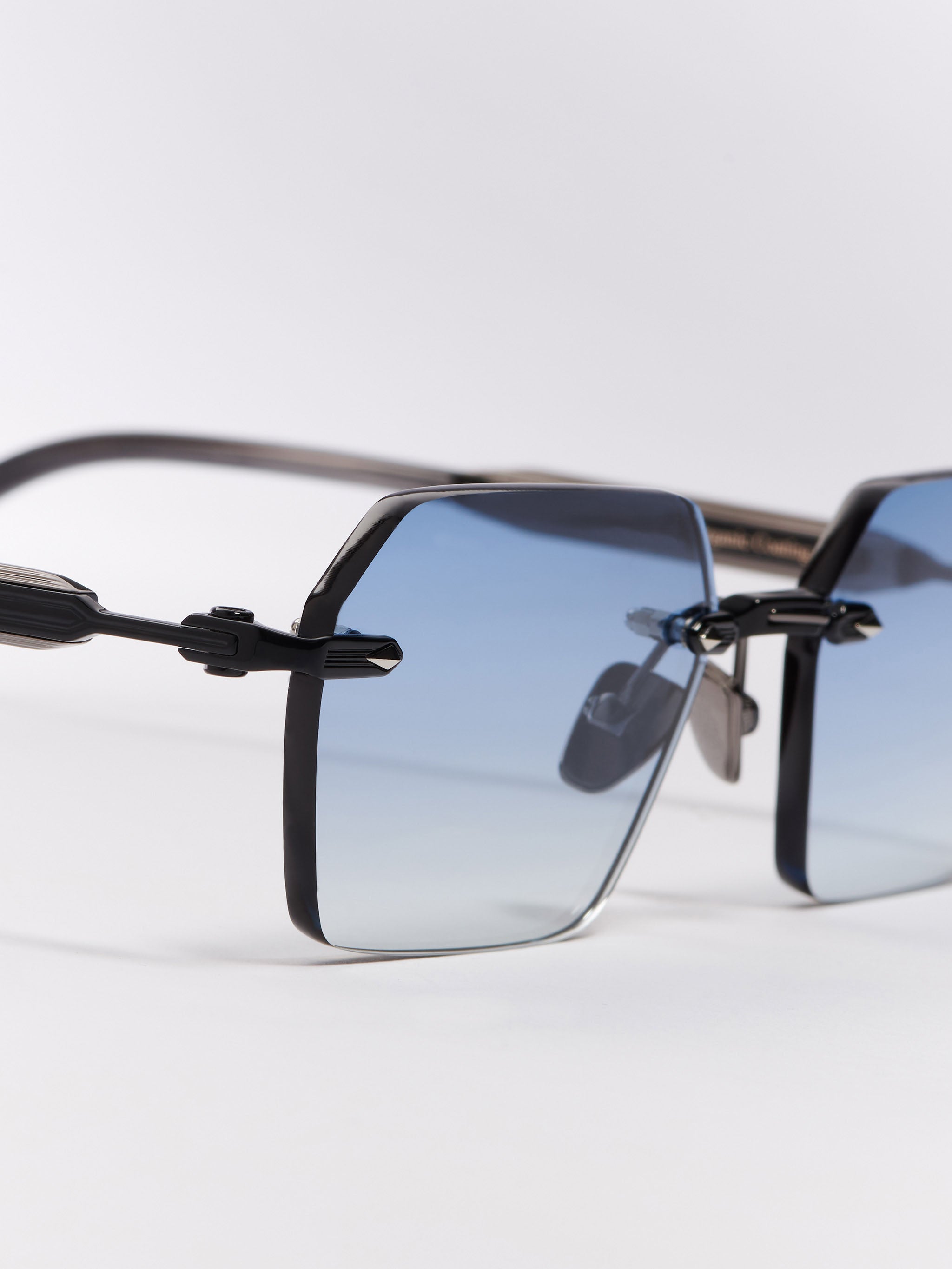 The temple structure extends into a titanium-colored metal arm, offering a refined contrast, and ends with acetate temple tips in a shiny black tone for comfort and balance.