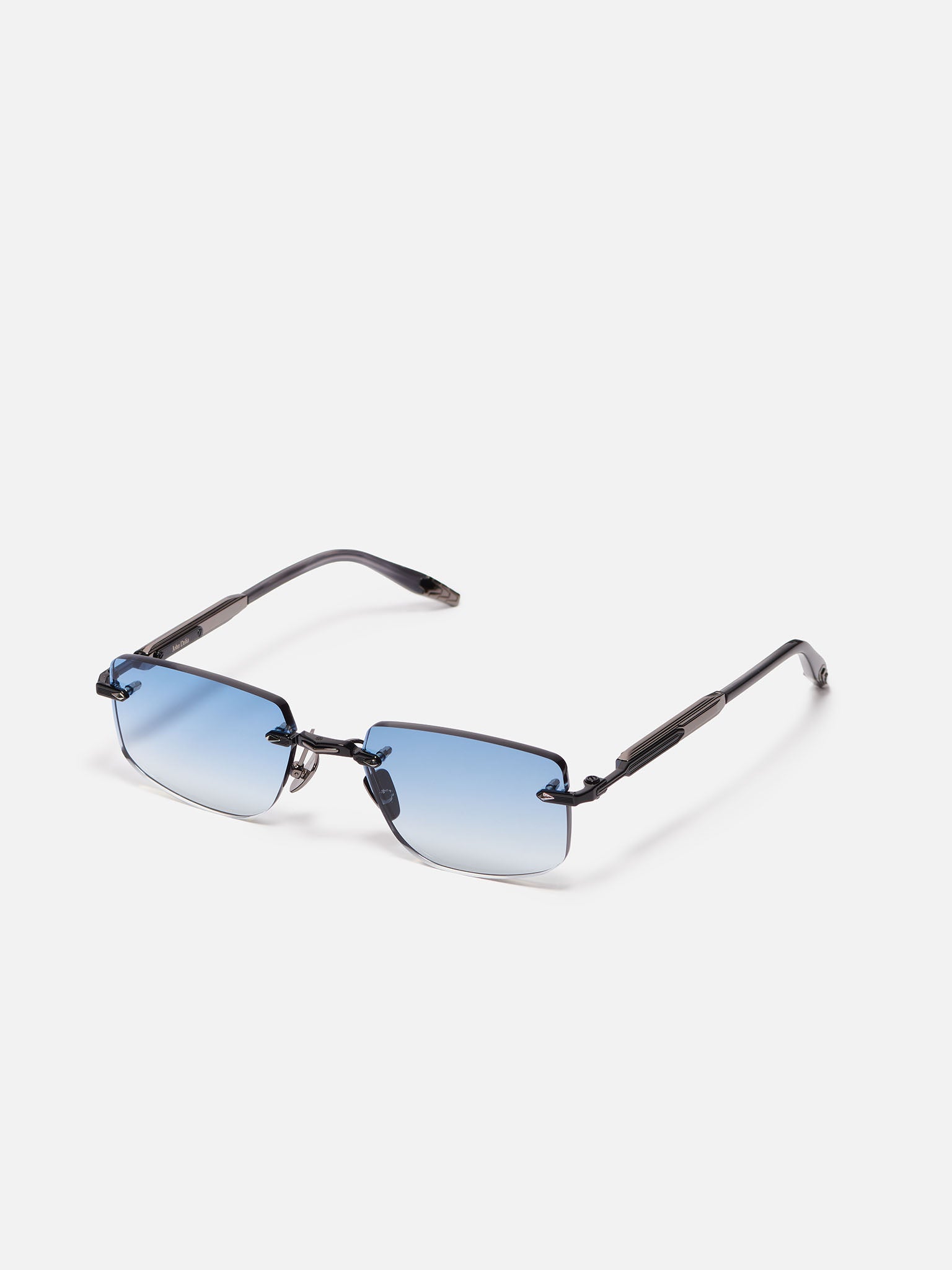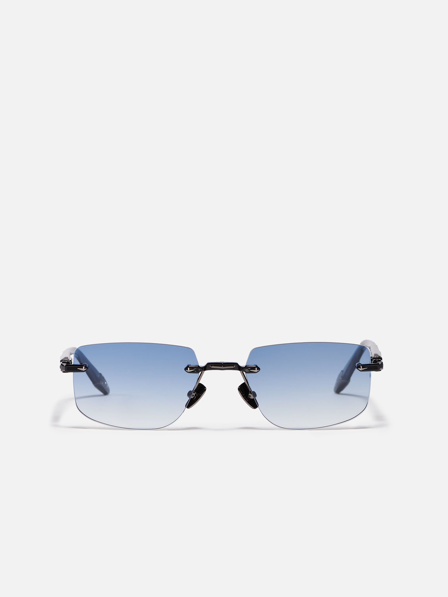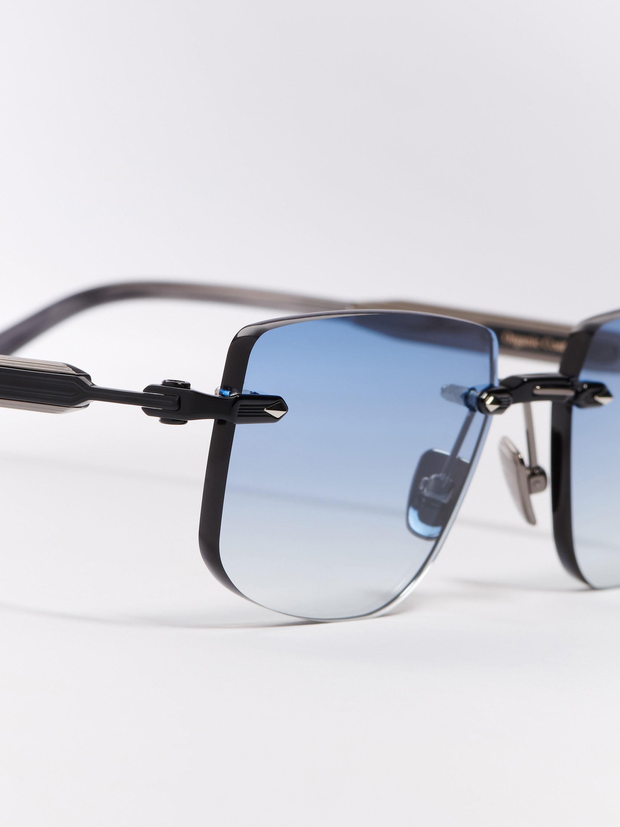 The temple structure extends into a titanium-colored metal arm, offering a refined contrast, and ends with acetate temple tips in a matte black tone for comfort and balance.
