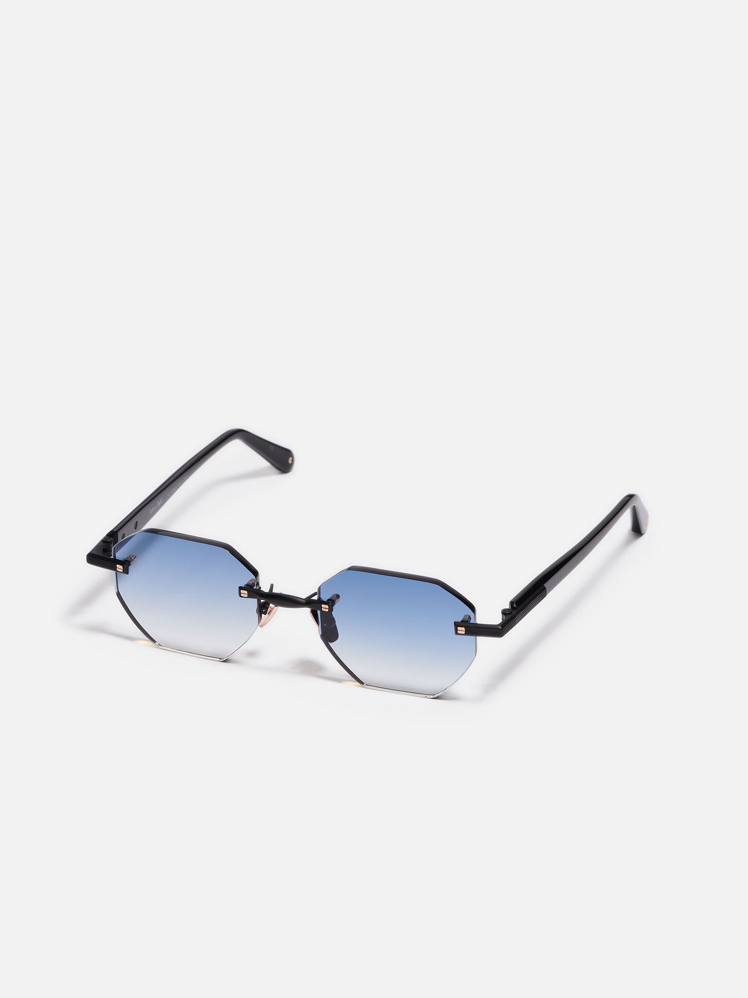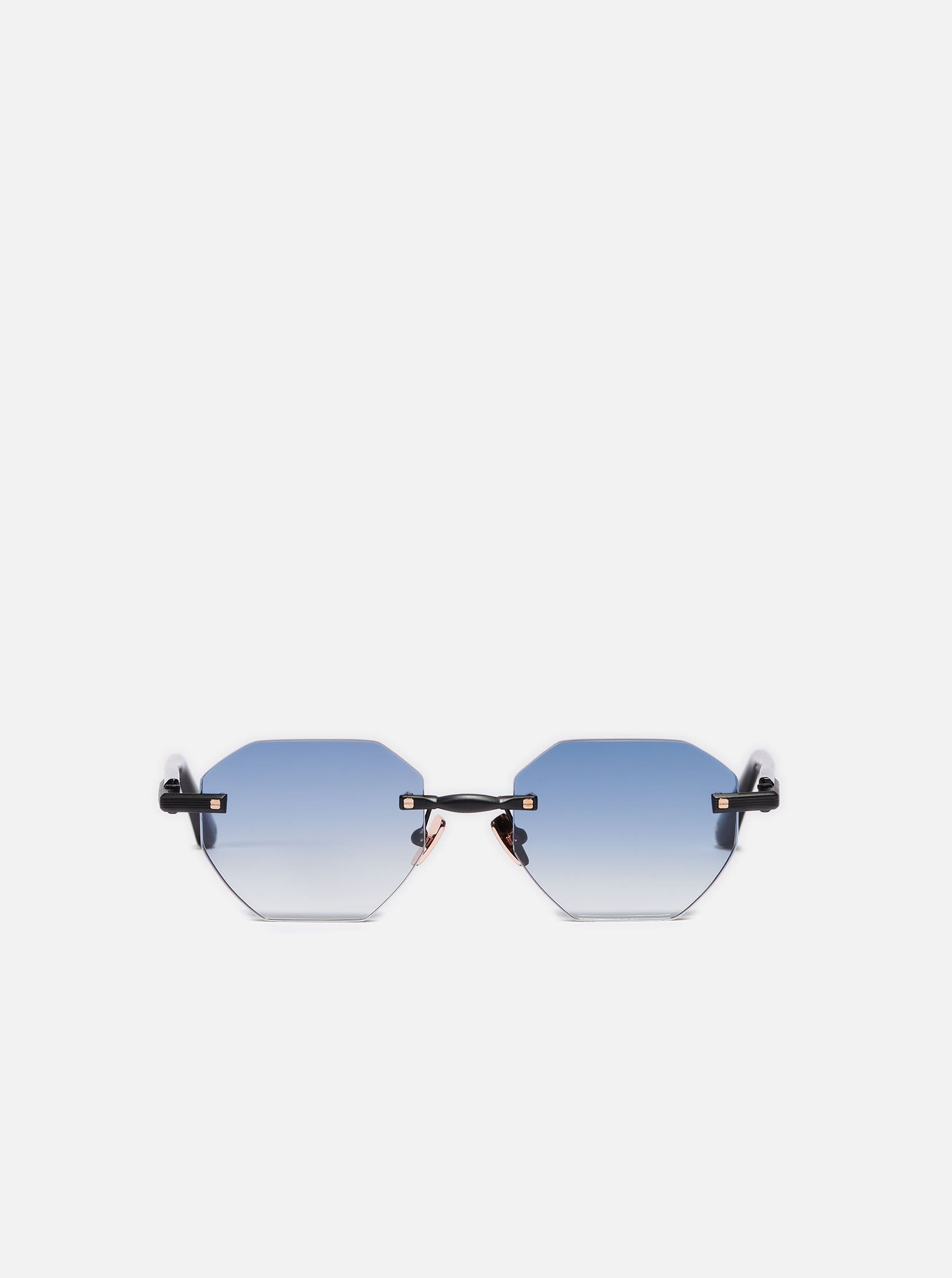 Unisex rimless frame in a hexagonal shape. The frame is equipped with a wide, grooved bridge and end pieces. The glasses feature extended acetate temple tips.