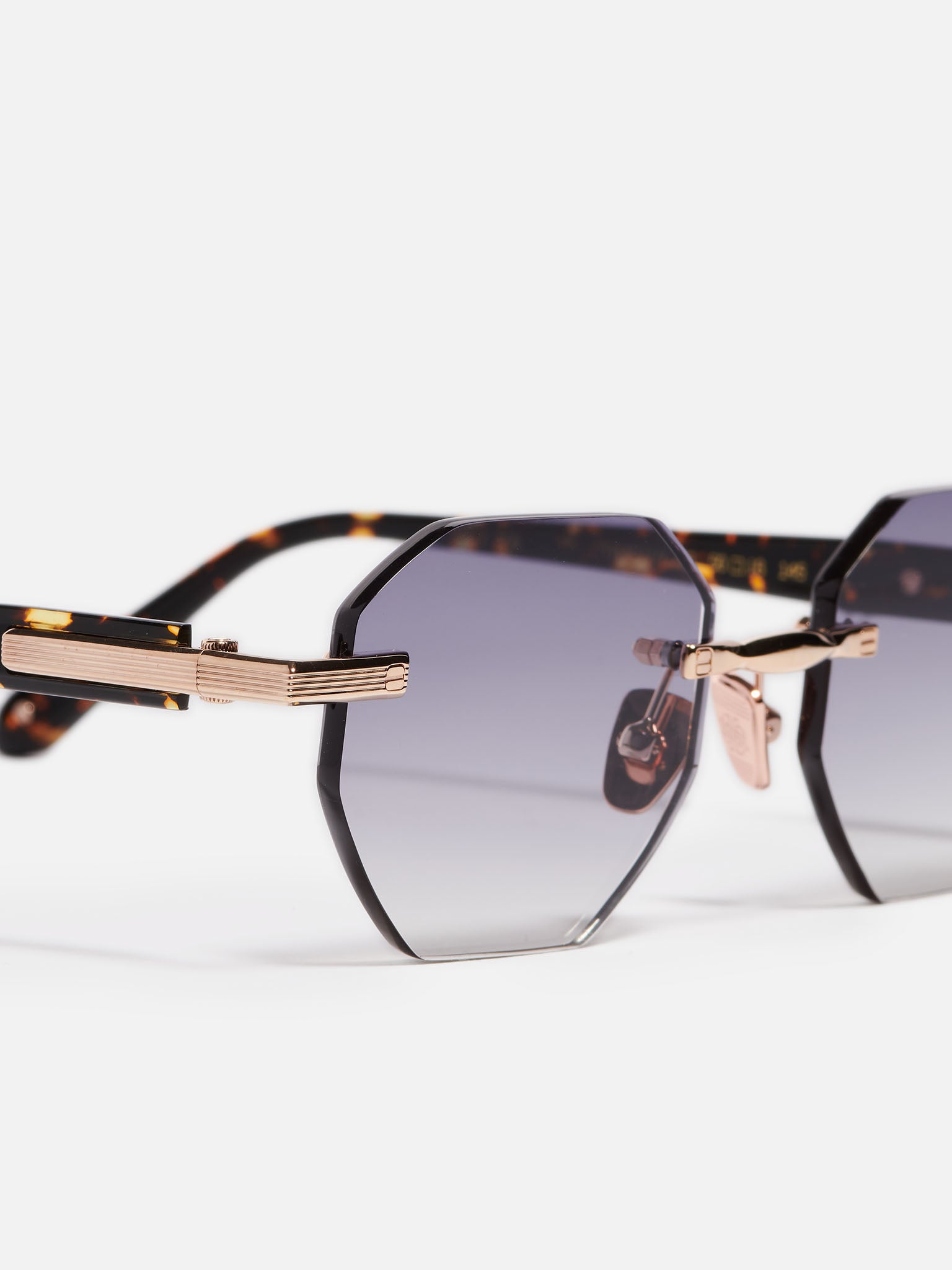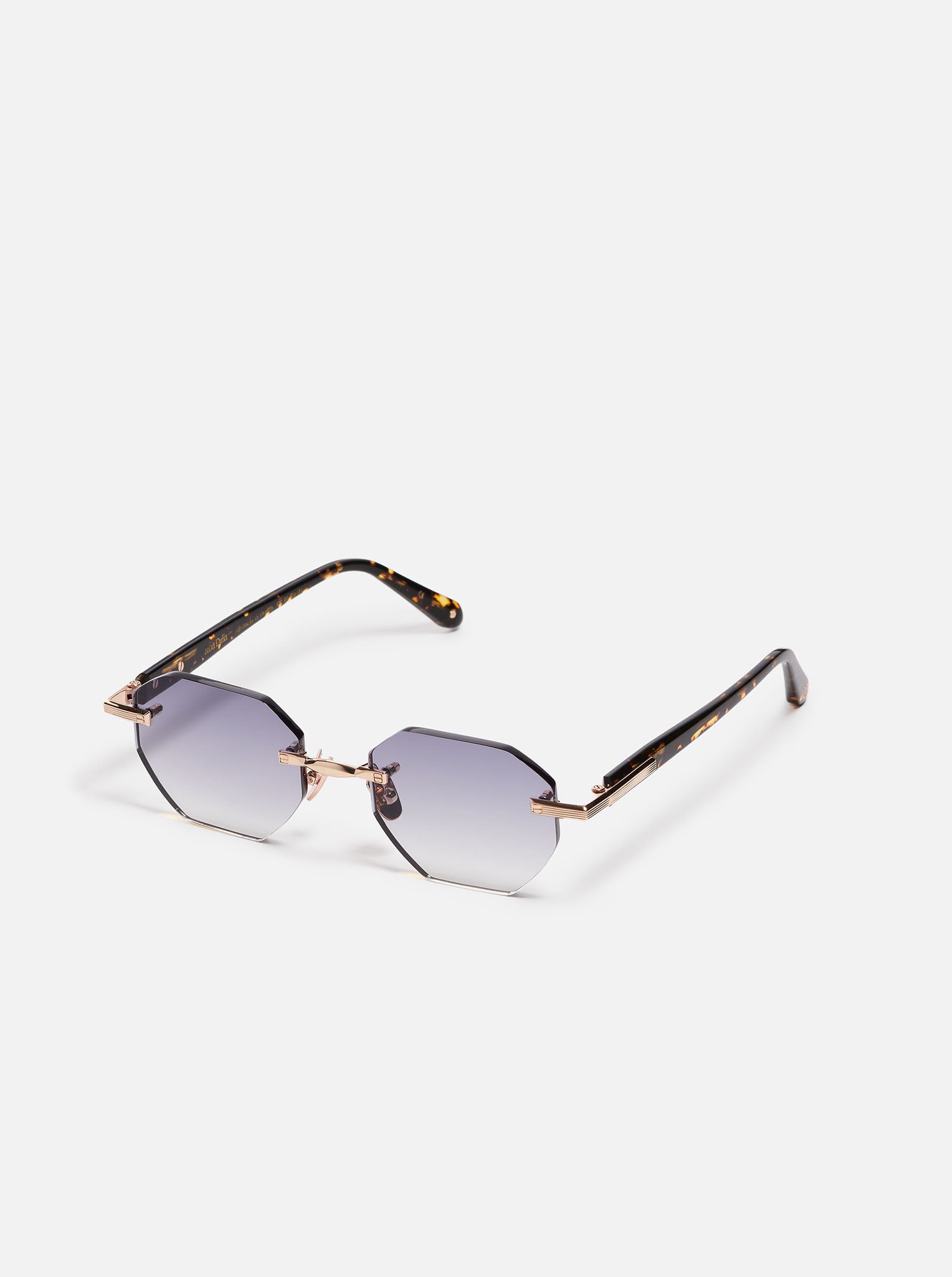 Unisex rimless frame in a hexagonal shape. The frame is equipped with a wide, grooved bridge and end pieces. The glasses feature extended acetate temple tips.