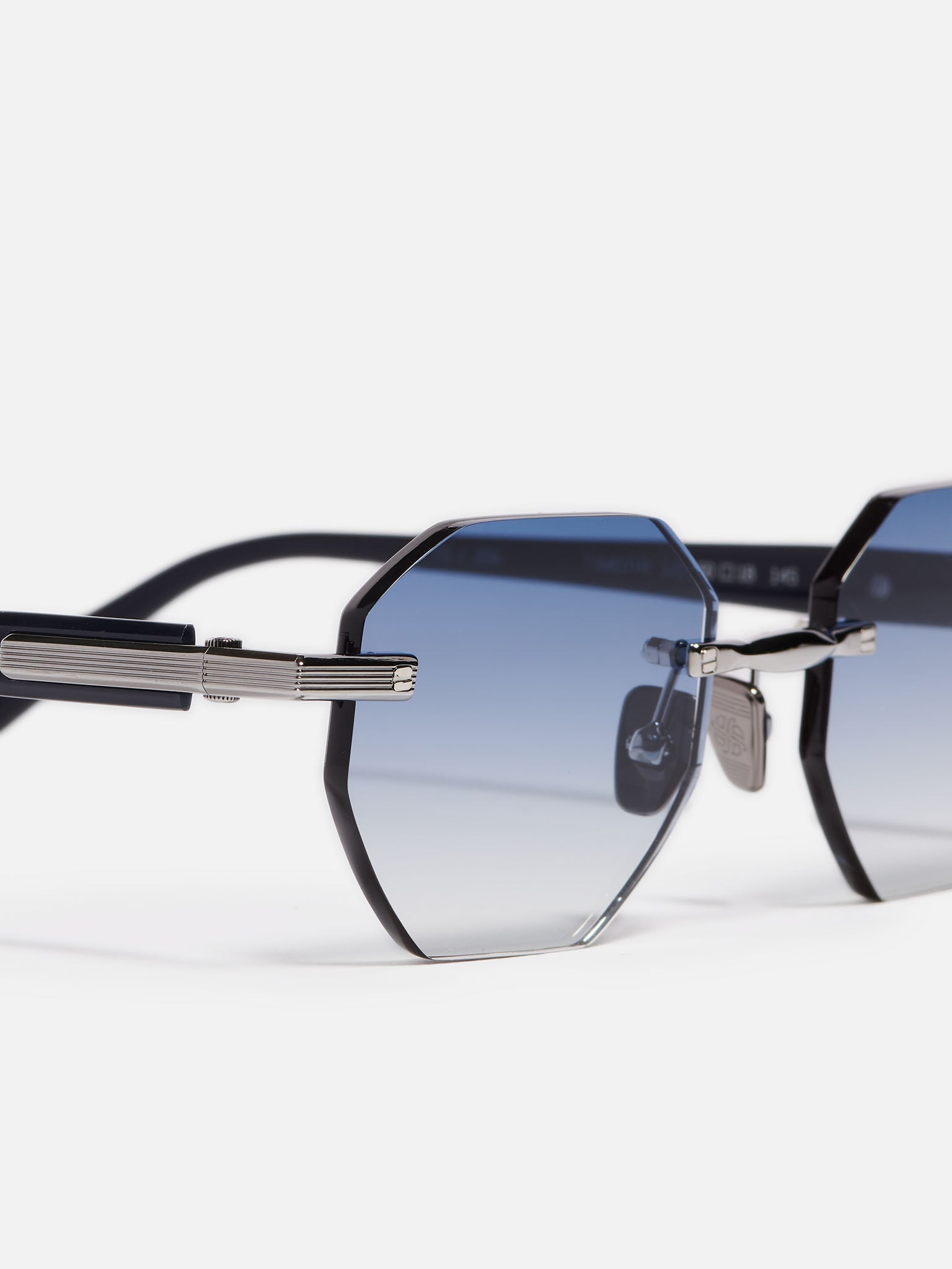 Unisex rimless frame in a hexagonal shape. The frame is equipped with a wide, grooved bridge and end pieces. The glasses feature extended acetate temple tips.