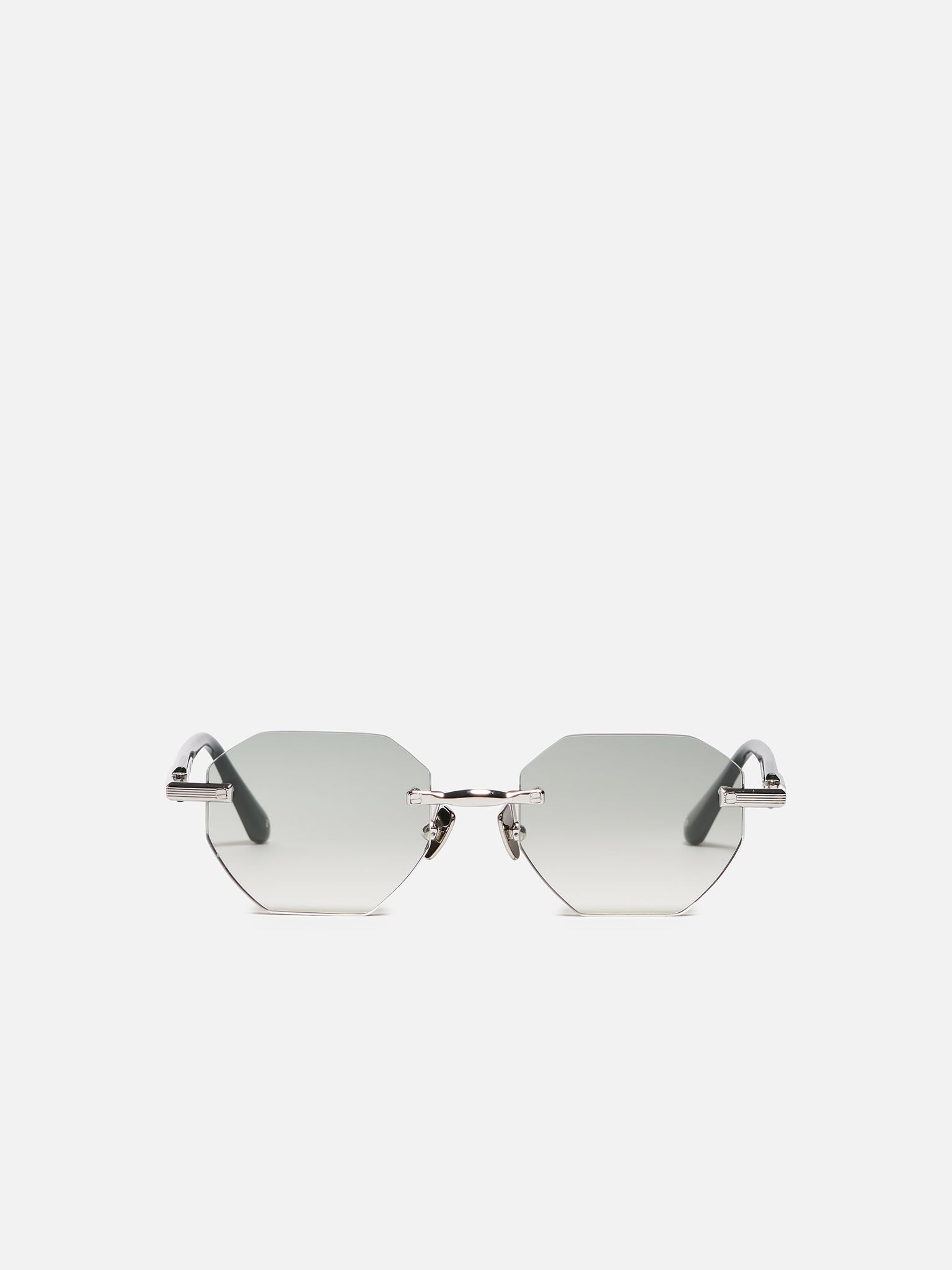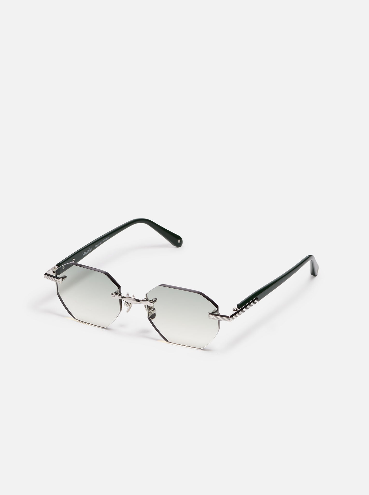 Unisex rimless frame in a hexagonal shape. The frame is equipped with a wide, grooved bridge and end pieces. The glasses feature extended acetate temple tips.