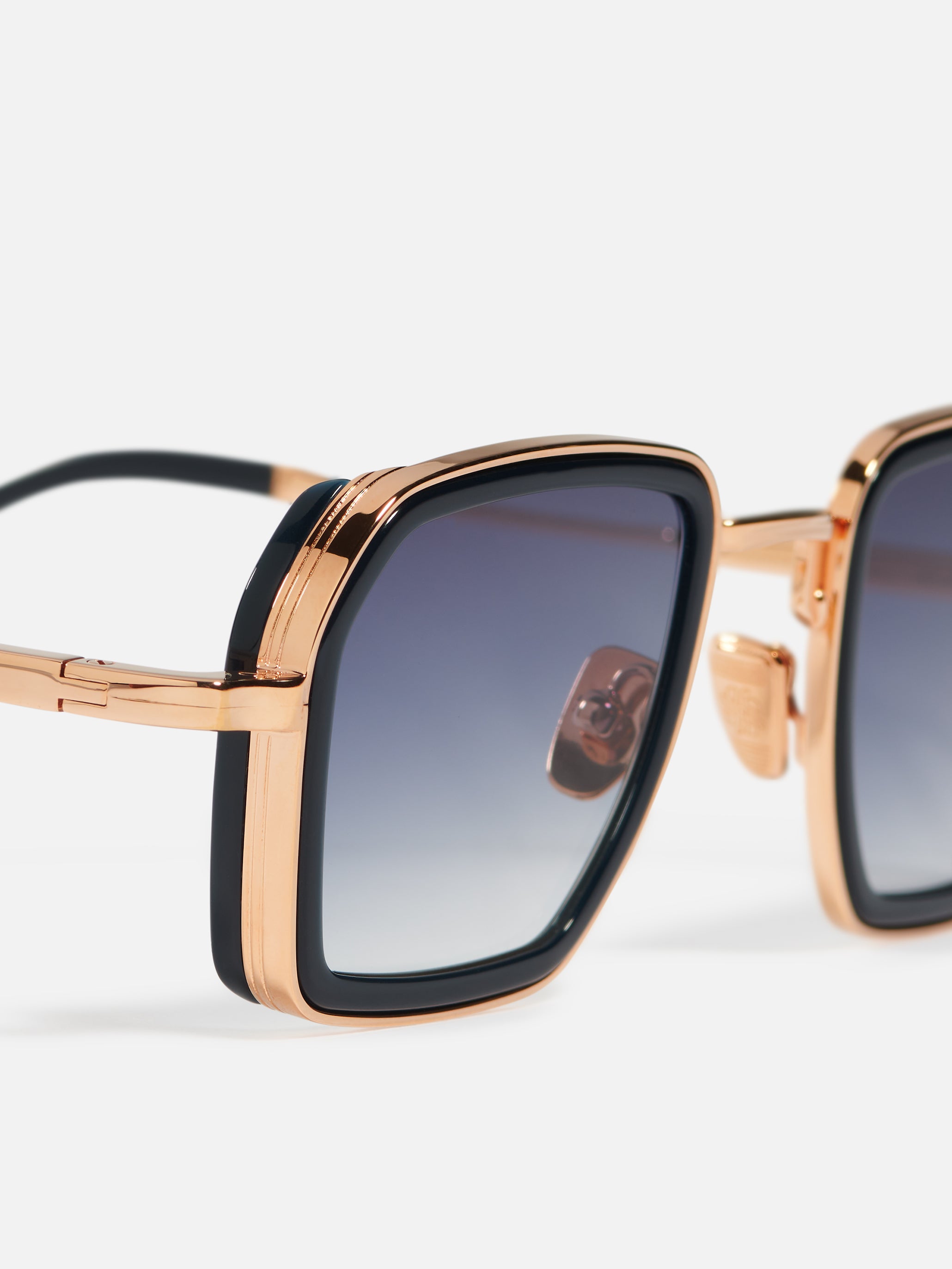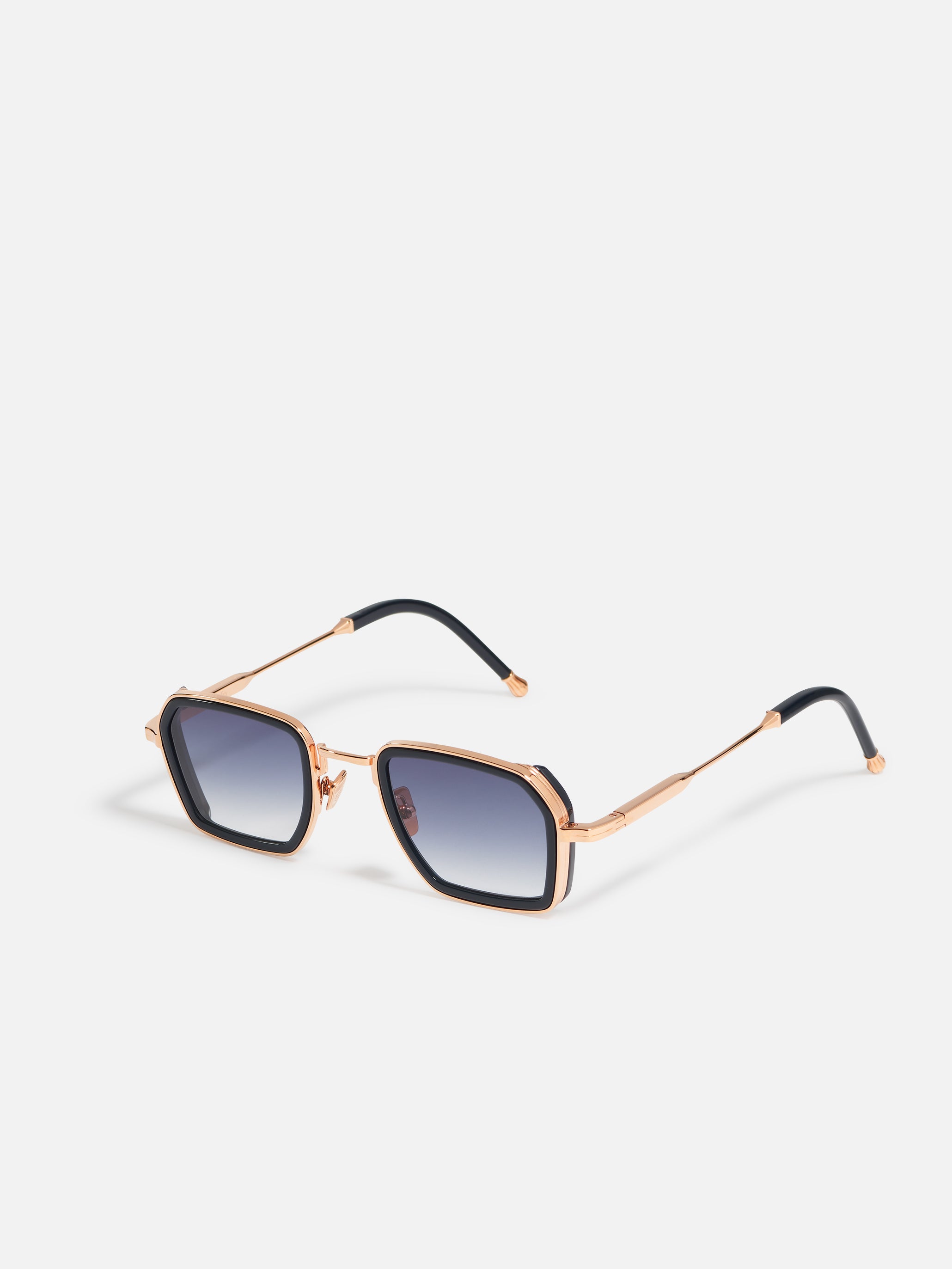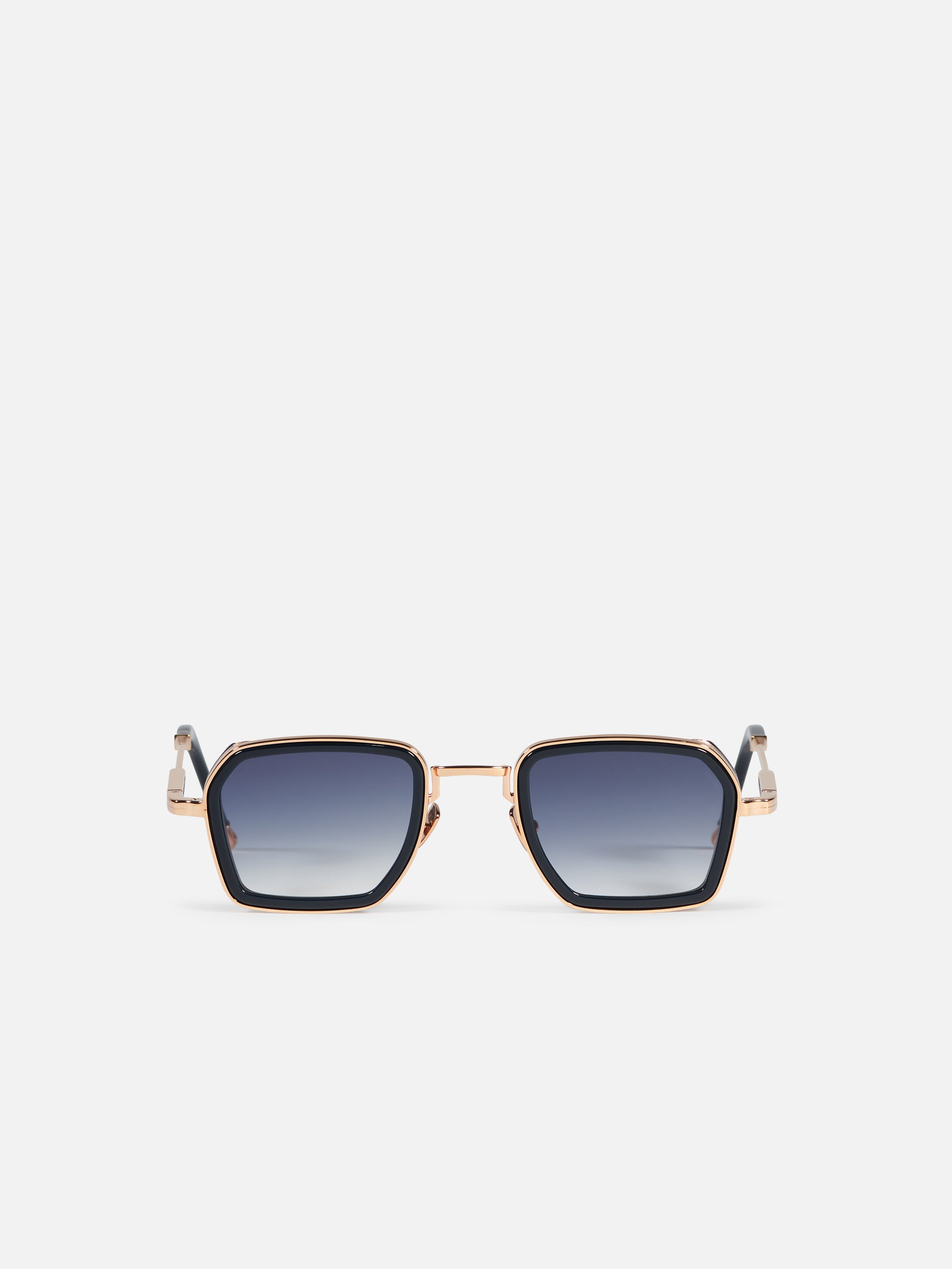 The frame is enlivened by our new signature temples featuring John Dalia’s engraved end pieces. The metal corewire is made of stainless steel frame with a rose gold plating (5µ, with a jeweler’s stamp inside the temple). Temple tips and eye rims in blue acetate