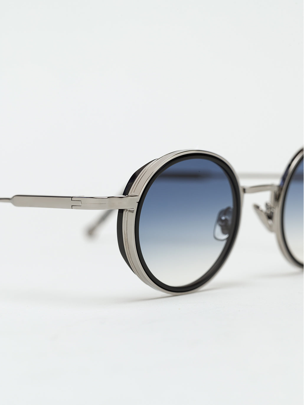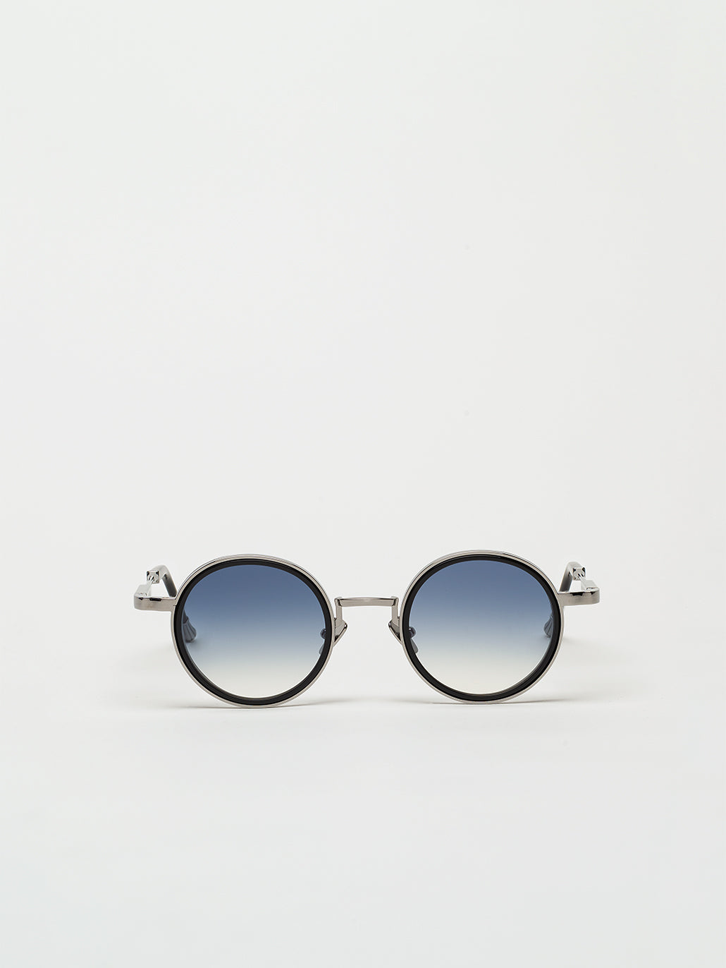Unisex frame in a round shape. It features combining metal and acetate rims and a 4mm streak-engraved metal structure.