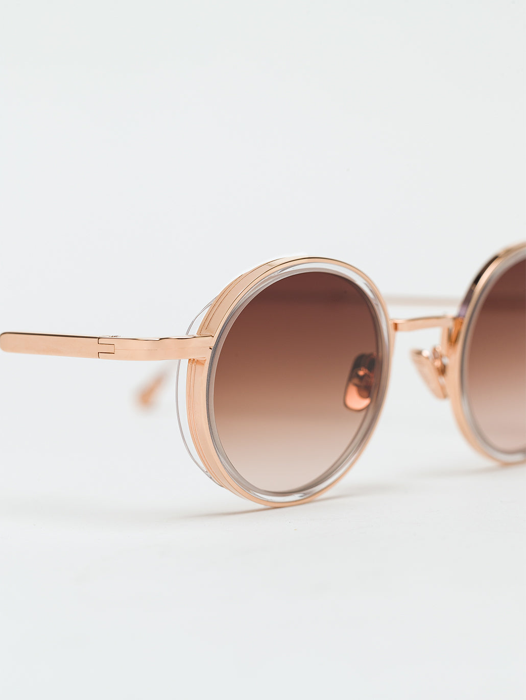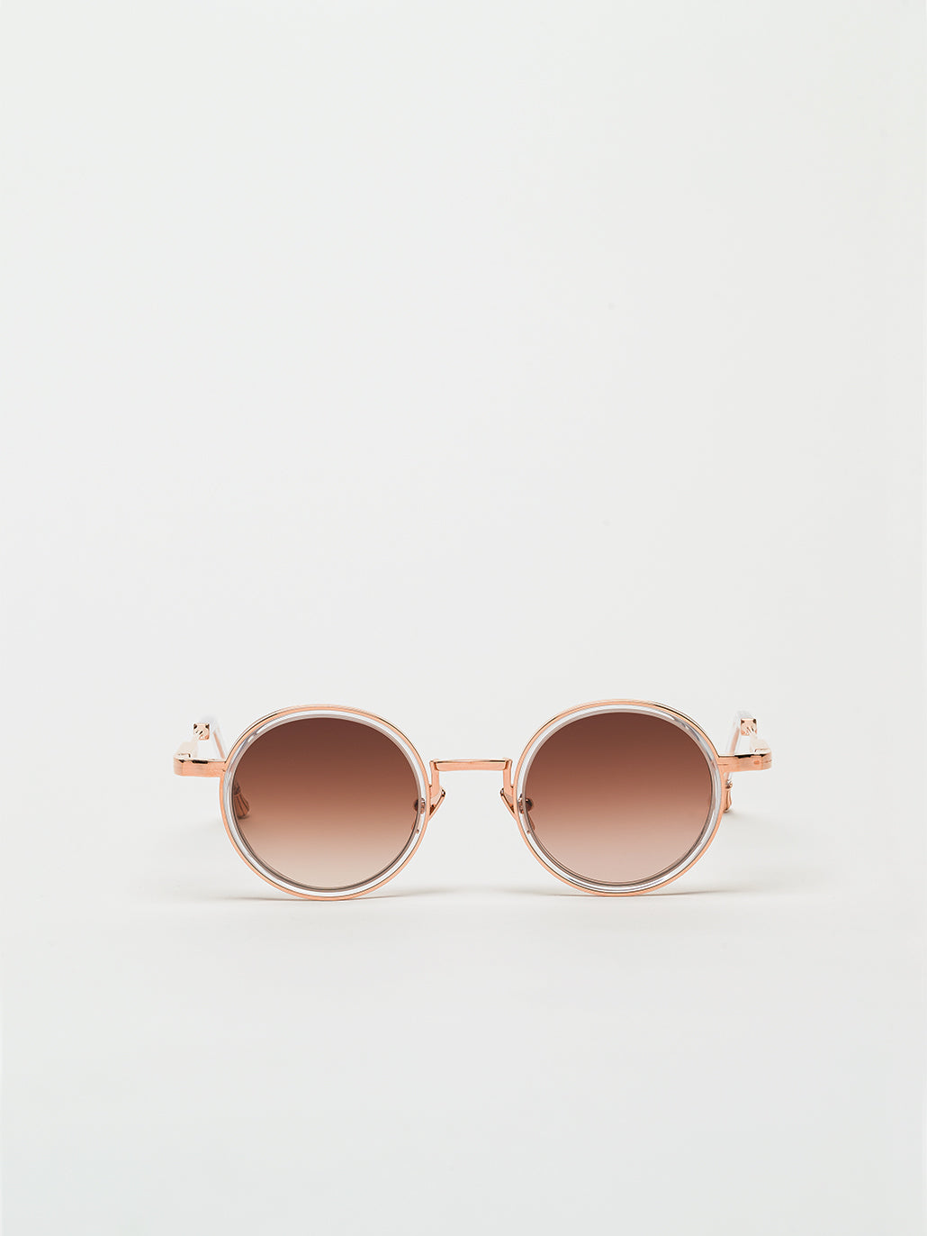 The metal corewire is made of stainless steel frame with a rose gold plating (5µ, with a jeweler’s stamp inside the temple). Temple tips and eye rims in crystal acetate.