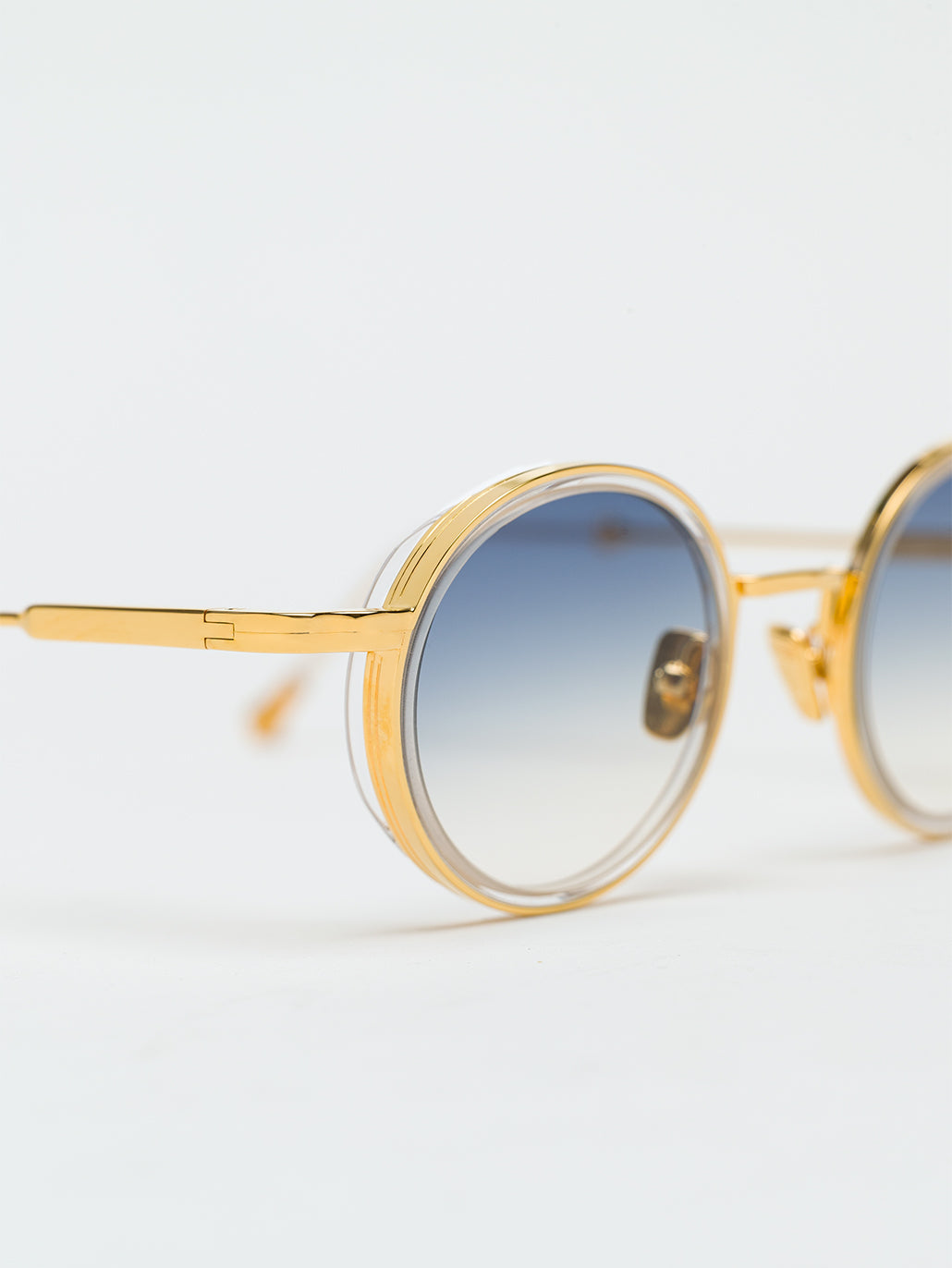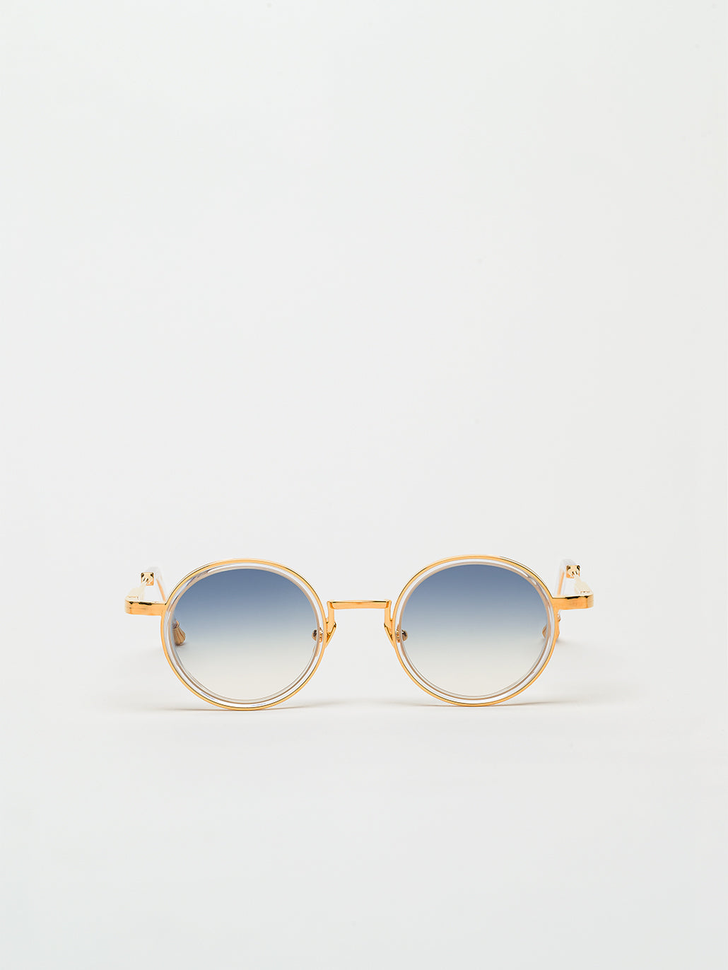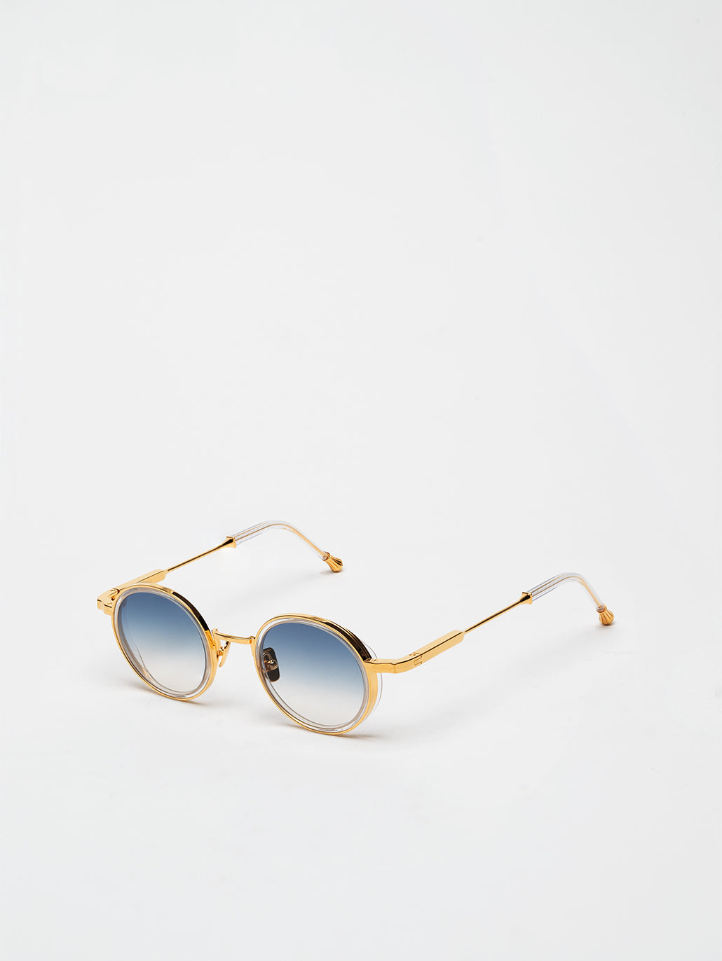 The metal corewire is made of stainless steel frame with a yellow gold plating (5µ, with a jeweler’s stamp inside the temple). Temple tips and eye rims in crystal acetate.