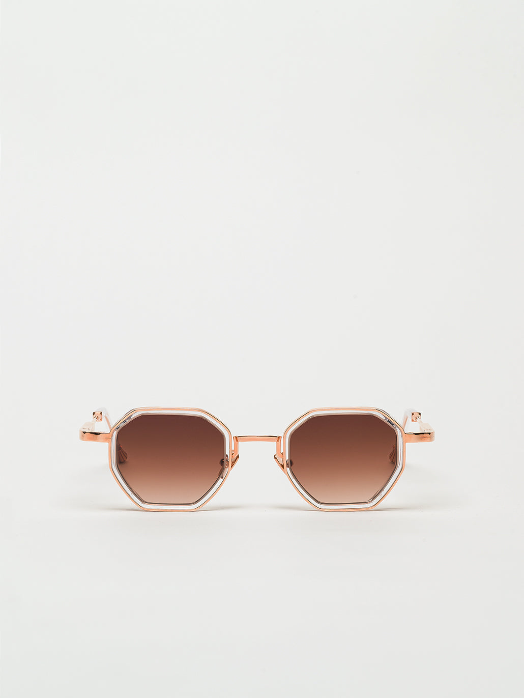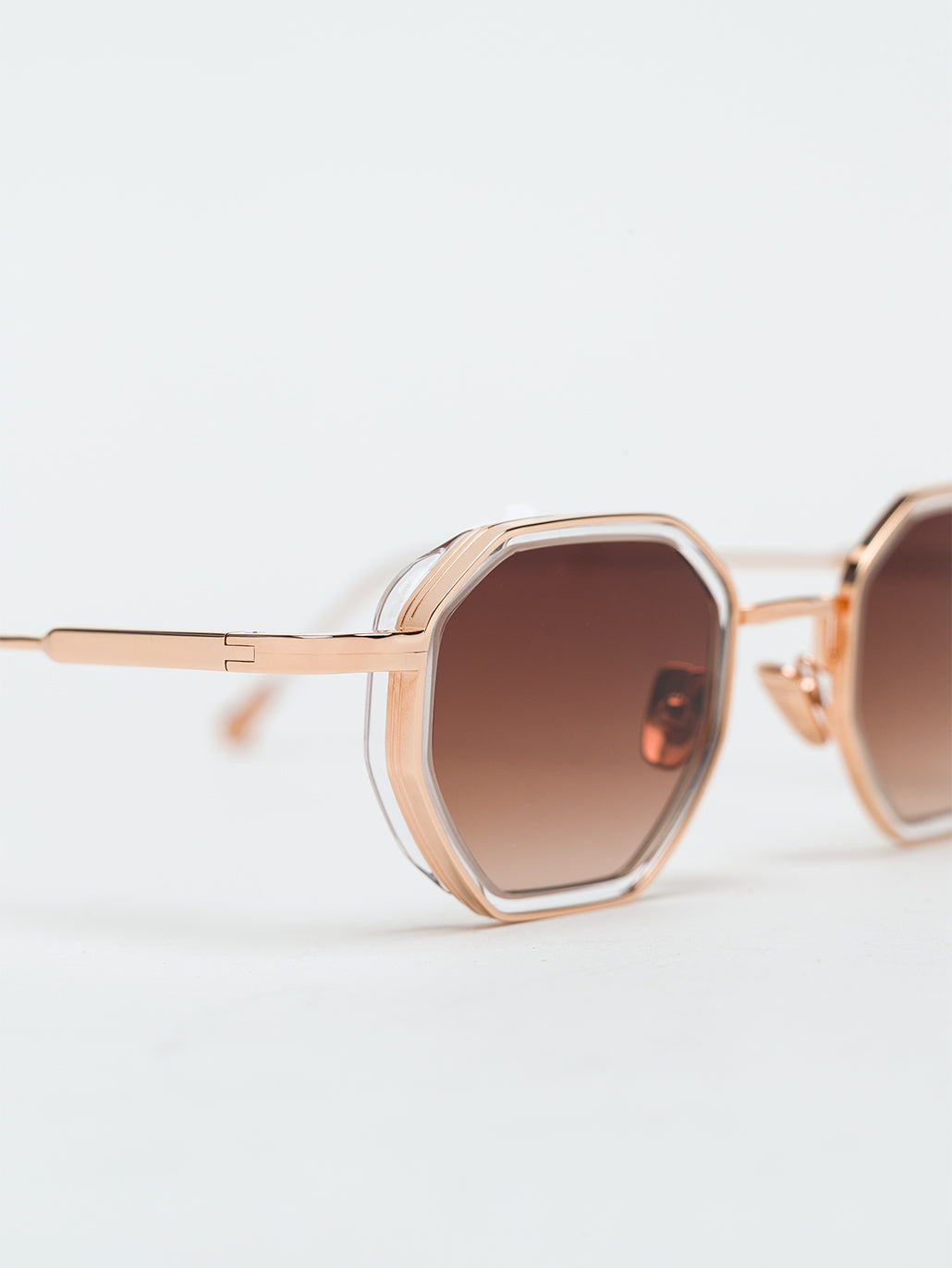 The metal corewire is made of stainless steel frame with a 22-carat rose gold plating (c. 5µ layer and jewelry stamp inside the temple). The frame is enlivened by our new signature temples featuring John Dalia’s engraved end pieces.