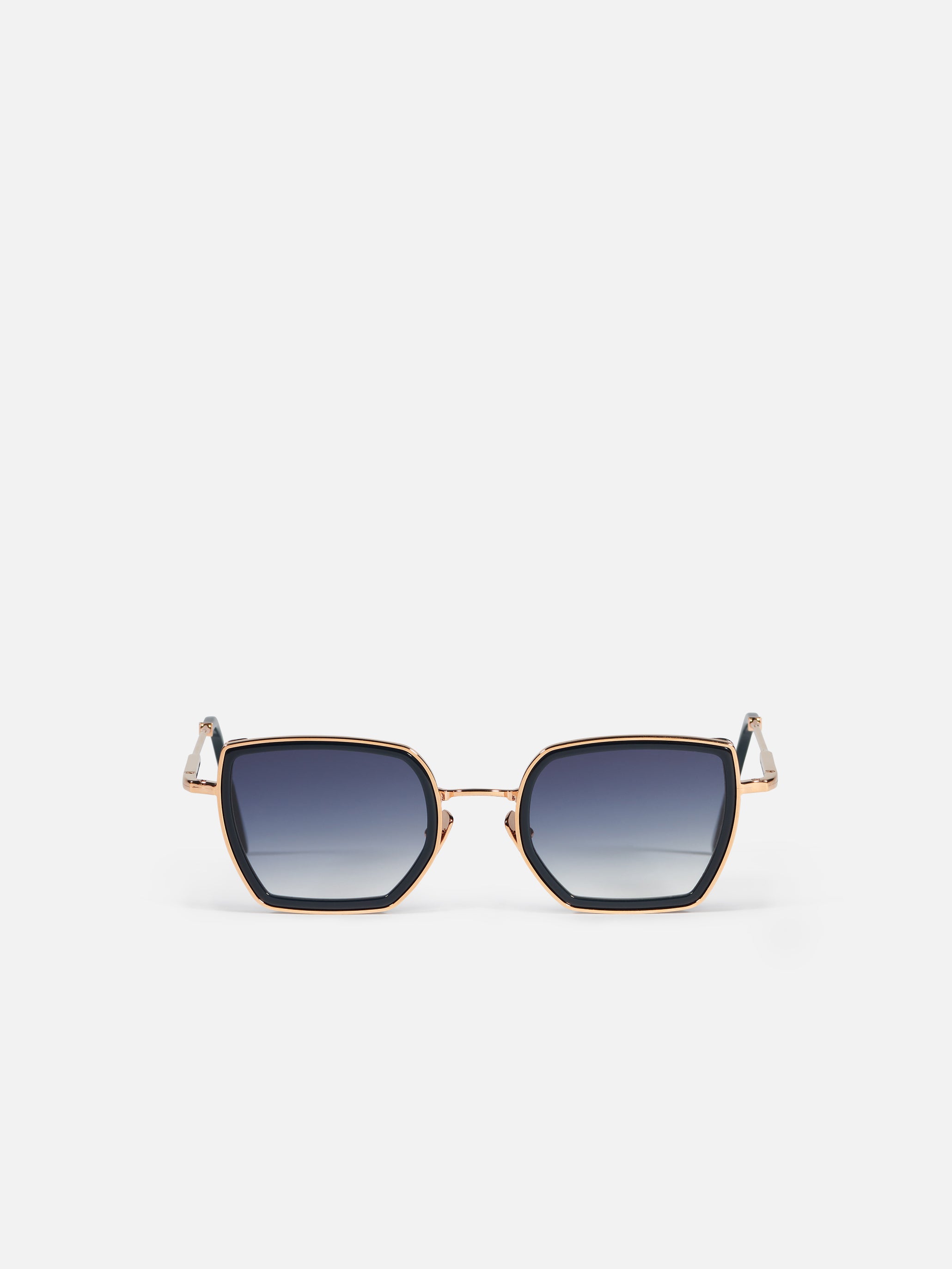 Oversized retro-influenced metal butterfly frame for women with acetate rims cut that stands out from the 4mm streak-engraved metal. Custom navy blue acetate & 22-carat rose gold-plated alloy frame (c. 5µ layer and jewelry stamp inside the temple). Night blue gradient CR39 lenses with AR treatment. Reference C-134. Case and cleaning cloth are included.