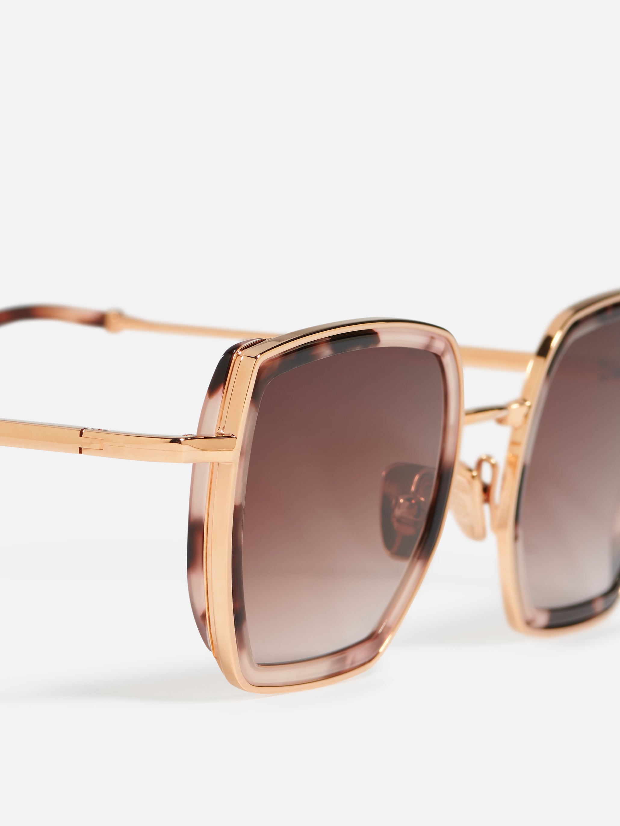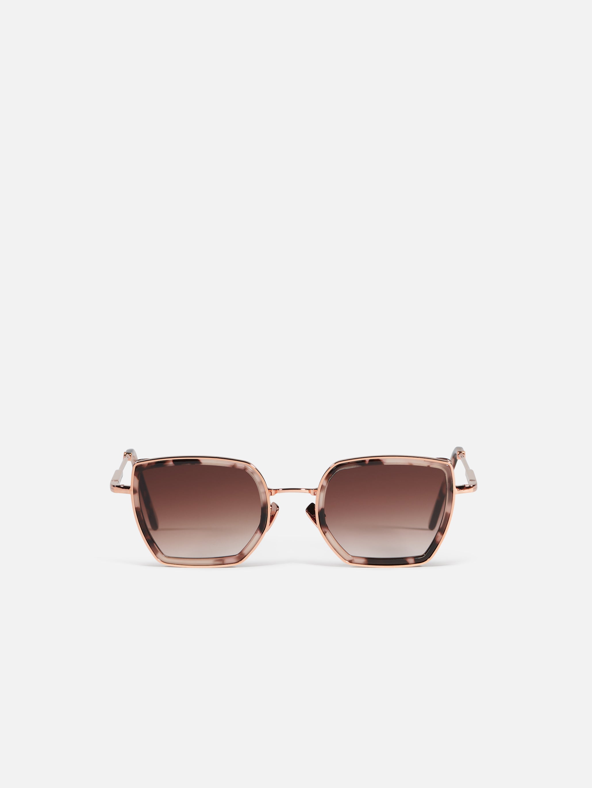Oversized retro-influenced metal butterfly frame for women with acetate rims cut that stands out from the 4mm streak-engraved metal. Custom rose tortoise acetate & 22-carat rose gold-plated alloy frame (c. 5µ layer and jewelry stamp inside the temple). Brown gradient CR39 lenses with AR treatment. Reference C-140. Case and cleaning cloth are included.