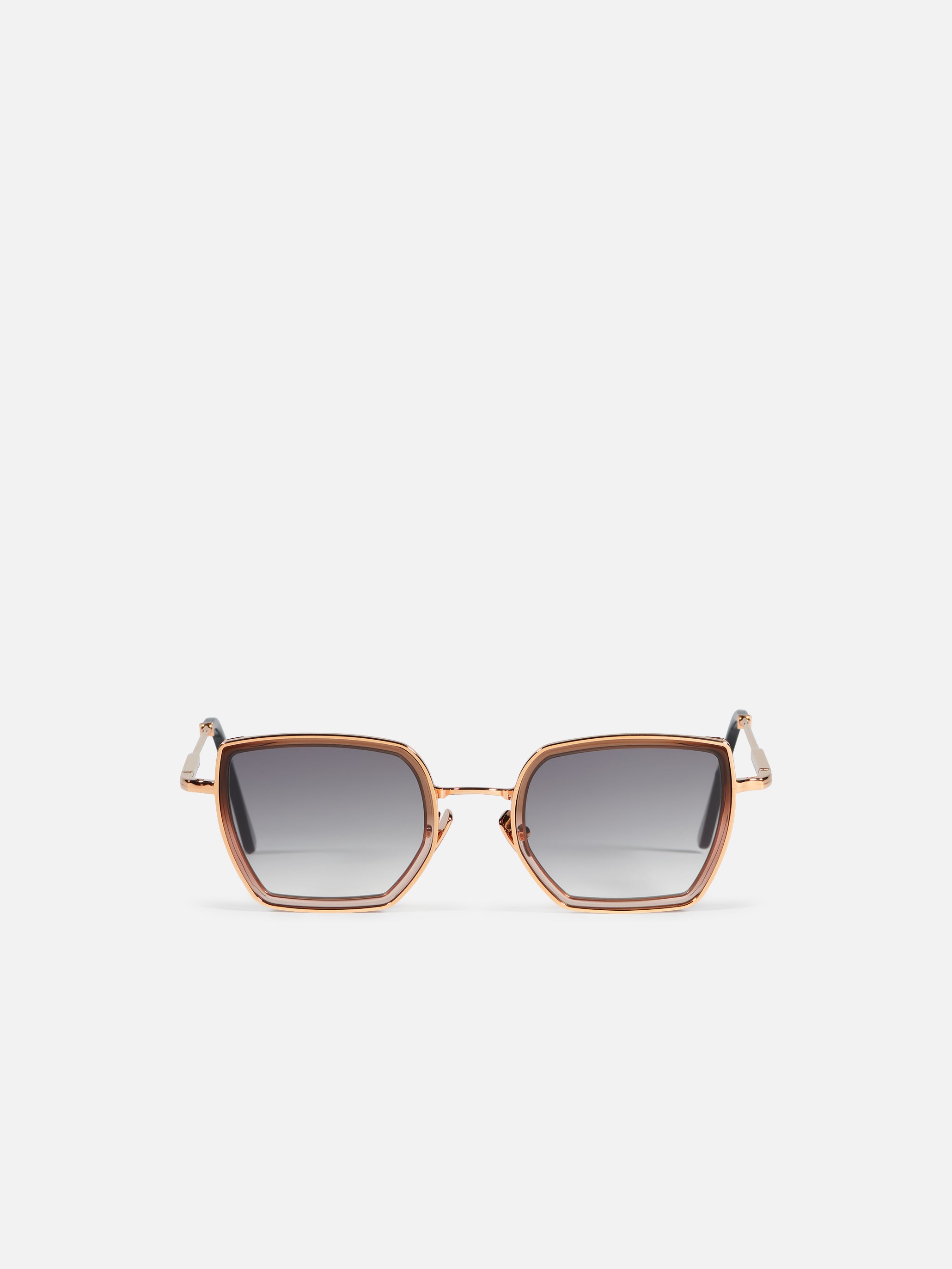 Oversized retro-influenced metal butterfly frame for women with acetate rims cut that stands out from the 4mm streak-engraved metal. Custom brown and translucide acetate & 22-carat rose gold-plated alloy frame (c. 5µ layer and jewelry stamp inside the temple). Grey gradient CR39 lenses with AR treatment. Reference C-146. Case and cleaning cloth are included.