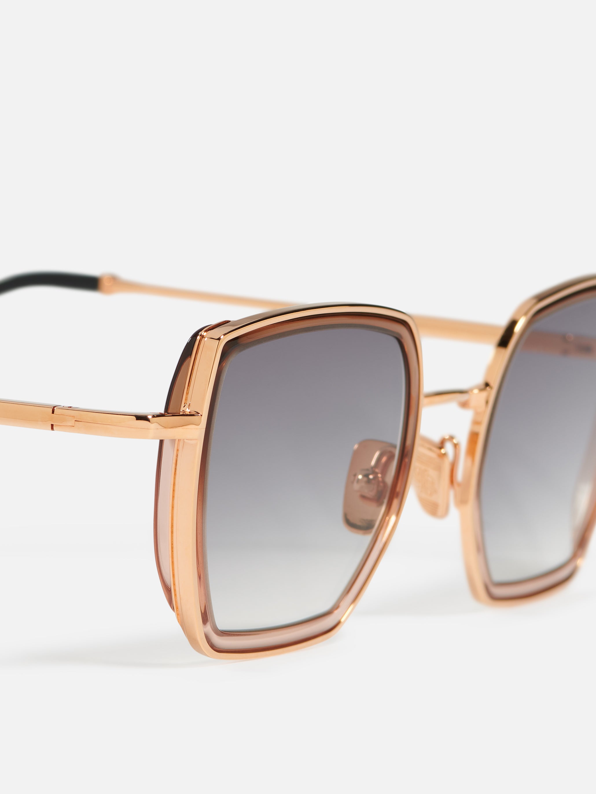 Retro-influenced metal butterfly frame for women with acetate rims cut that stands out from the 4mm streak-engraved metal. Custom brown and translucide acetate & 22-carat rose gold-plated alloy frame (c. 5µ layer and jewelry stamp inside the temple). Grey gradient CR39 lenses with AR treatment. Reference C-146. Case and cleaning cloth are included.