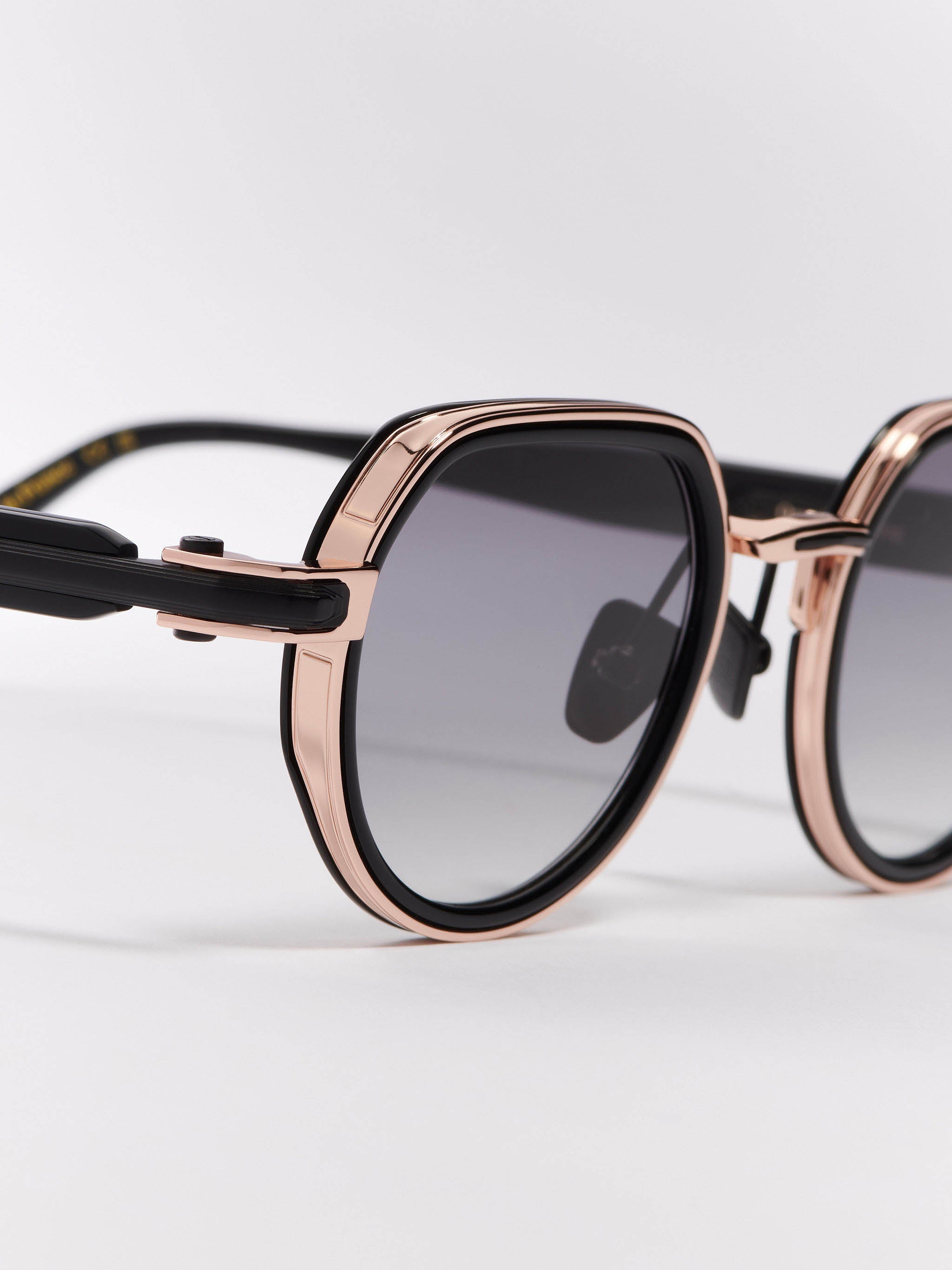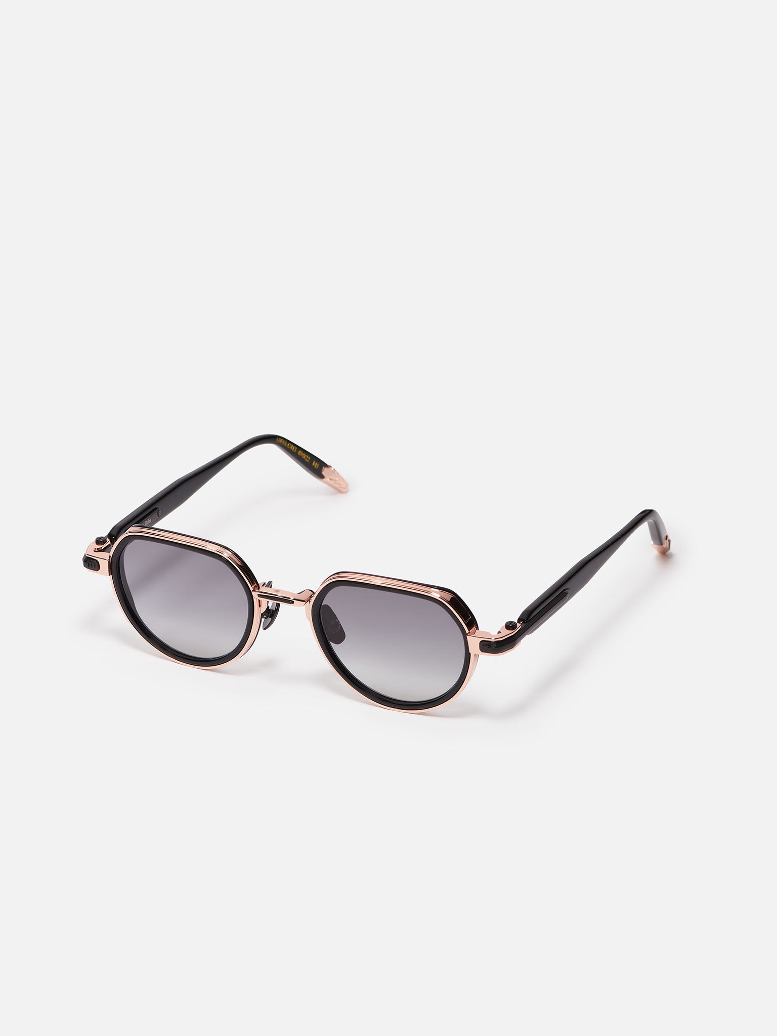 Rose gold titanium corewire structure with carbon effect plated decorative elements. The temple tips and rims are crafted from Shiny black.