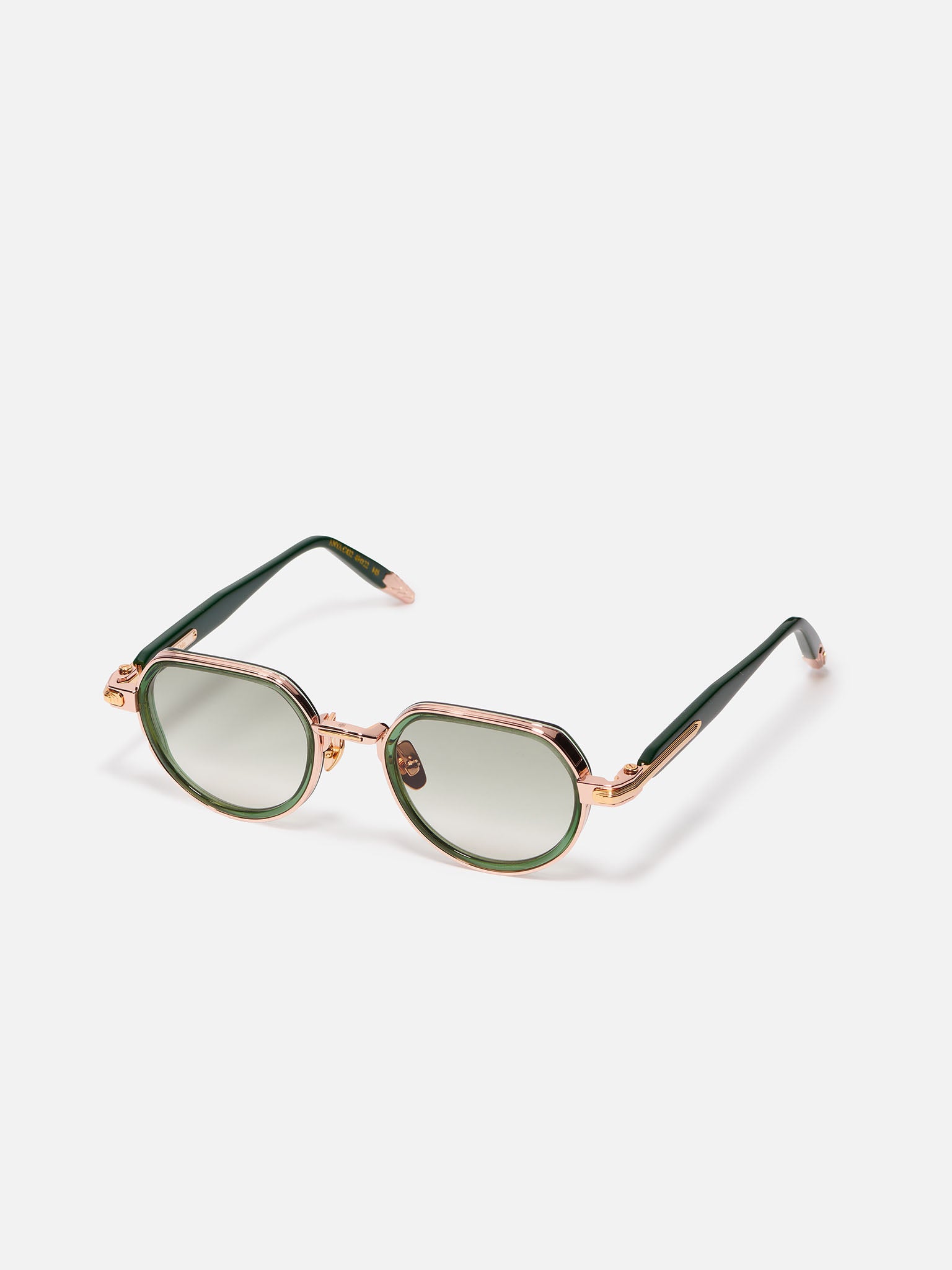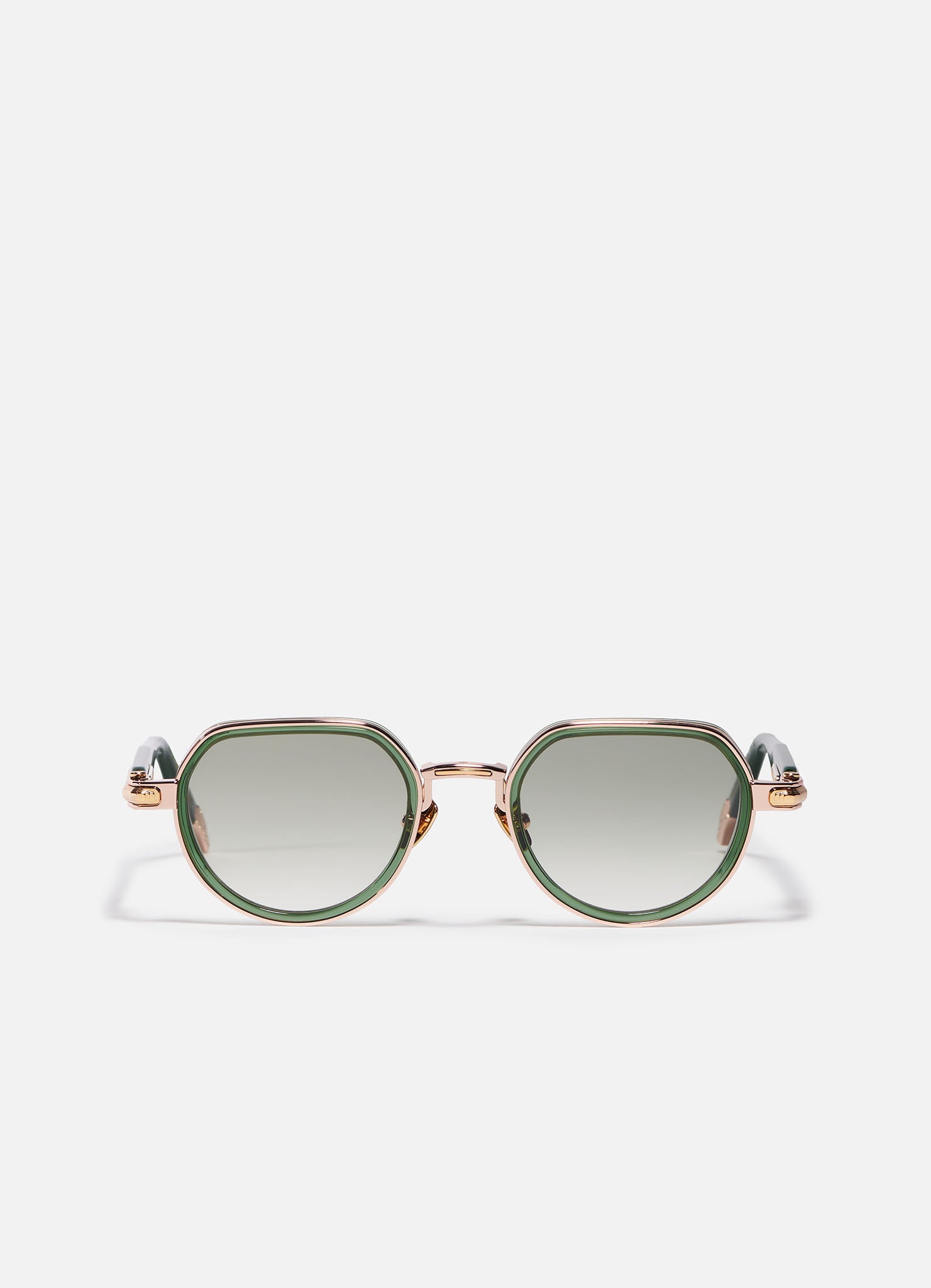 Unisex round shaped frame combining a titanium corewere, metal details and acetate elements in a refined fusion of materials.
