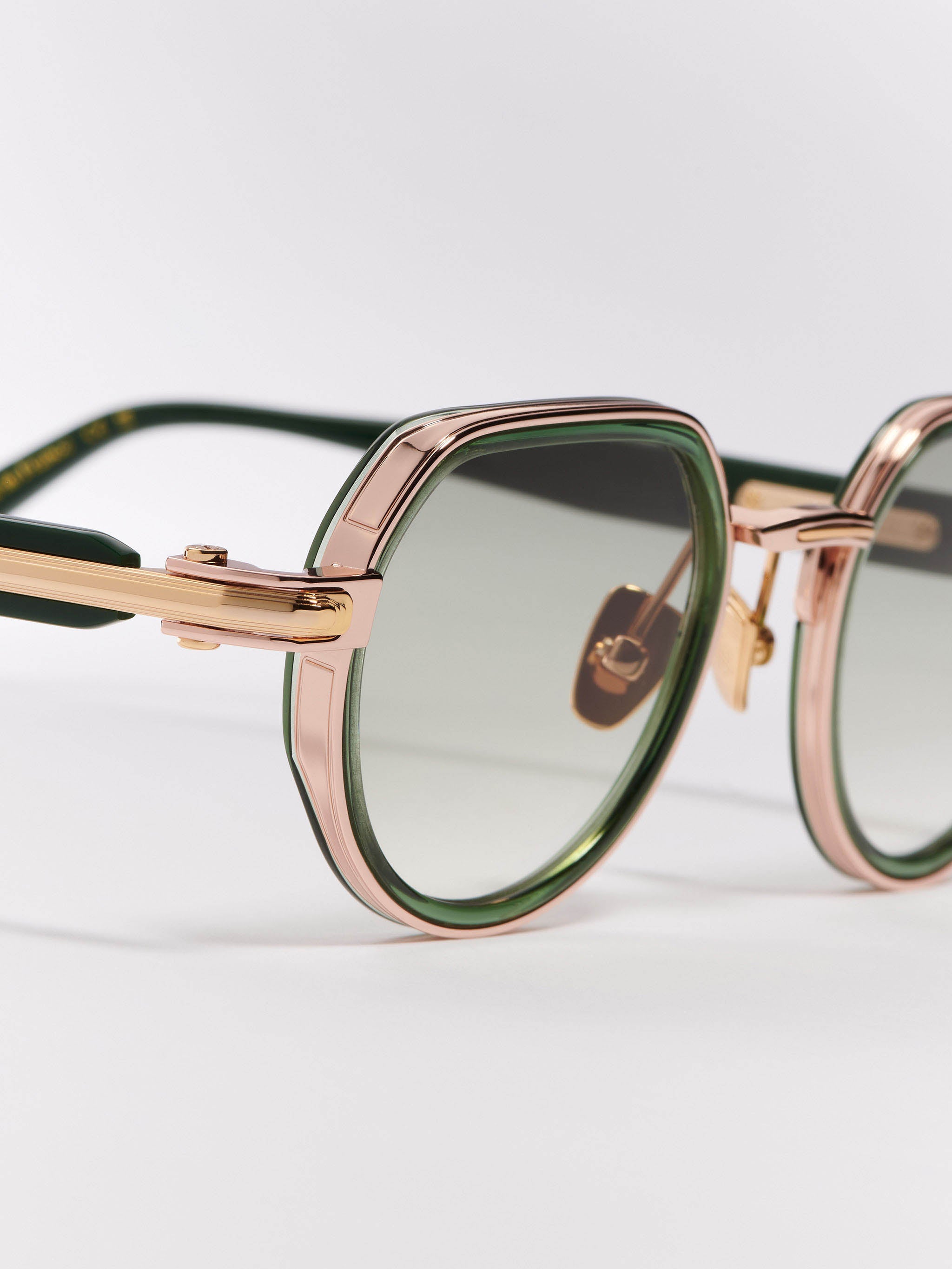 The acetate temples extend seamlessly into sculpted metal end tips, conceived as a natural continuation of the architecture. With subtle variations in thickness and finely striated finishes, the temples highlight the distinctive character of the design.