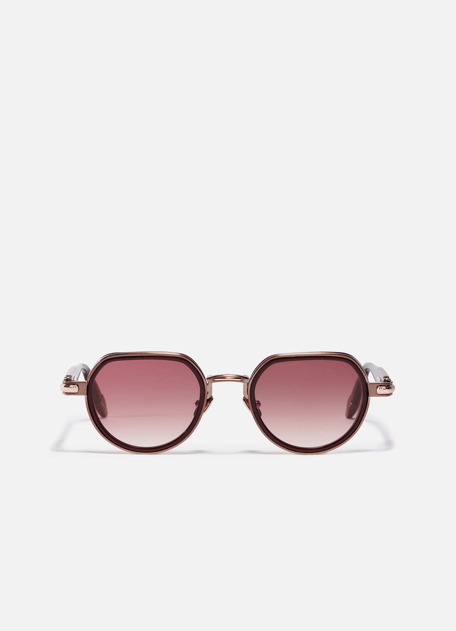 Unisex round shaped frame combining a titanium corewere, metal details and acetate elements in a refined fusion of materials.