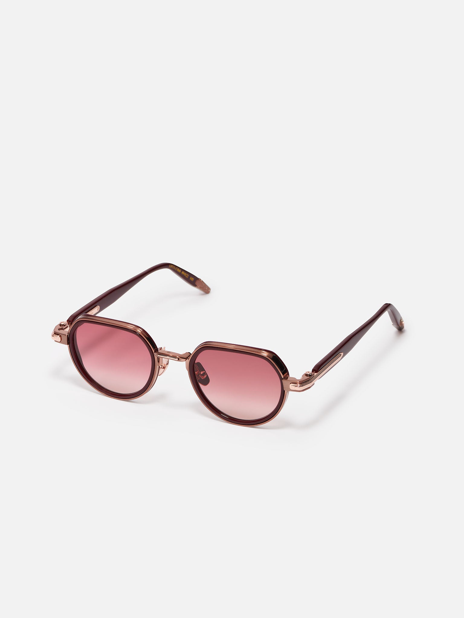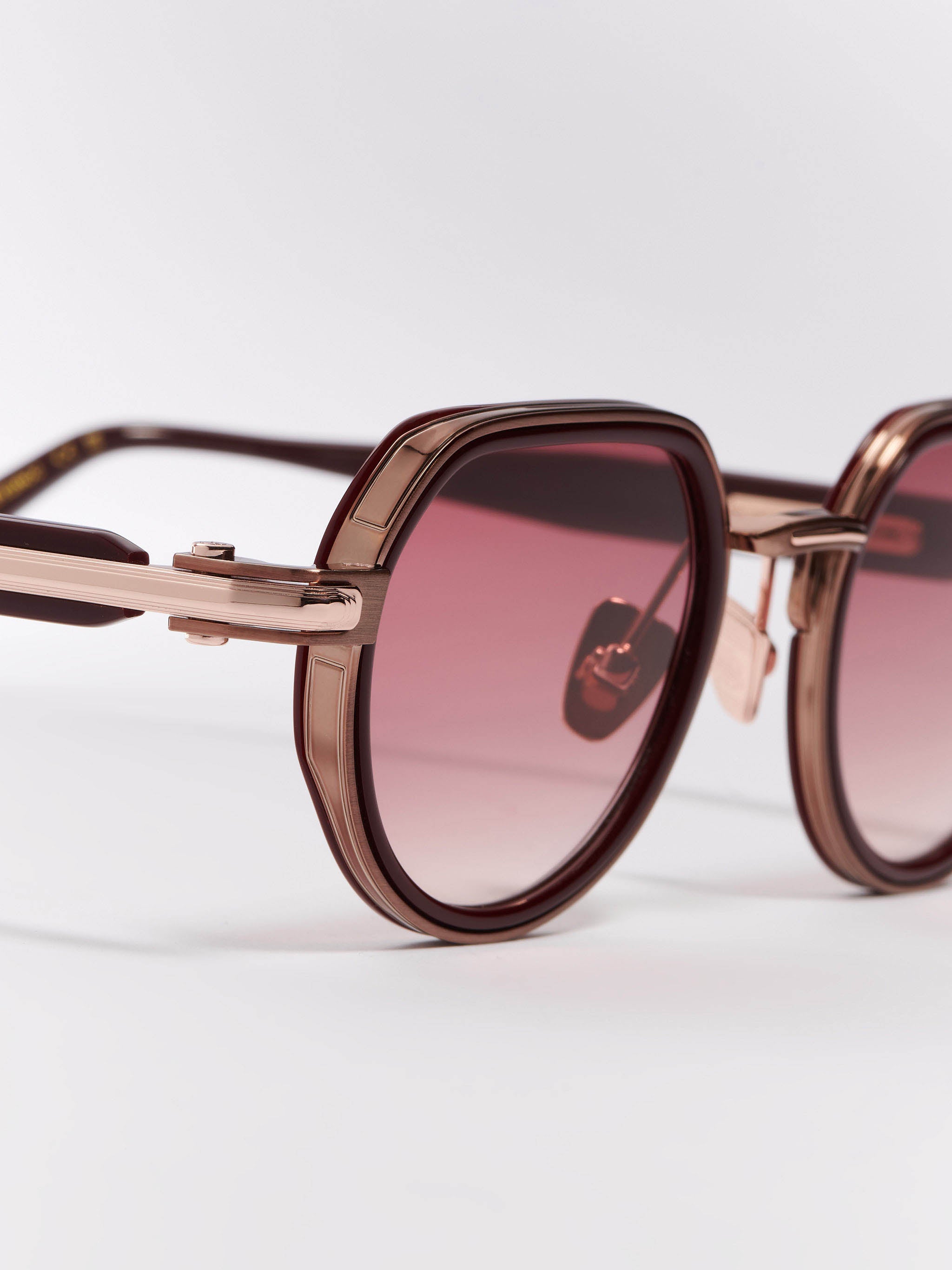 Brushed copper titanium corewire structure with rose gold plated decorative elements (5µ, with a jeweler’s hallmark inside the temple). The temple tips and rims are crafted from Burgundy.