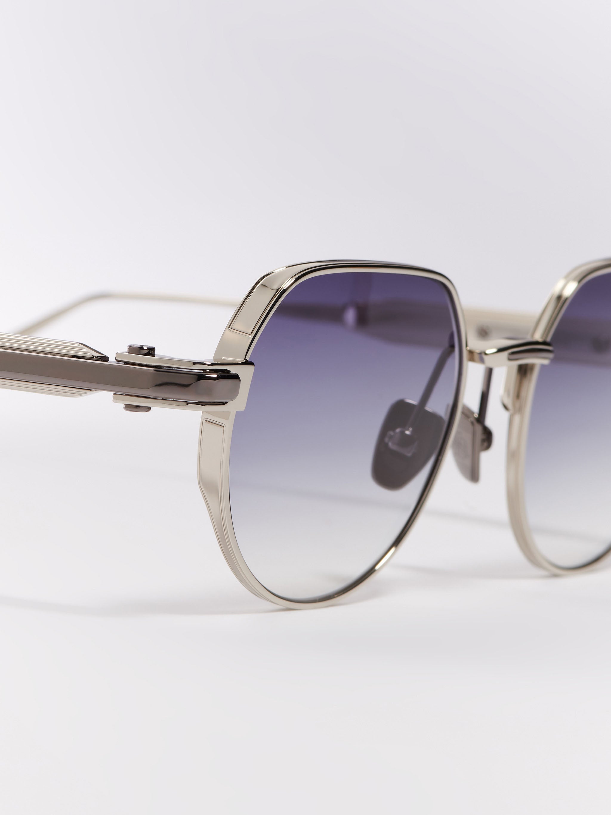 The temples extend seamlessly into sculpted metal end tips, conceived as a natural continuation of the architecture. With subtle variations in thickness and finely striated finishes, the temples highlight the distinctive character of the design.