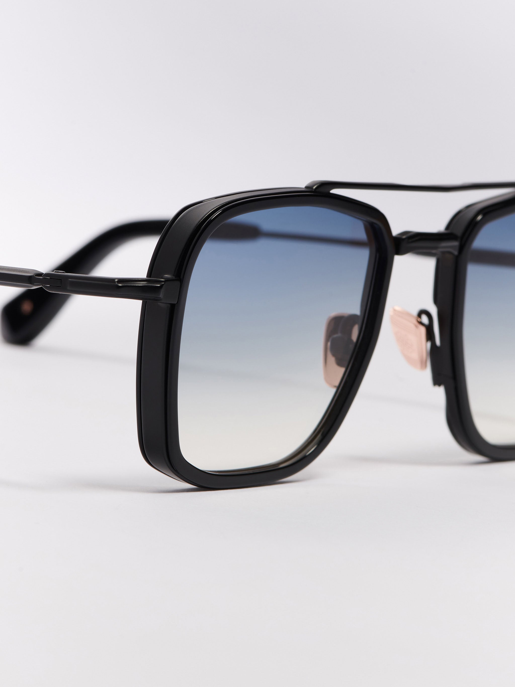 Unisex aviator shaped frame combining a titanium structure with metal details in a refined fusion of materials.