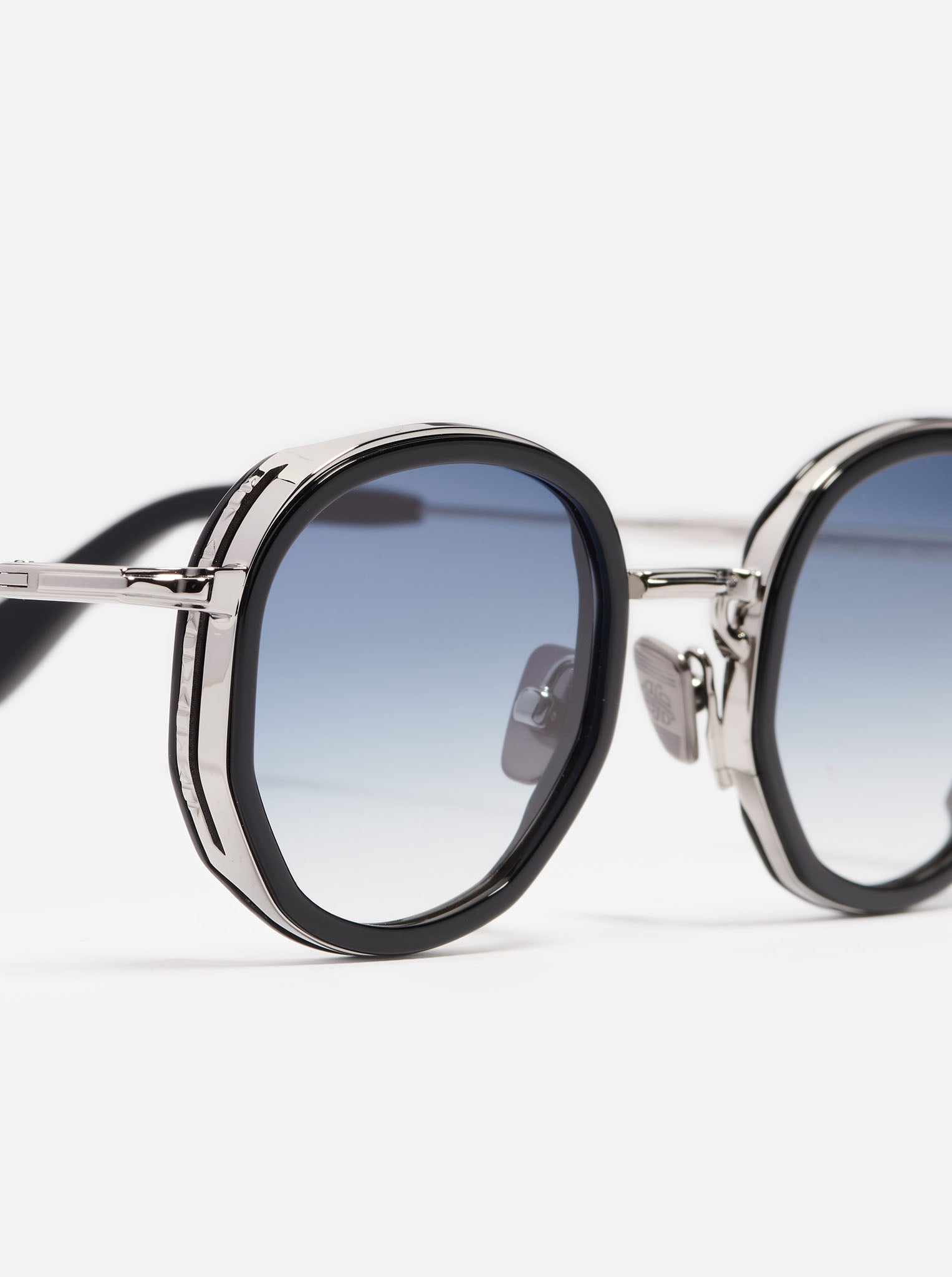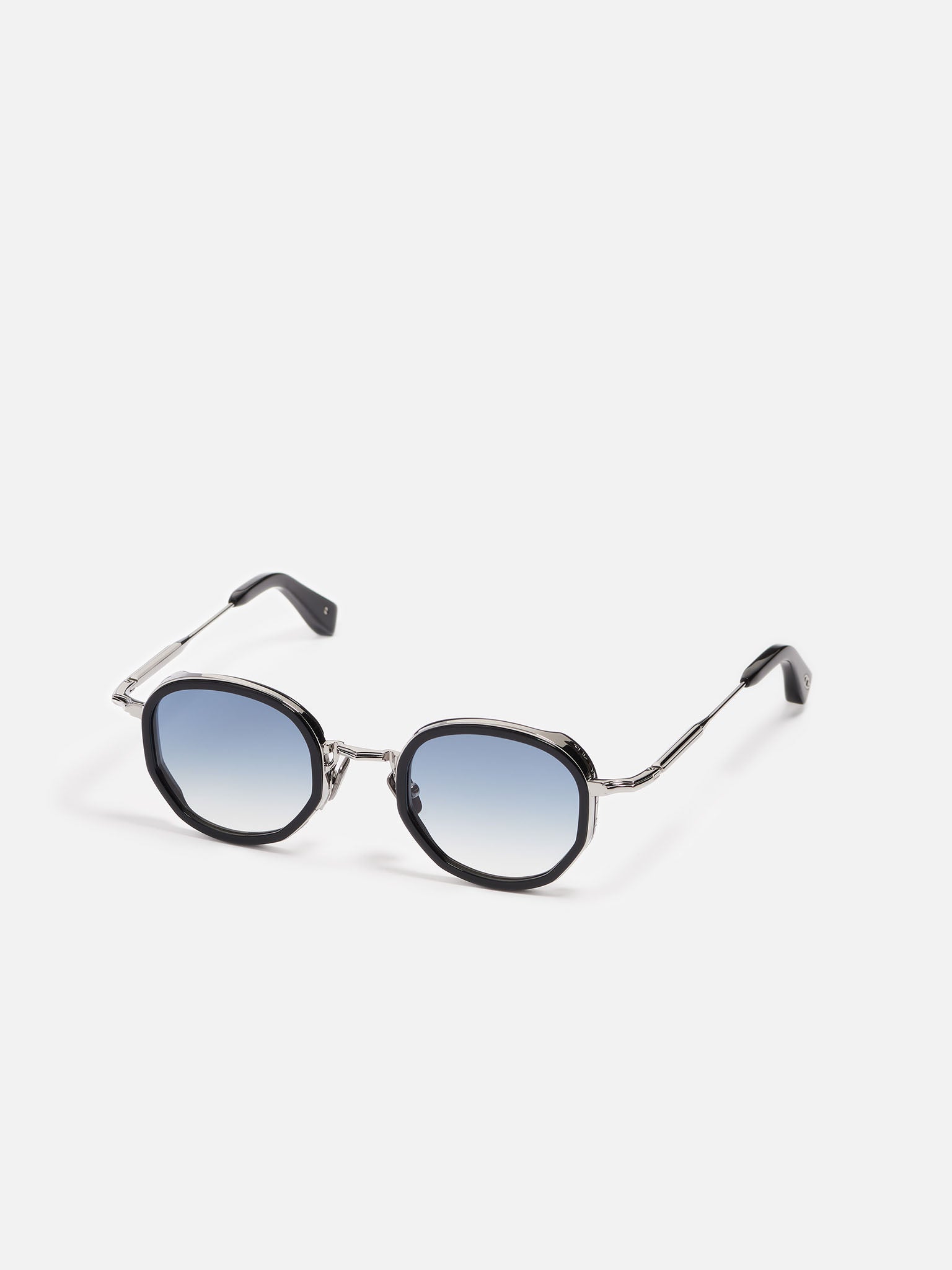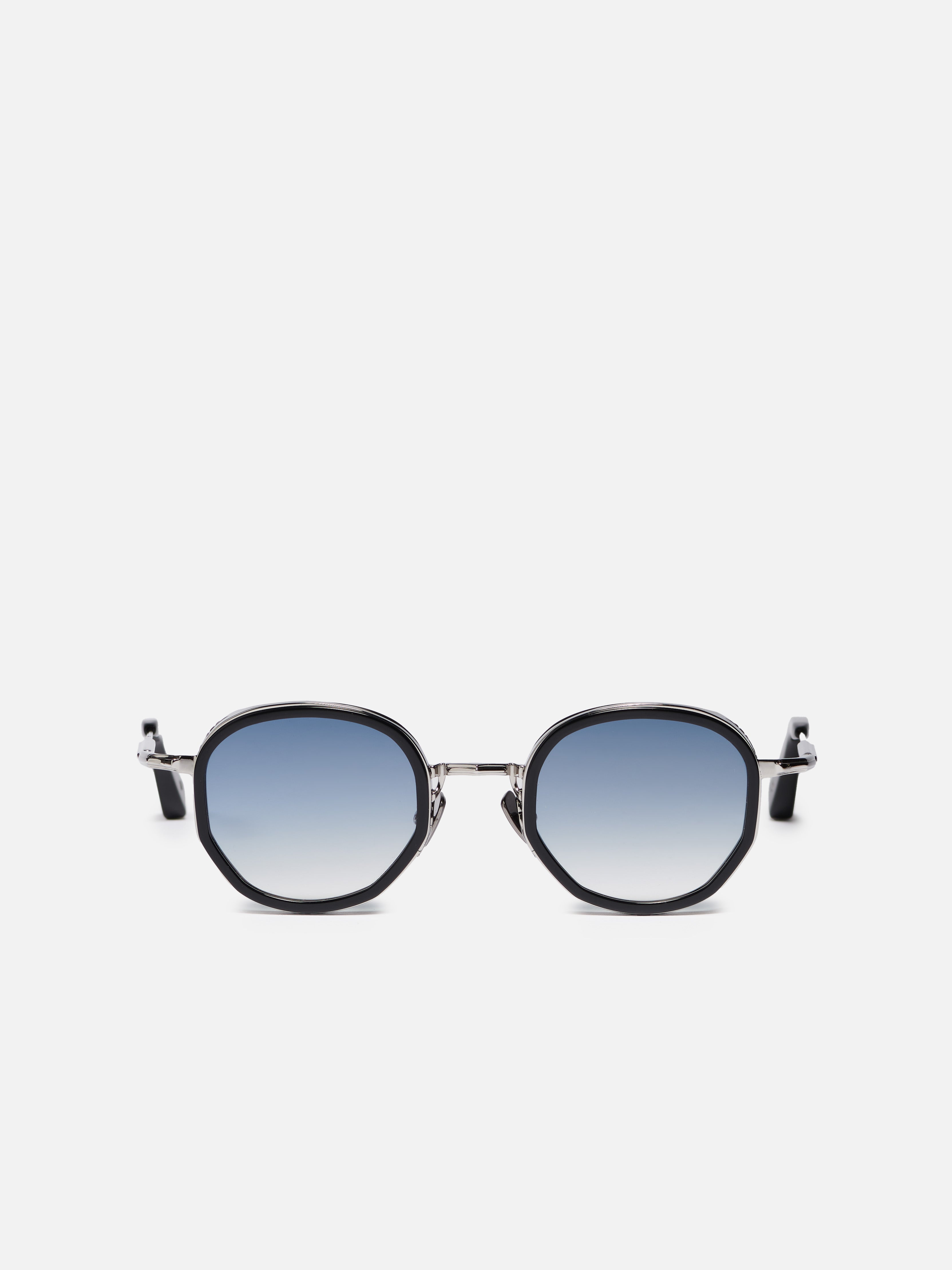 La monture est en acier inoxydable plaqué ruthénium (3 µ). Les embouts de branches et le pourtour des yeux sont en acétate noir. Les verres CR39 bleu clair dégradé sont traités antireflet (AR) sur la face interne.
