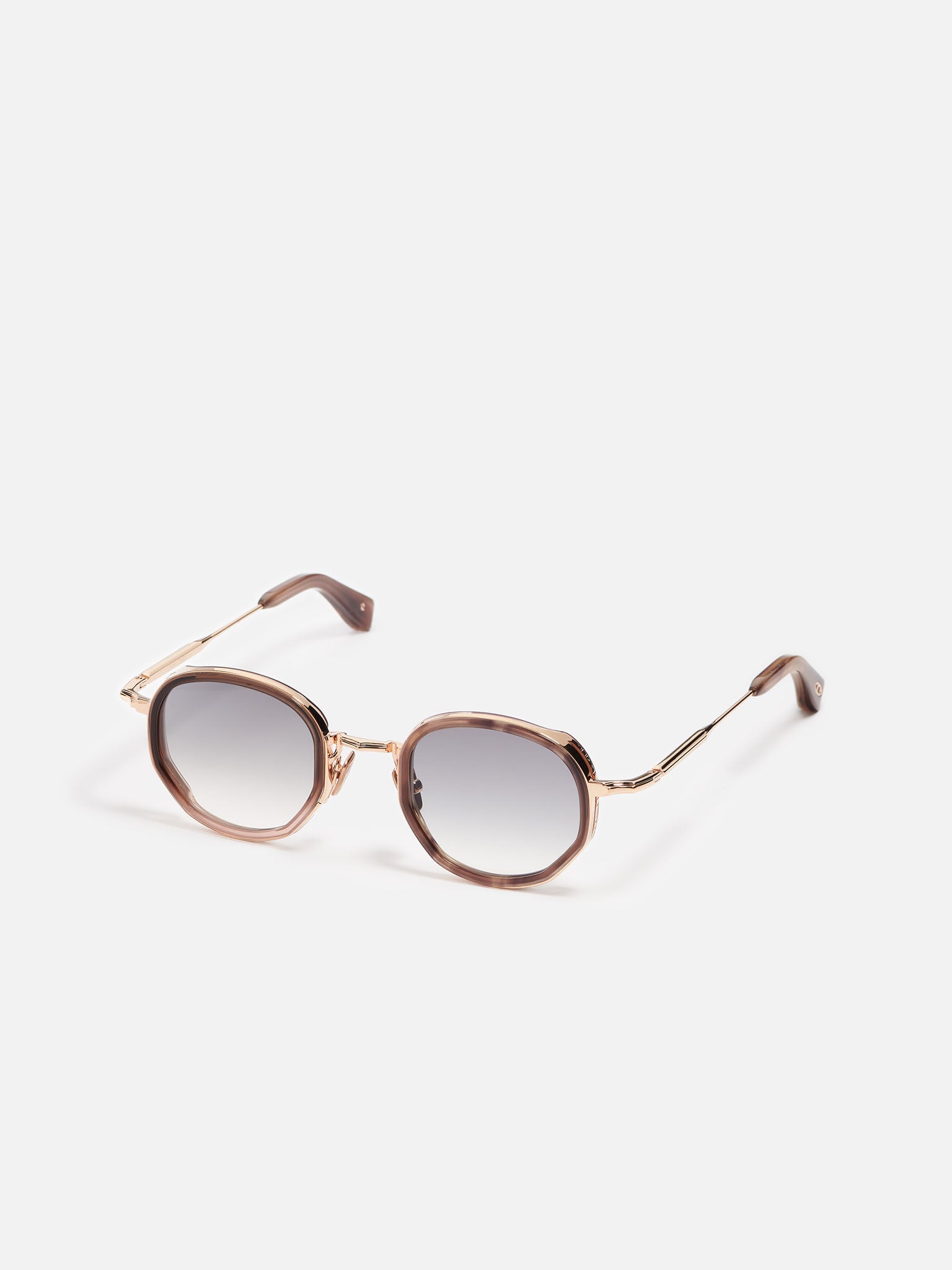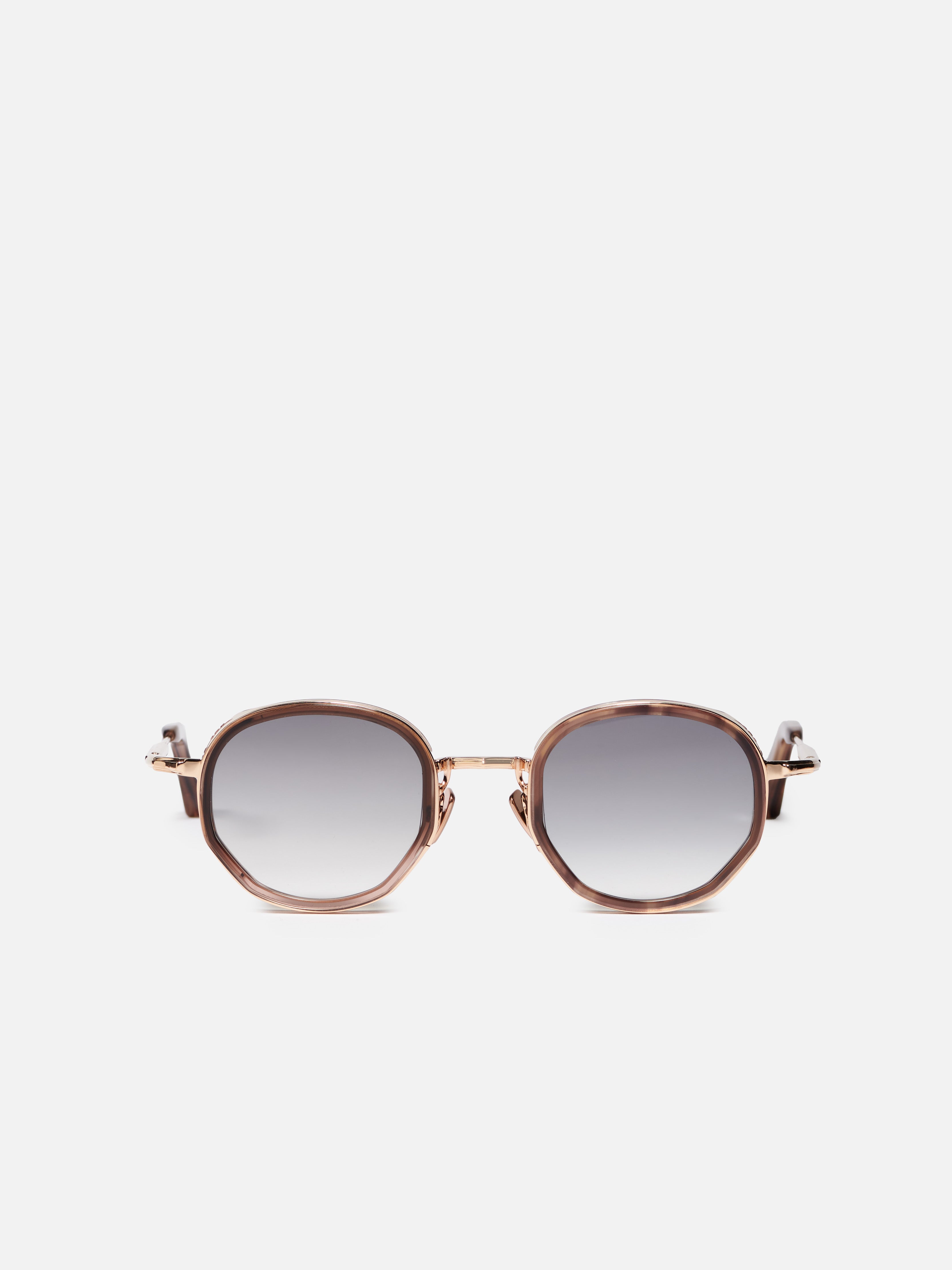 La monture est en acier inoxydable plaqué or rose (5 microns, poinçonné à l'intérieur de la branche). Les embouts de branches et le contour des yeux sont en acétate écaille marron.