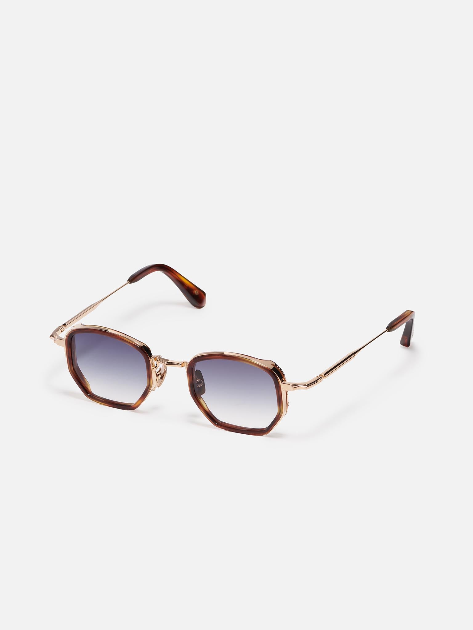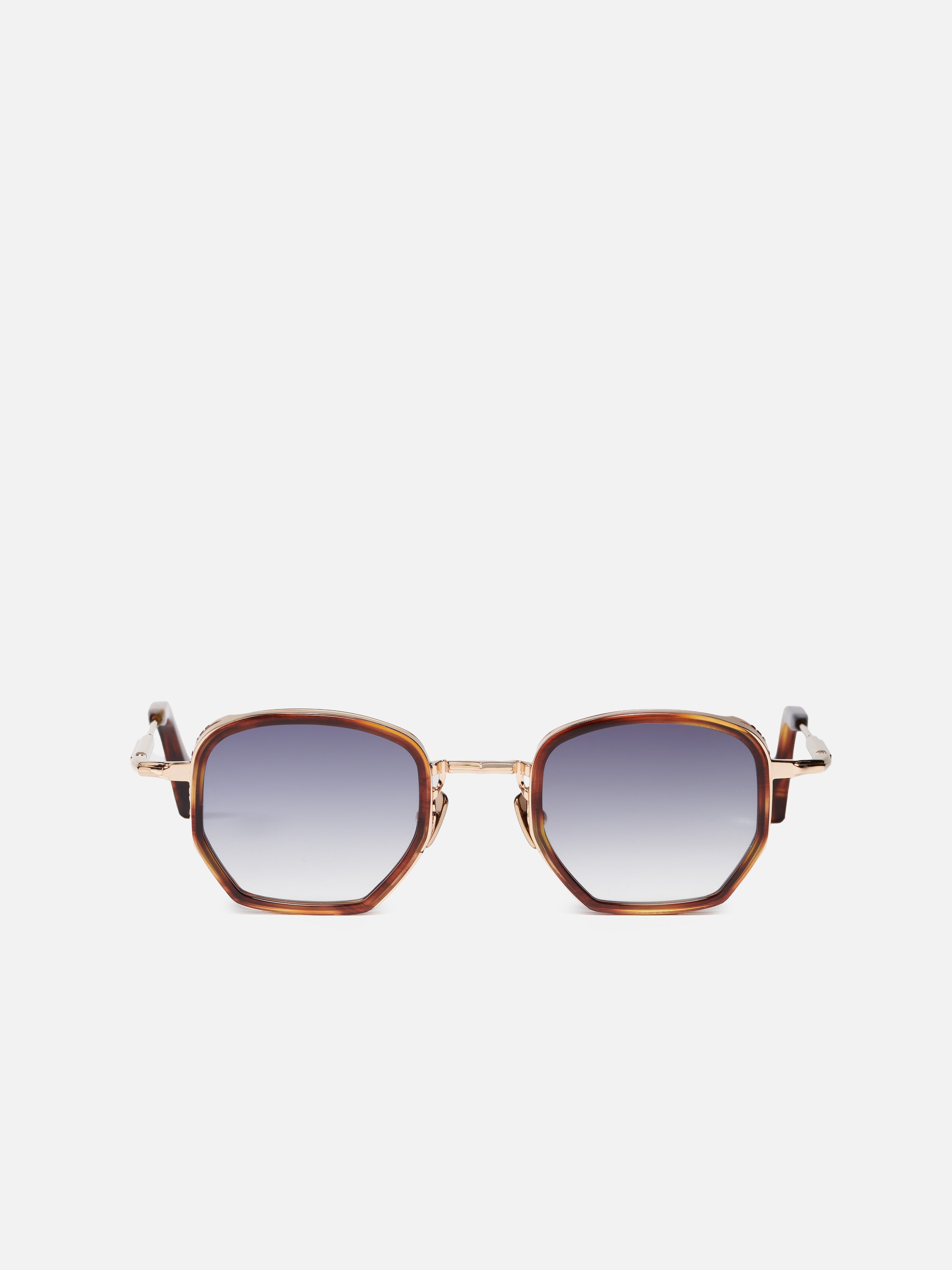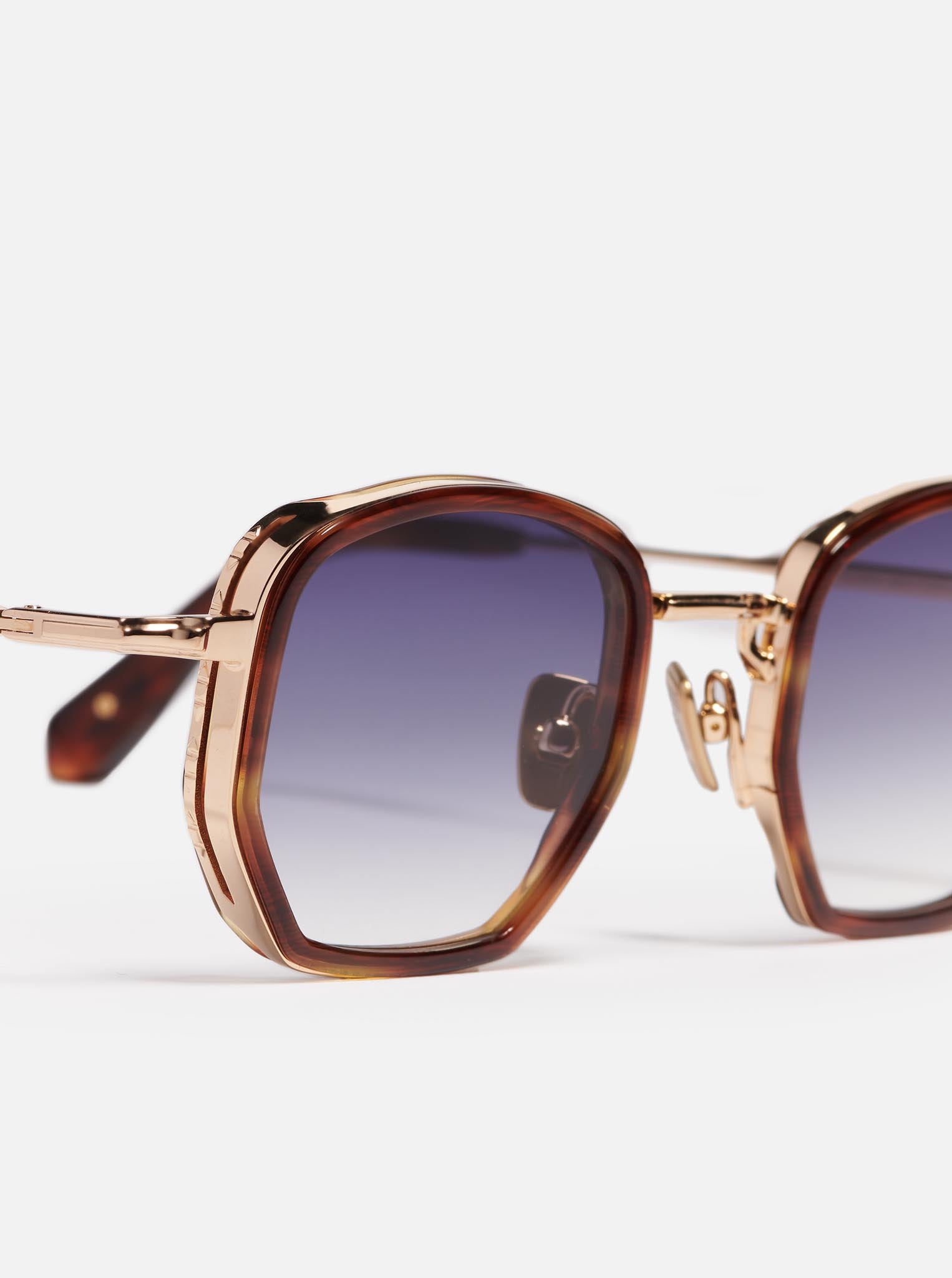 La monture est en acier inoxydable plaqué or vieilli (5 microns, poinçonné à l'intérieur de la branche). Les embouts de branches et le contour des yeux sont en acétate couleur cognac.