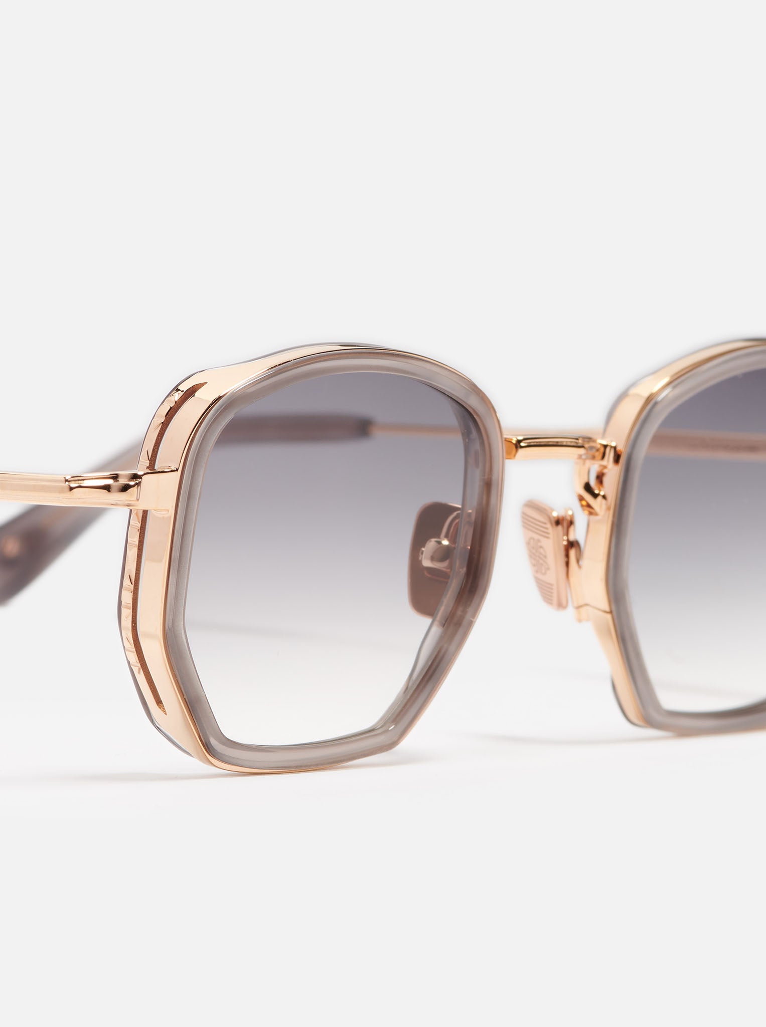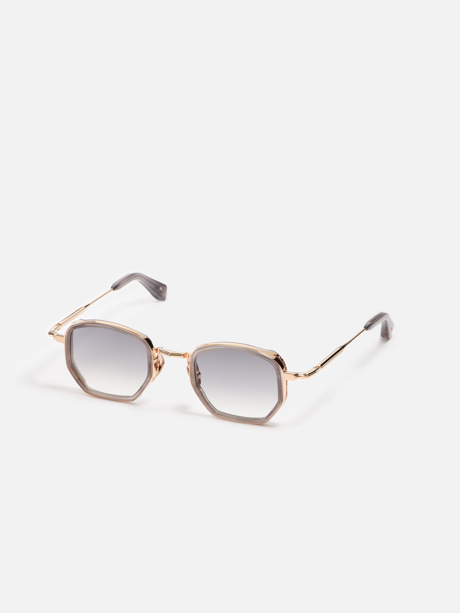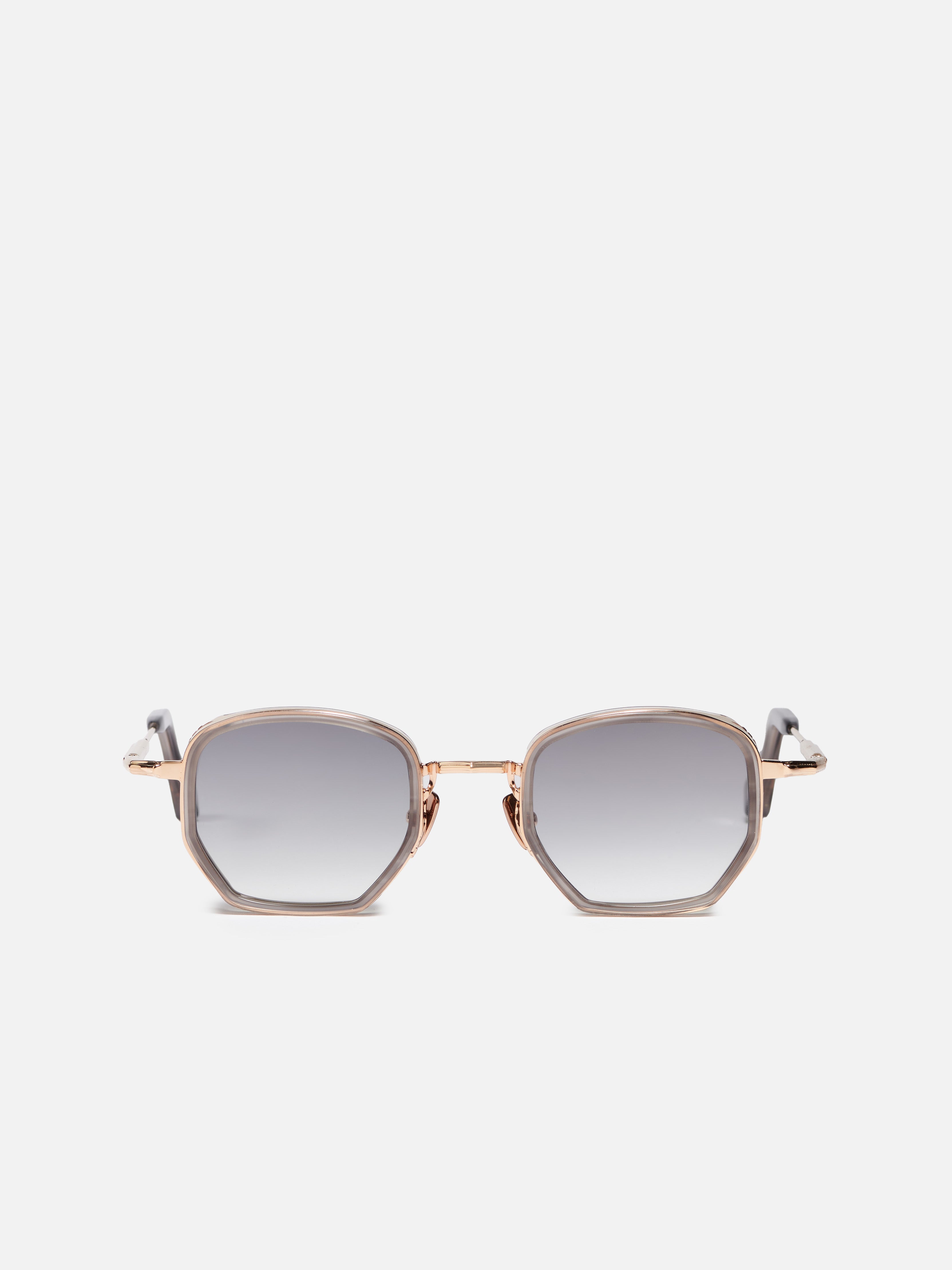 La monture est en acier inoxydable plaqué or rose (5 microns, poinçonné à l'intérieur de la branche). Les embouts de branches et le contour des yeux sont en acétate gris.