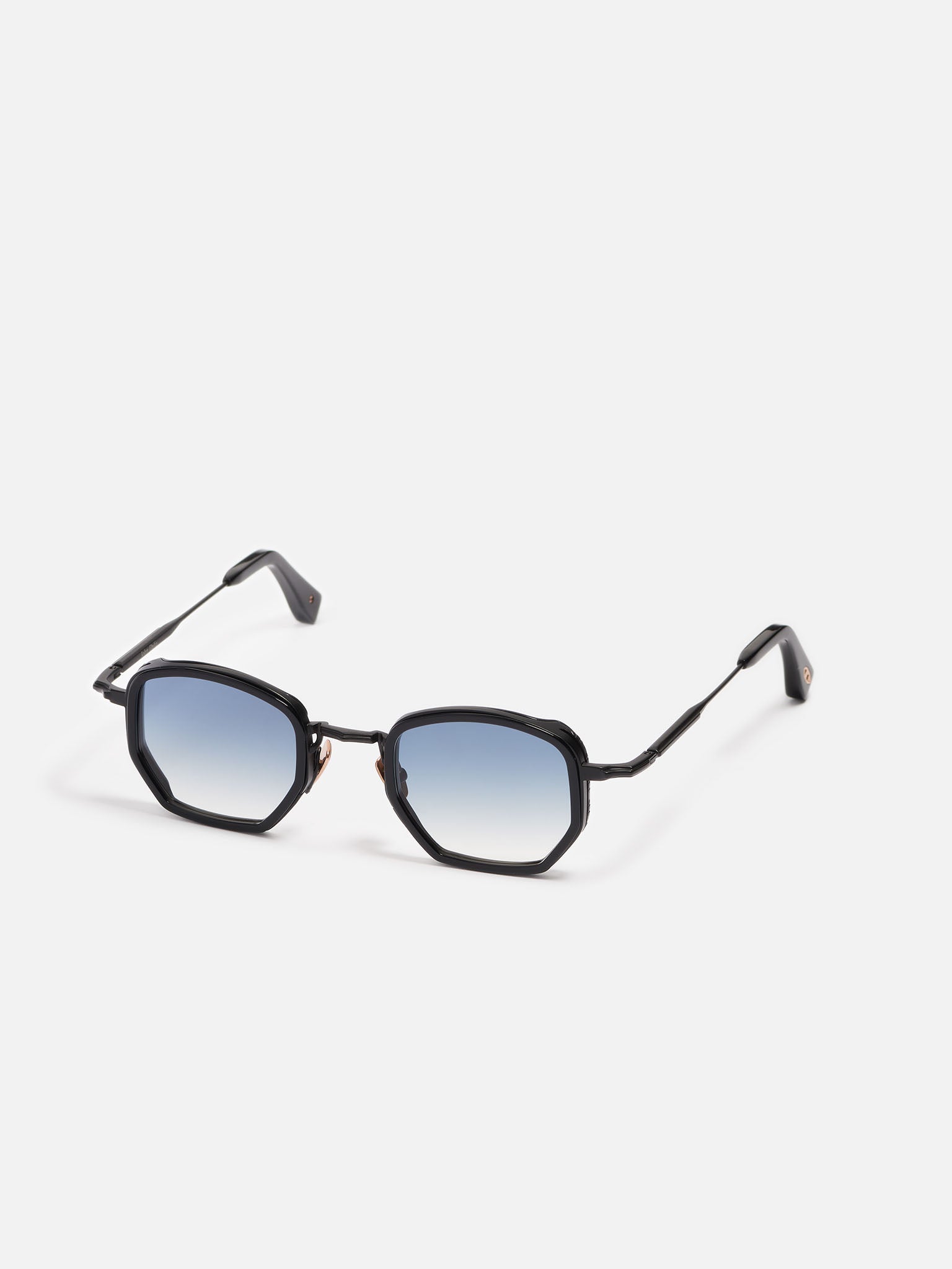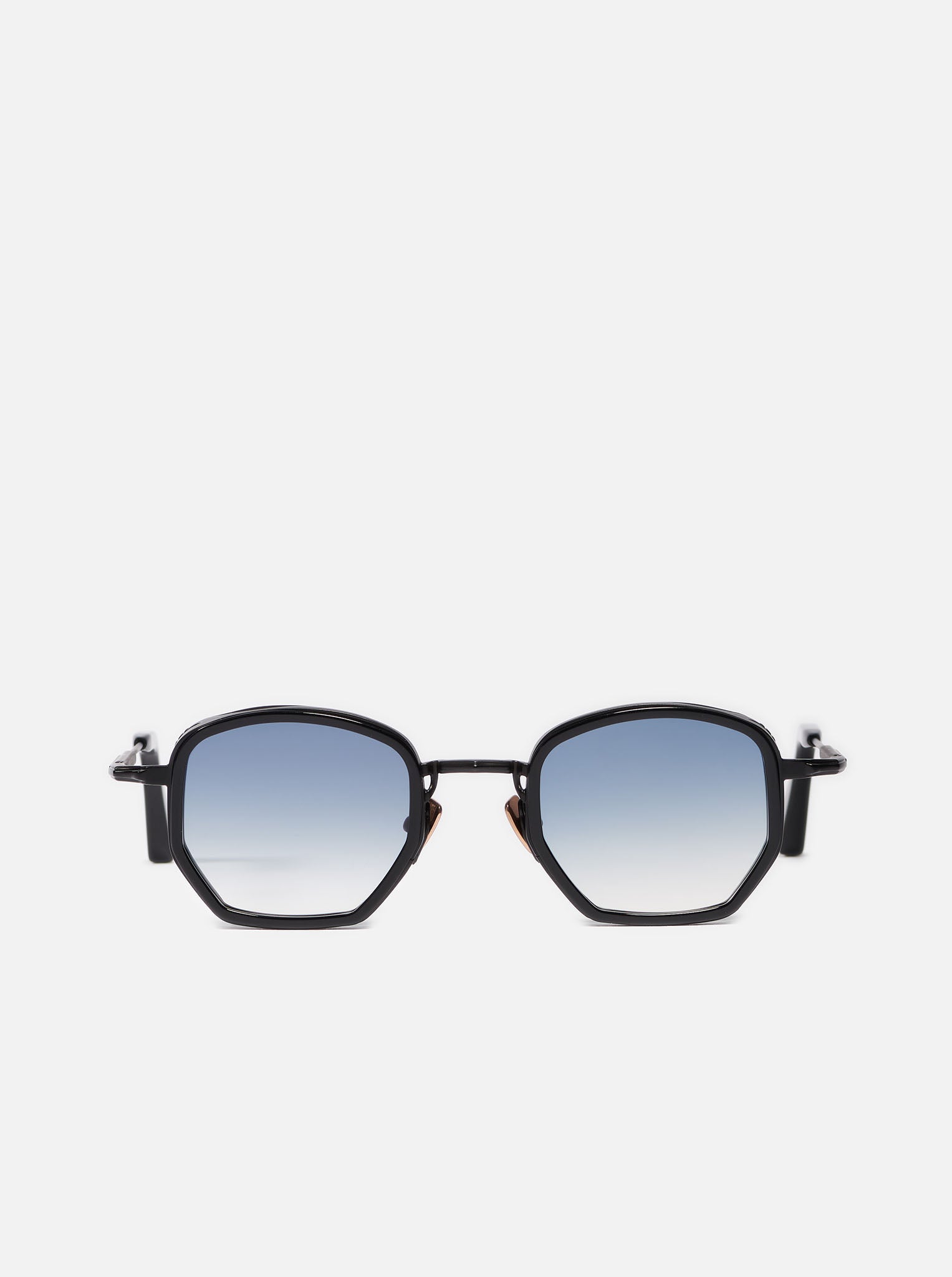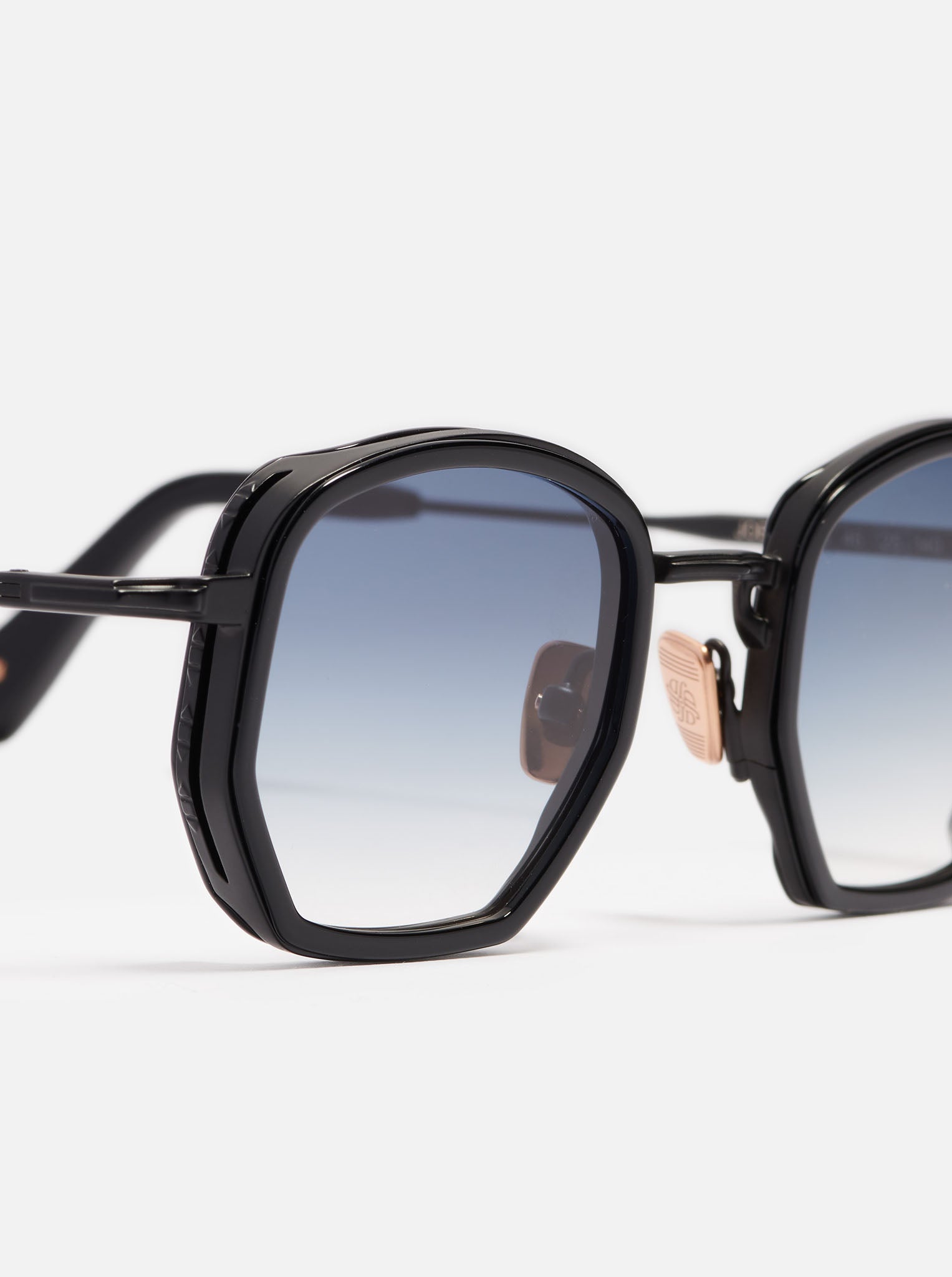 La monture est en acier inoxydable avec une finition carbone. Les embouts de branches et le contour des yeux sont en acétate noir infini.