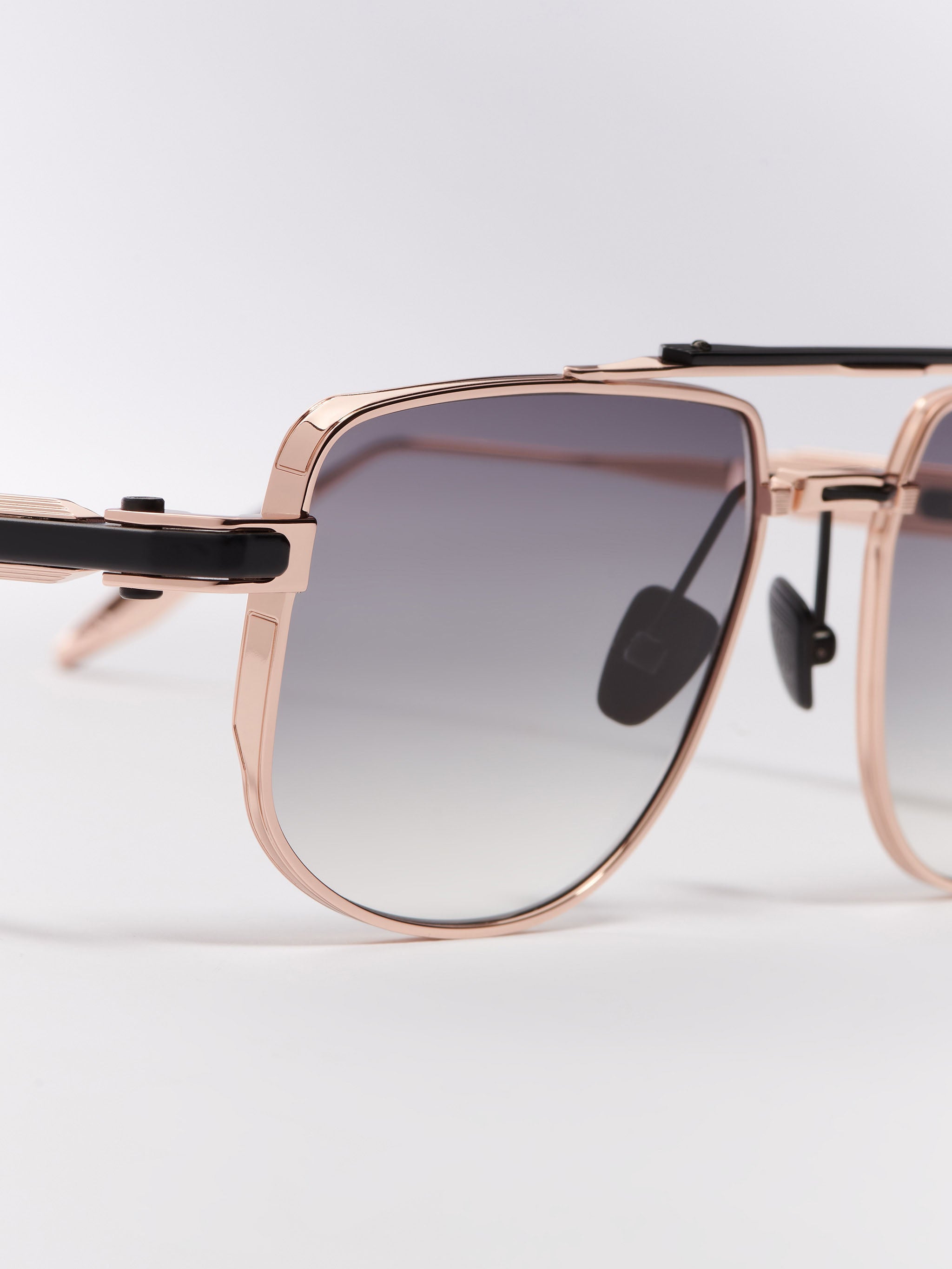 The temples extend seamlessly into sculpted metal end tips, conceived as a natural continuation of the architecture. With subtle variations in thickness and finely striated finishes, the temples highlight the distinctive character of the design.