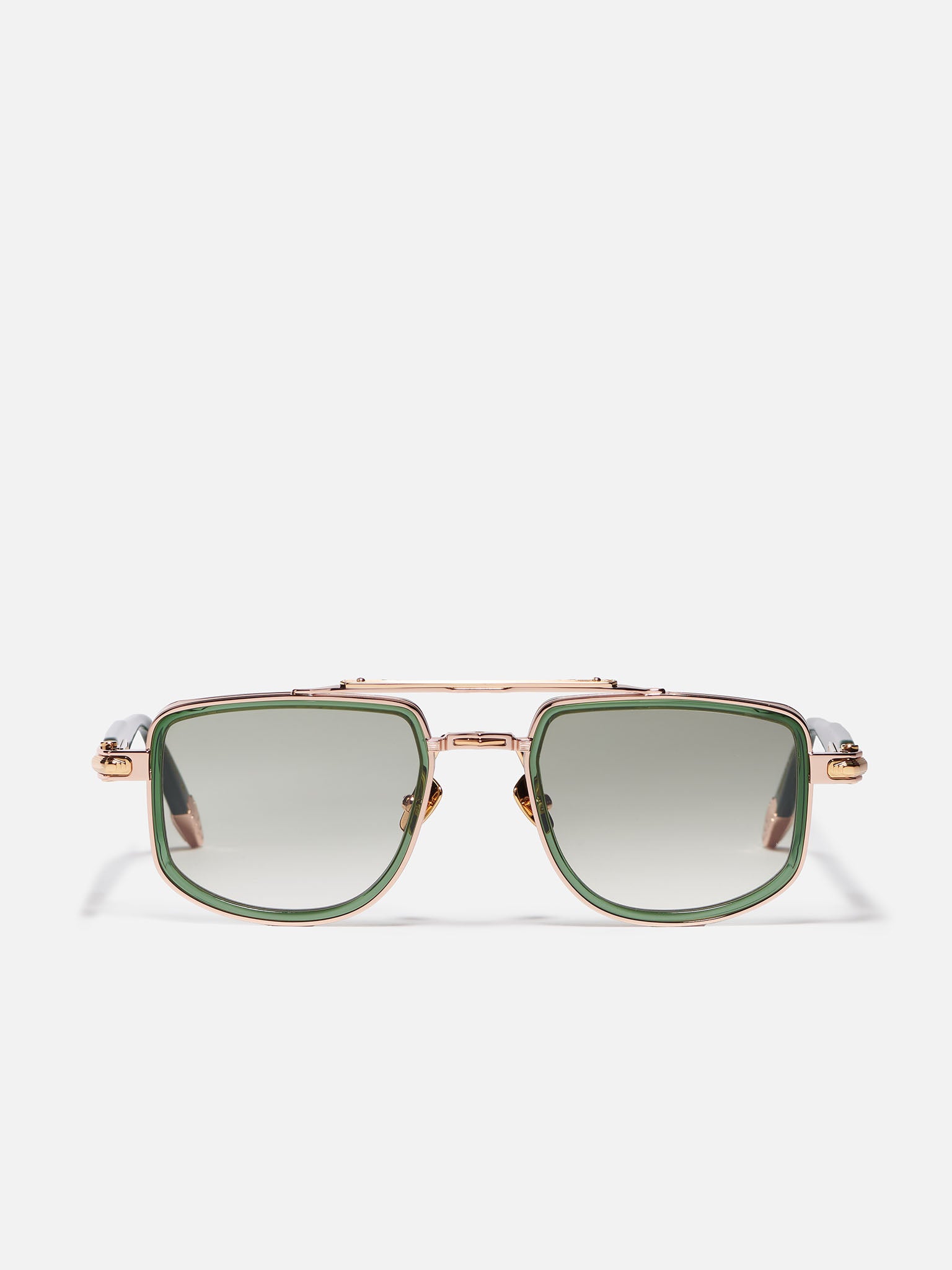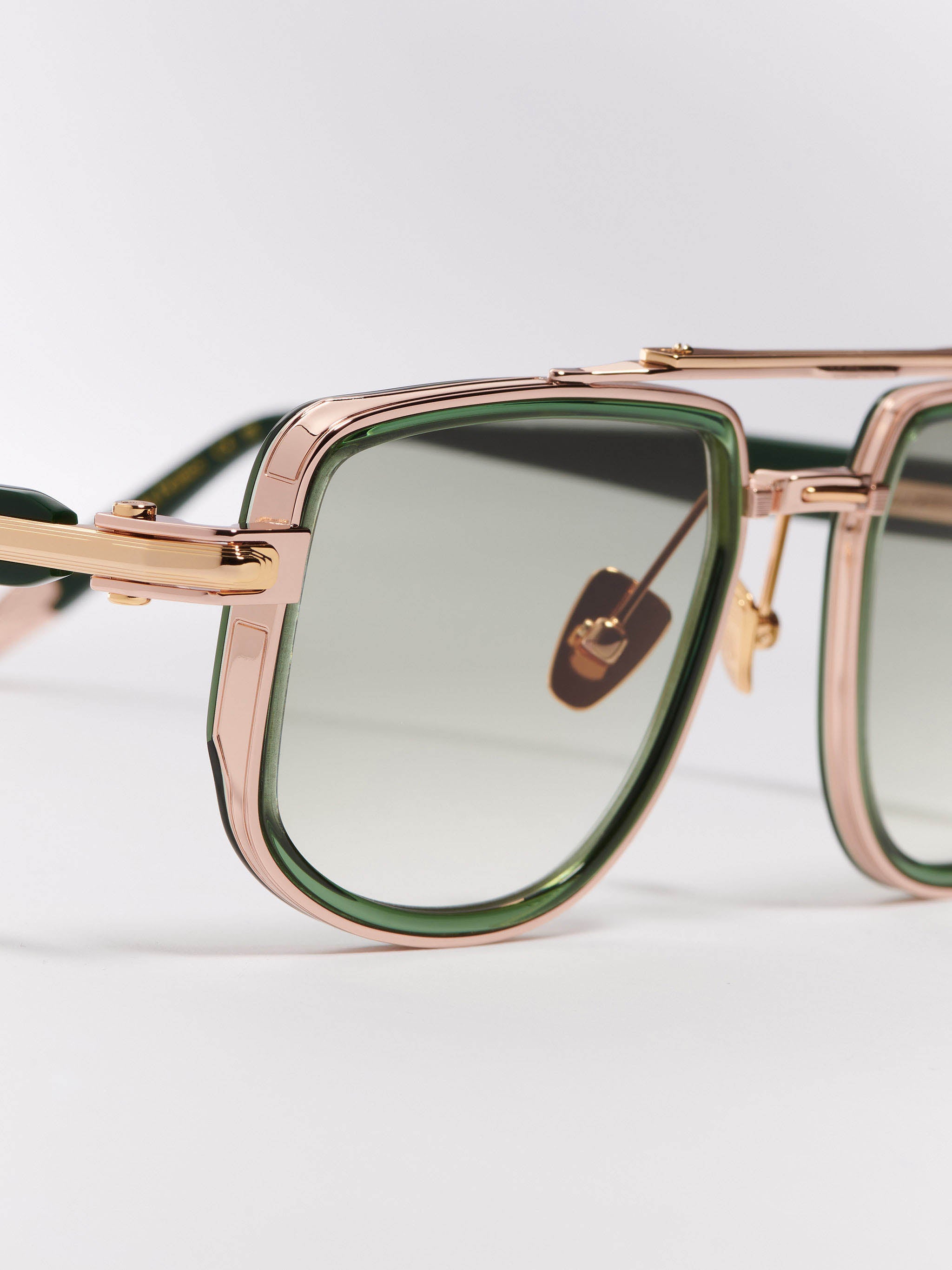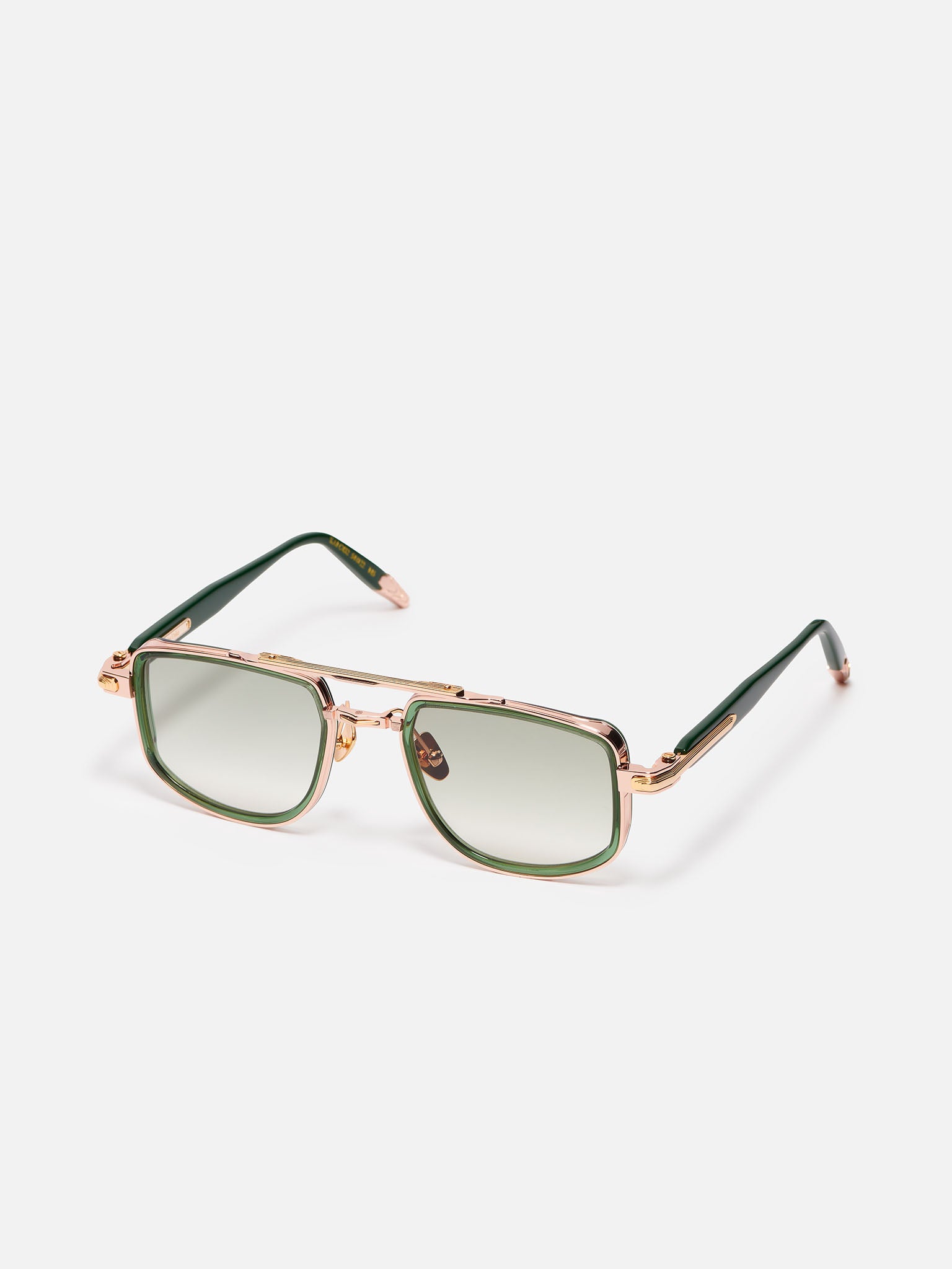 Rose gold titanium corewire structure with antic gold plated decorative elements (5µ, with a jeweler’s hallmark inside the temple). The temple tips and rims are crafted from Dark green translucid.
