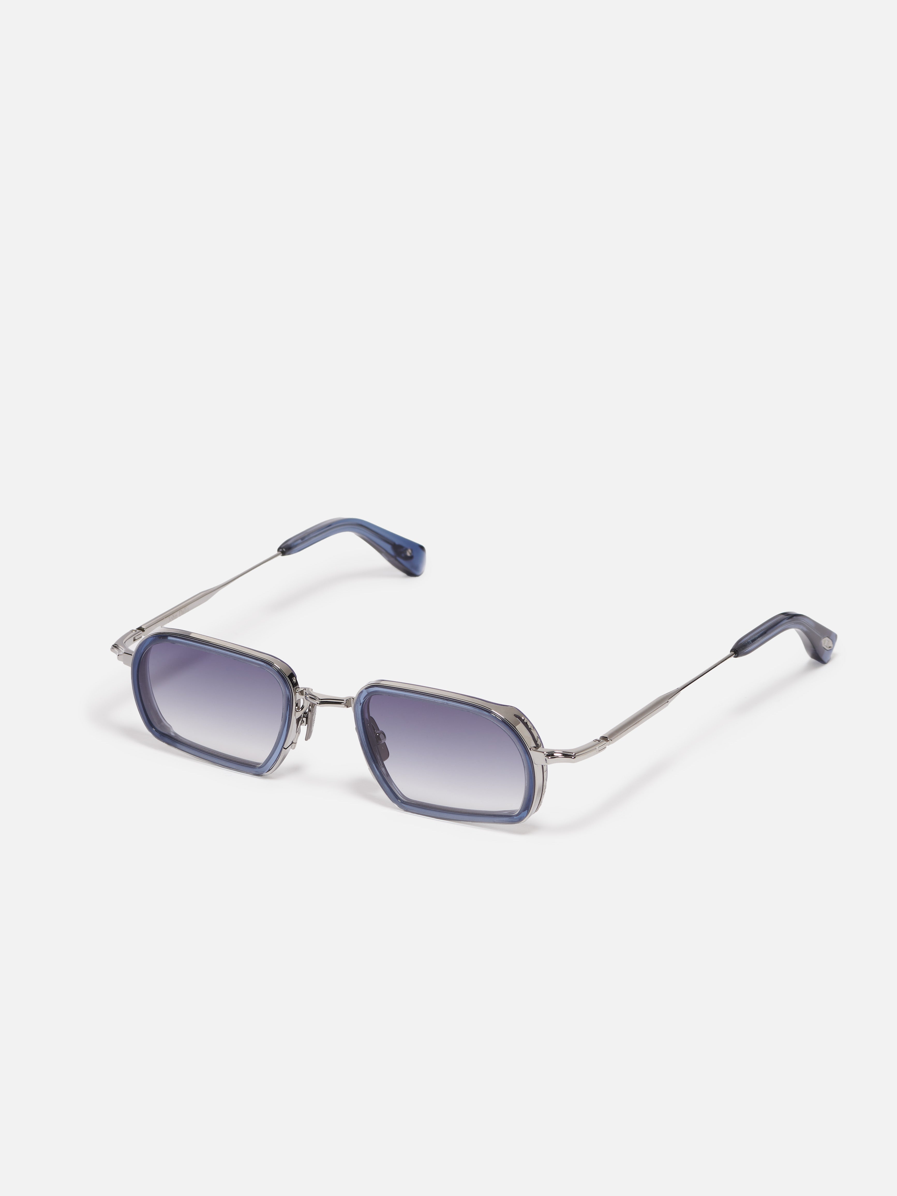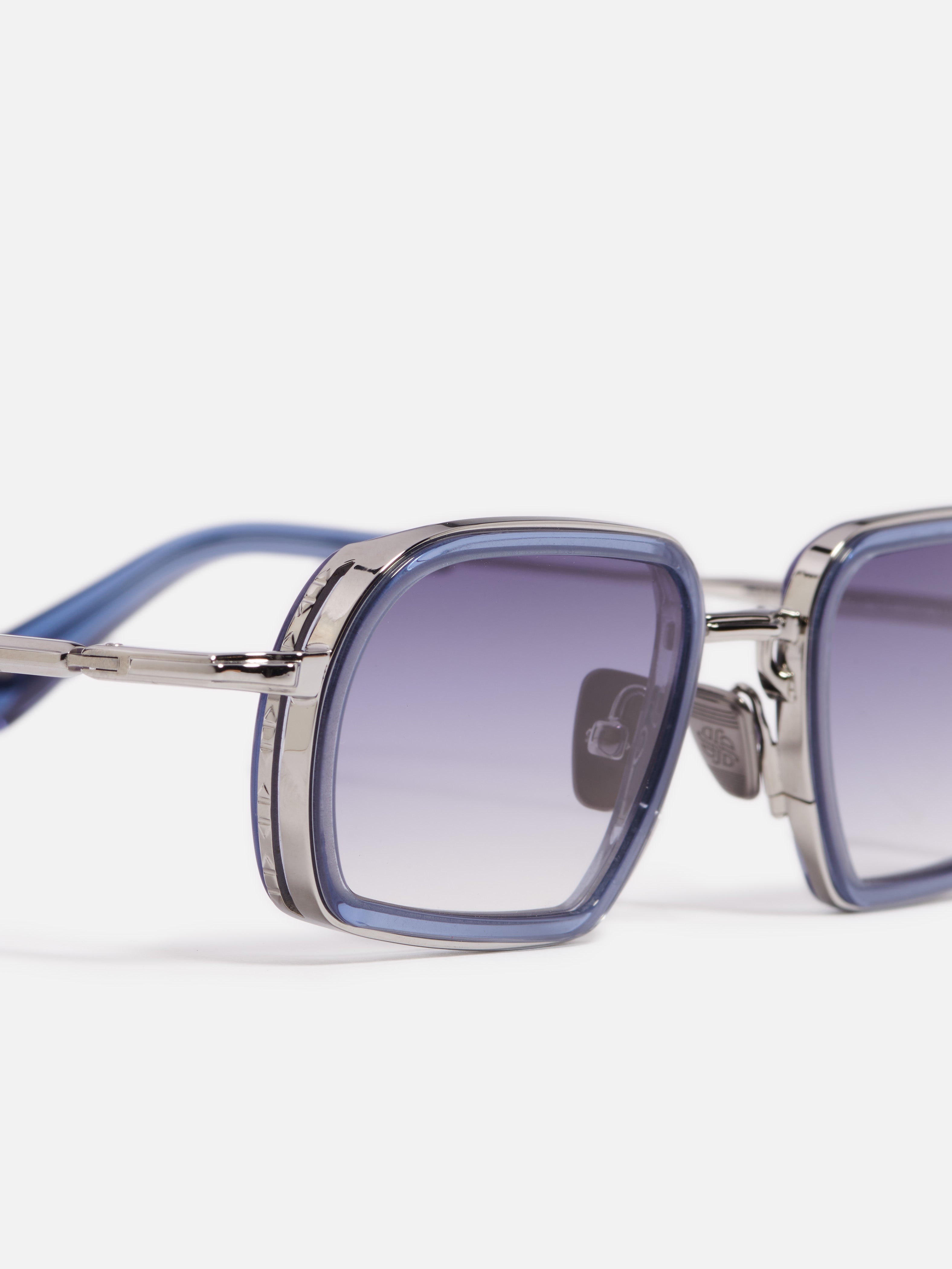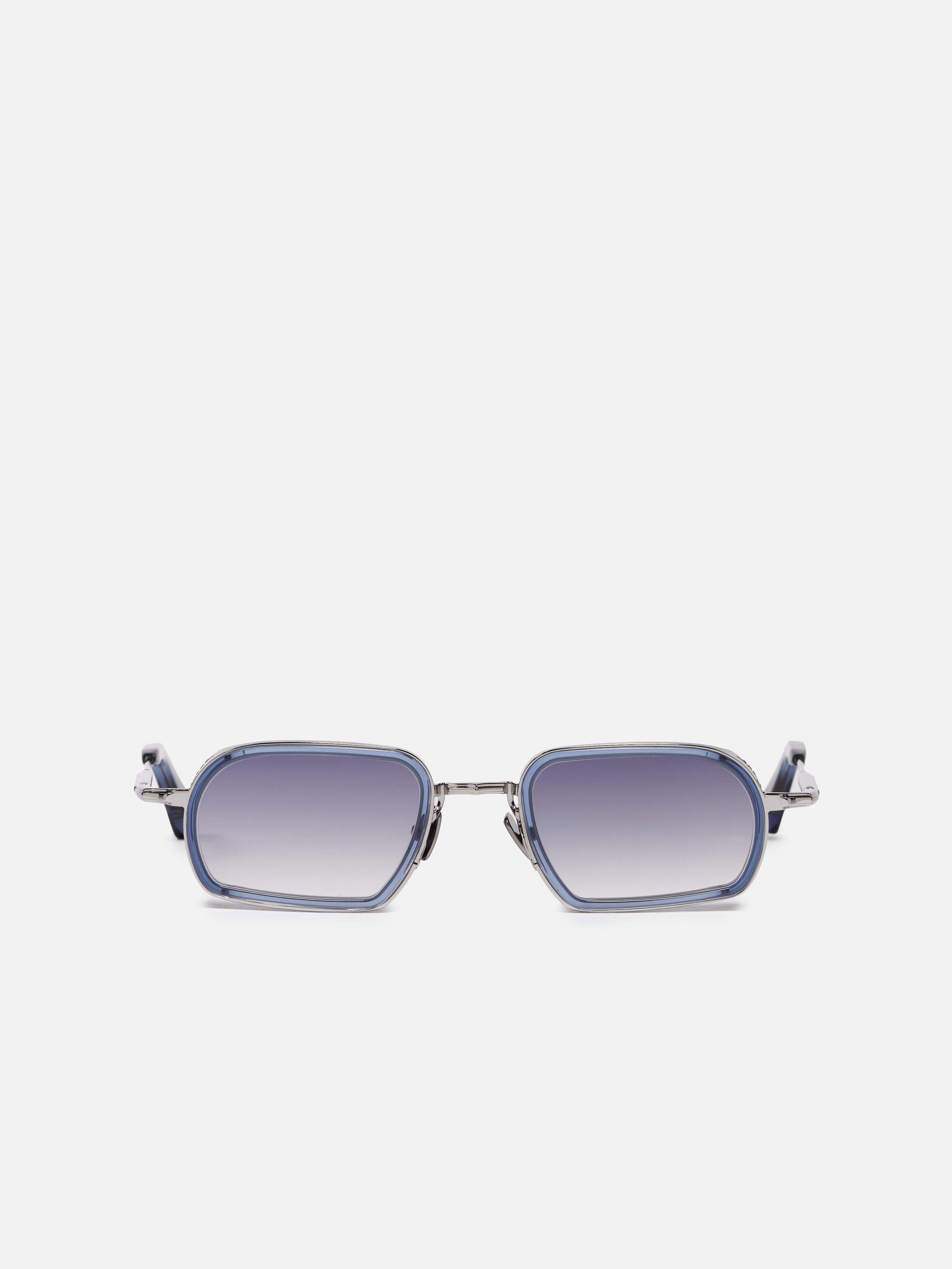 L'armature métallique est constituée d'une monture en acier inoxydable plaquée ruthénium (3 µ). Les embouts de branches et le contour des yeux sont en acétate bleu translucide.