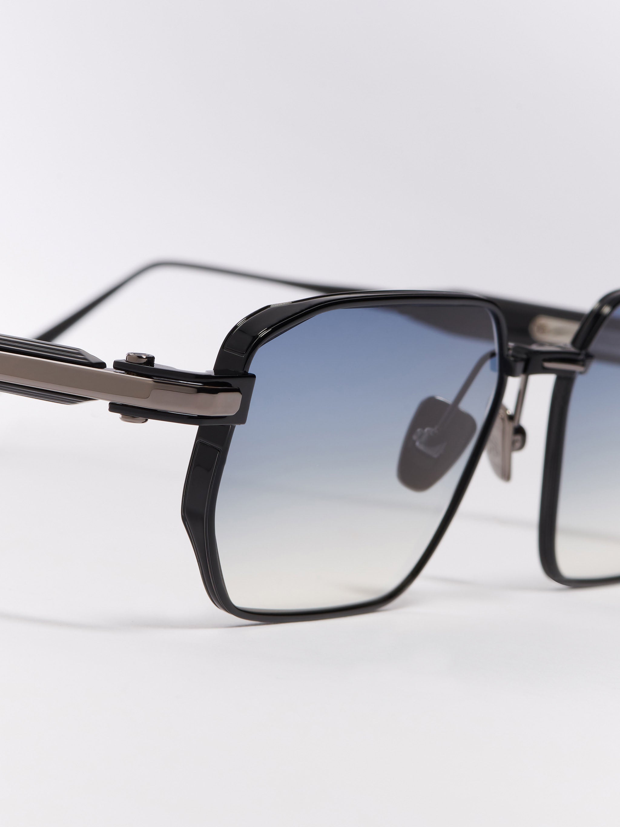 The temples extend seamlessly into sculpted metal end tips, conceived as a natural continuation of the architecture. With subtle variations in thickness and finely striated finishes, the temples highlight the distinctive character of the design.