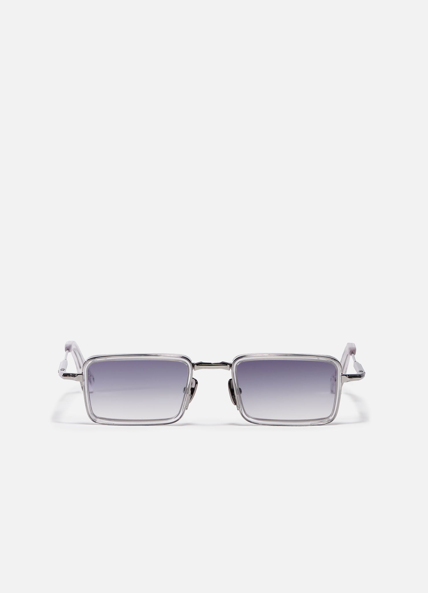 Unisex rectangular shaped frame combining a titanium corewere, metal details and acetate elements in a refined fusion of materials.