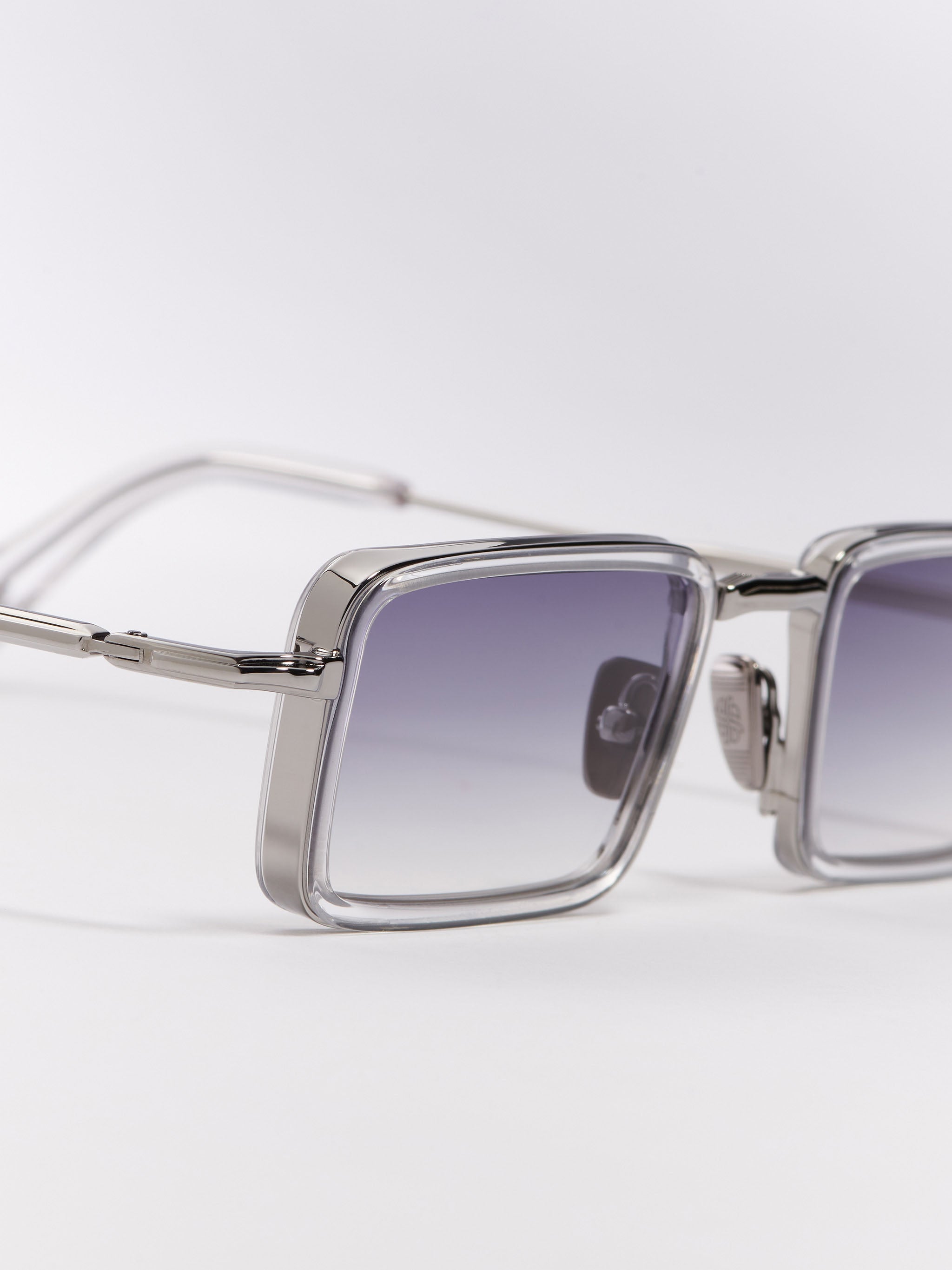 The acetate temples extend seamlessly into sculpted metal end tips, conceived as a natural continuation of the architecture. With subtle variations in thickness and finely striated finishes, the temples highlight the distinctive character of the design.