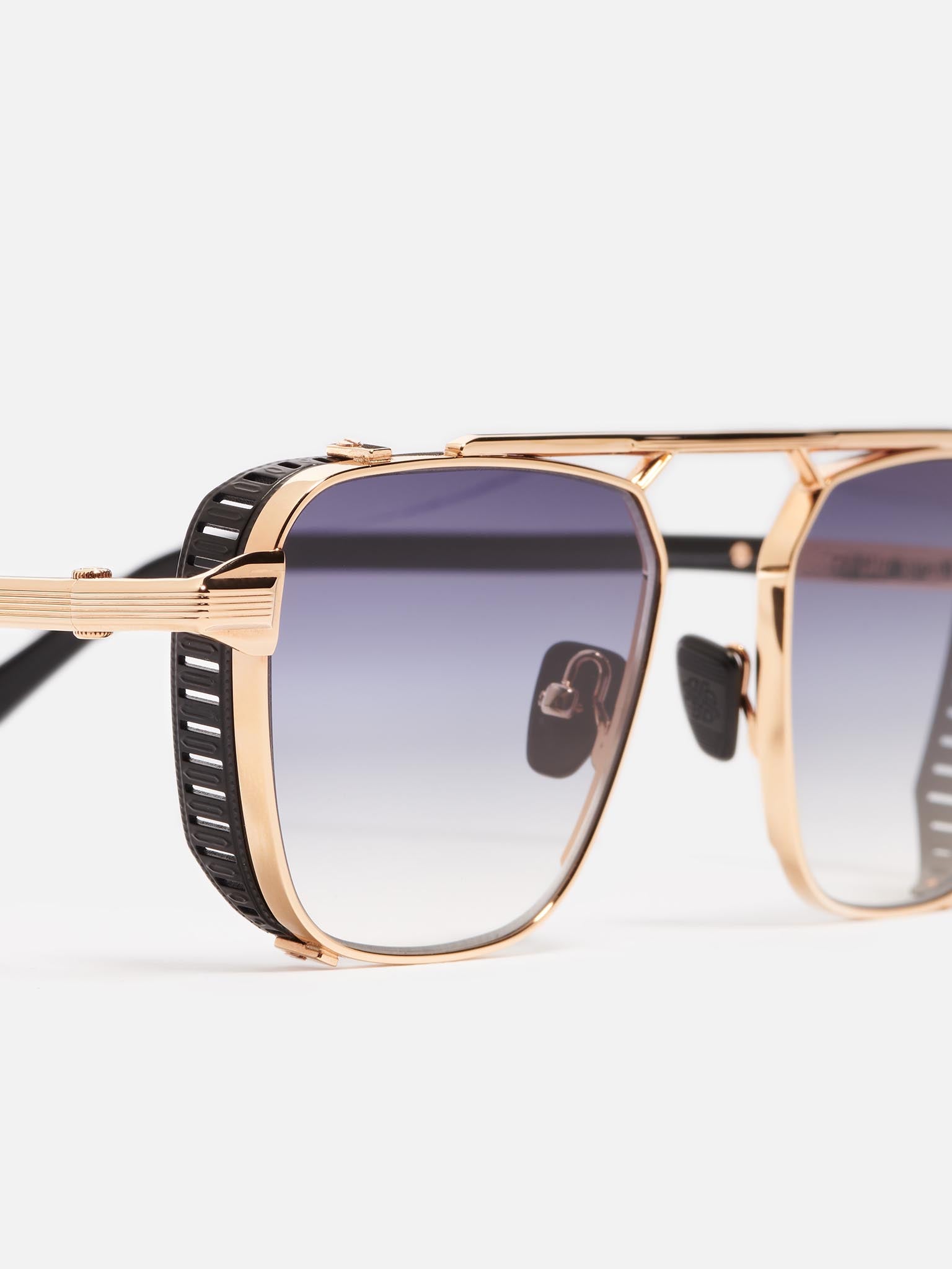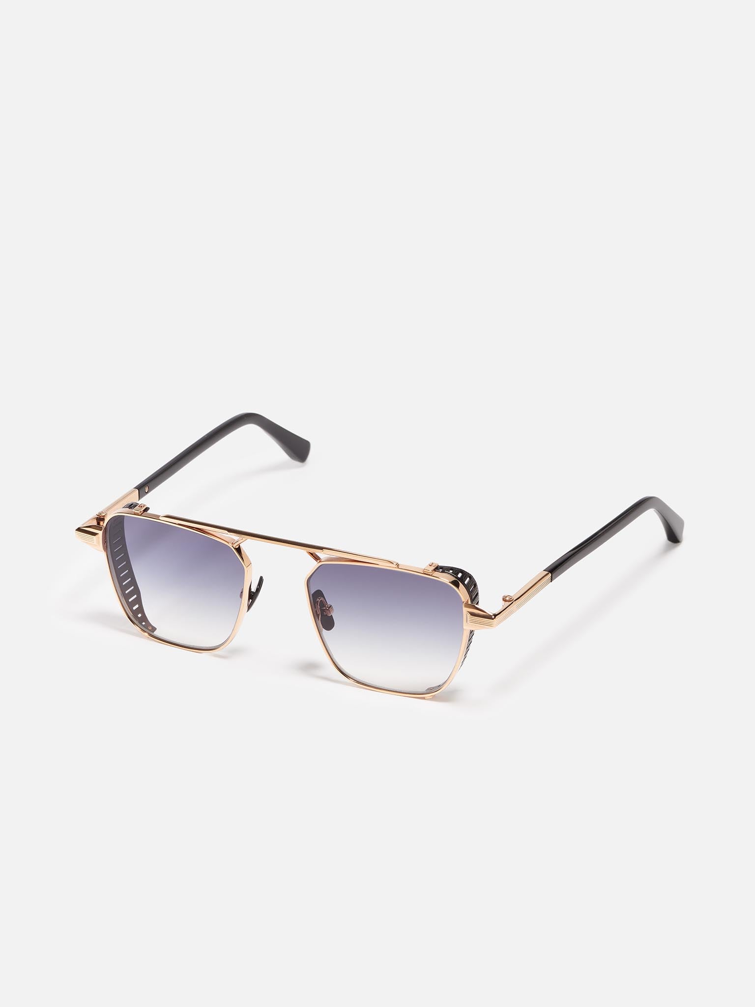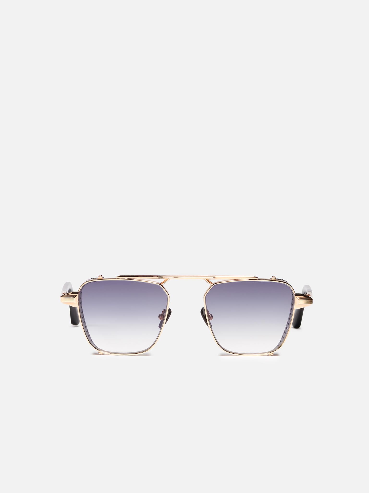 La monture est en acier inoxydable plaqué or rose (5 µ, avec poinçon de joaillier sur la branche intérieure). Coques latérales et plaquettes de nez noires effet carbone. Embouts de branches en acétate noir.